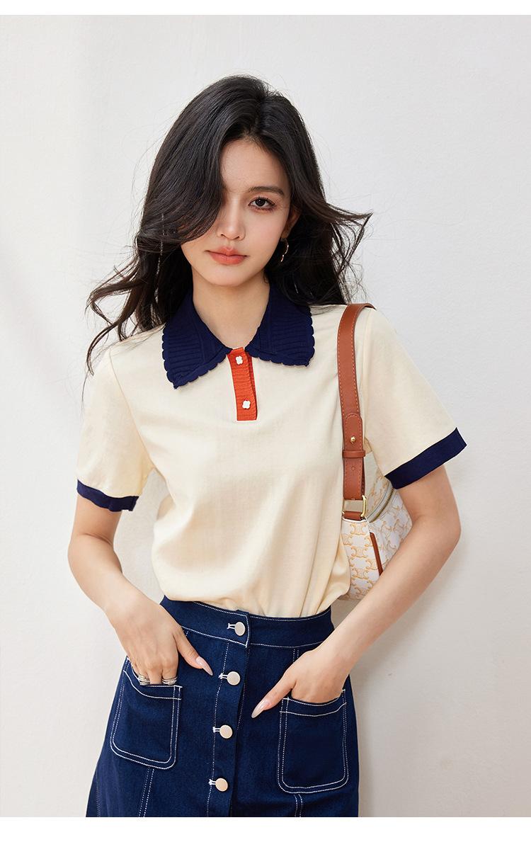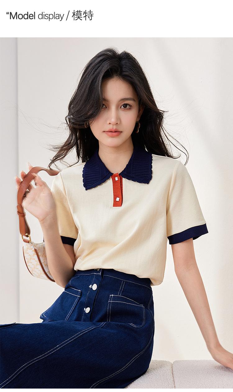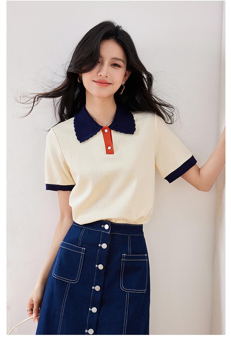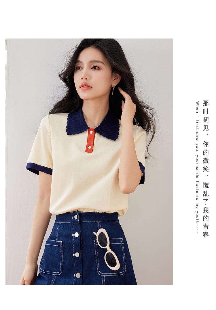 Camiseta tipo polo con contraste de color para mujer, diseño de moda coreana, solapa con costuras sensatas, manga corta, verano 2024