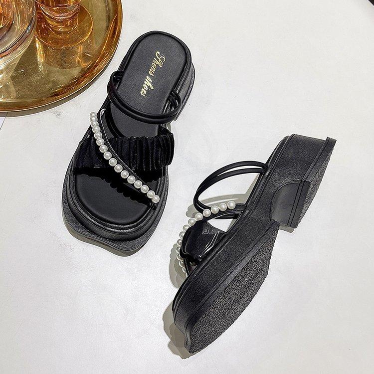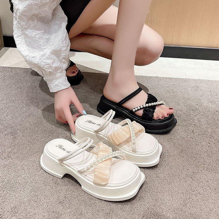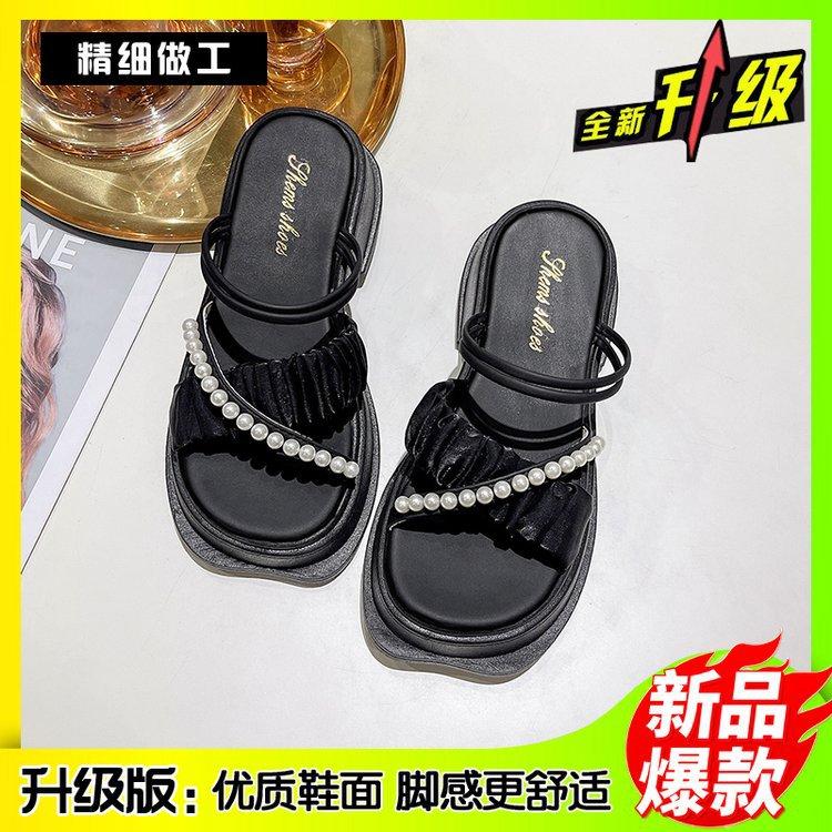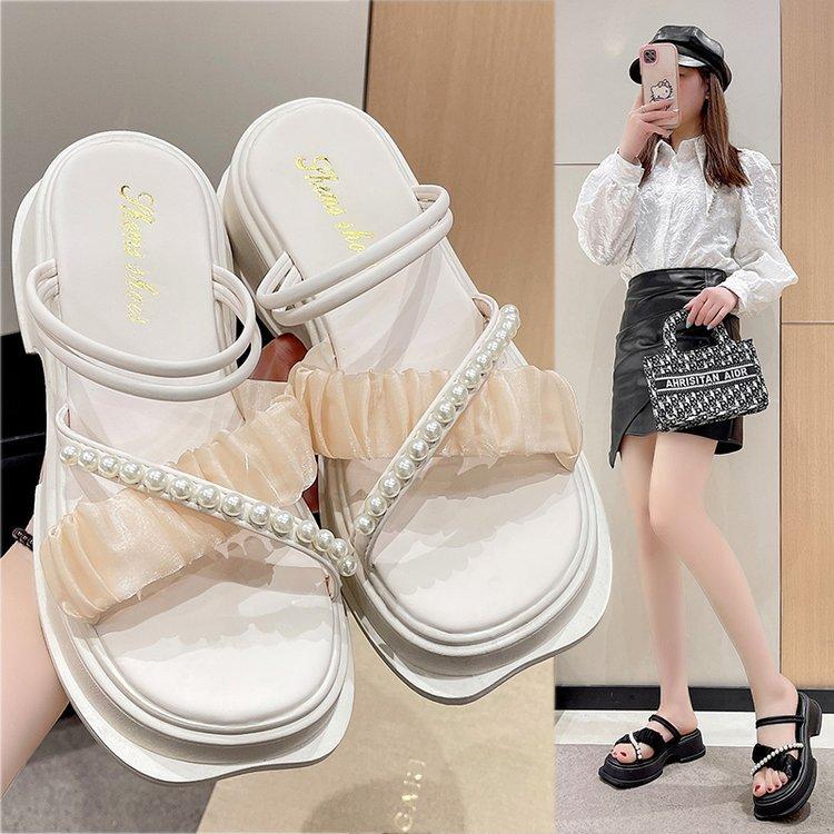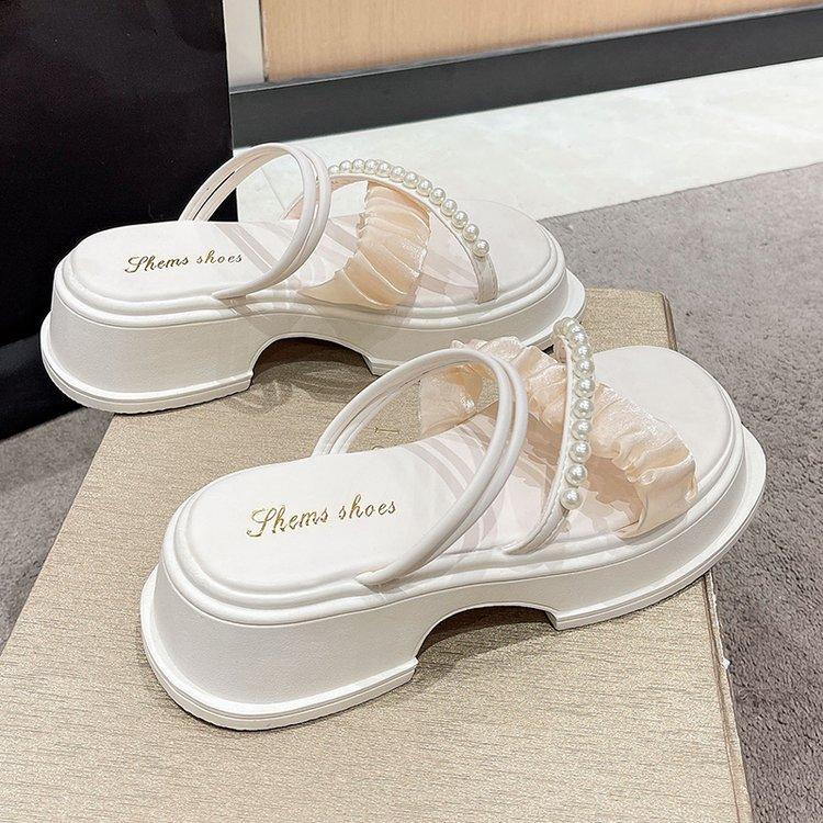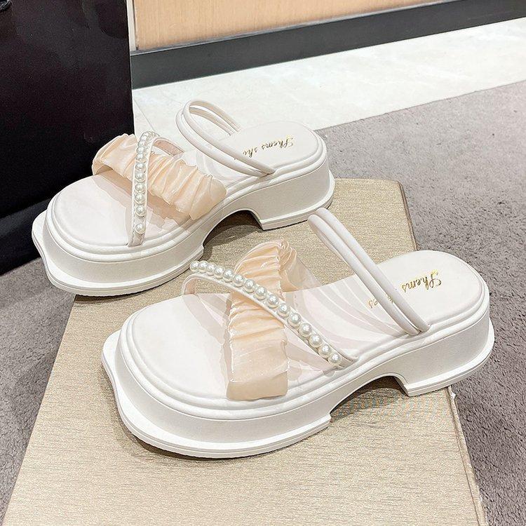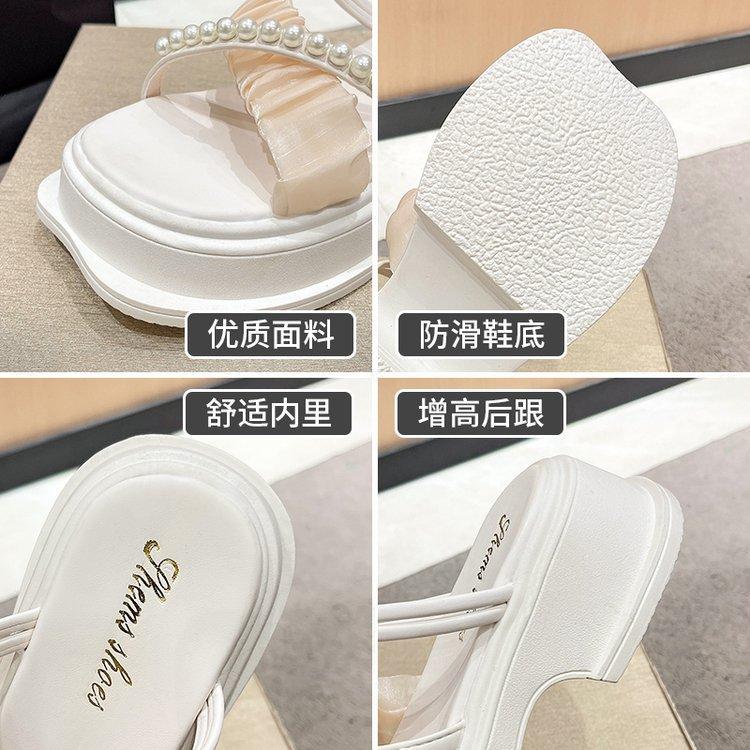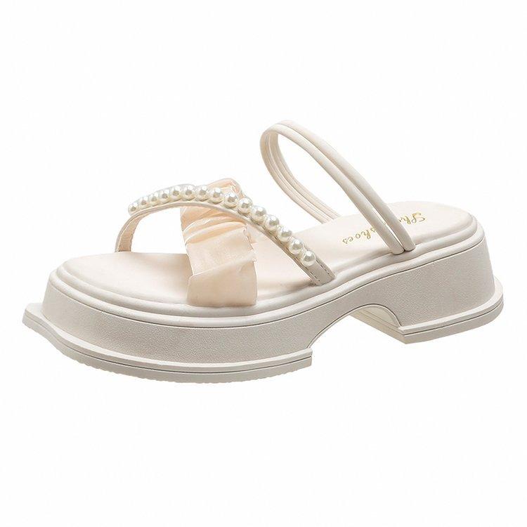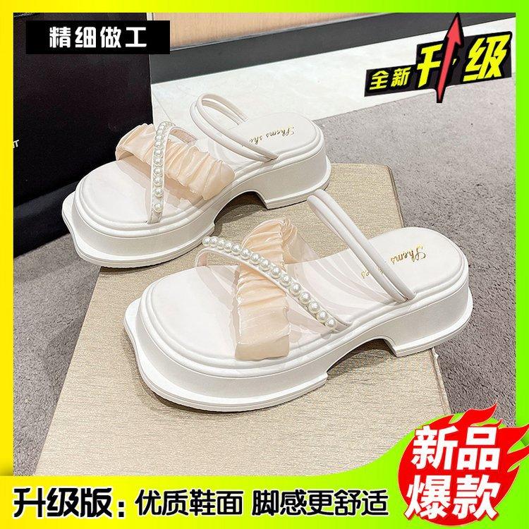 Sandalias y pantuflas de tacón grueso con diseño de hadas y perlas brillantes para mujer, zapatos informales para playa, novedad de verano de 2024.