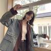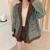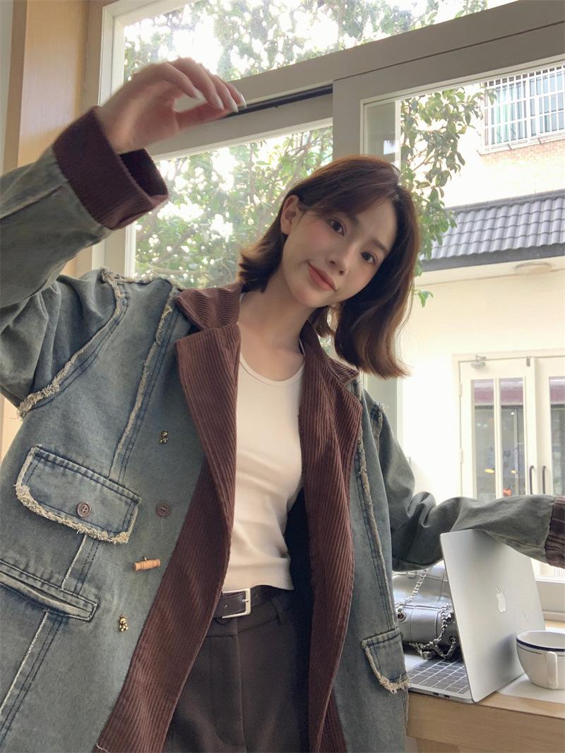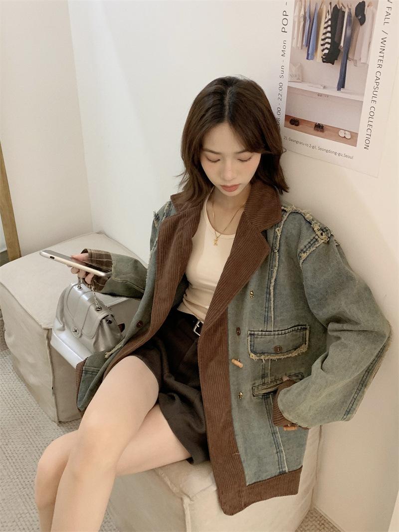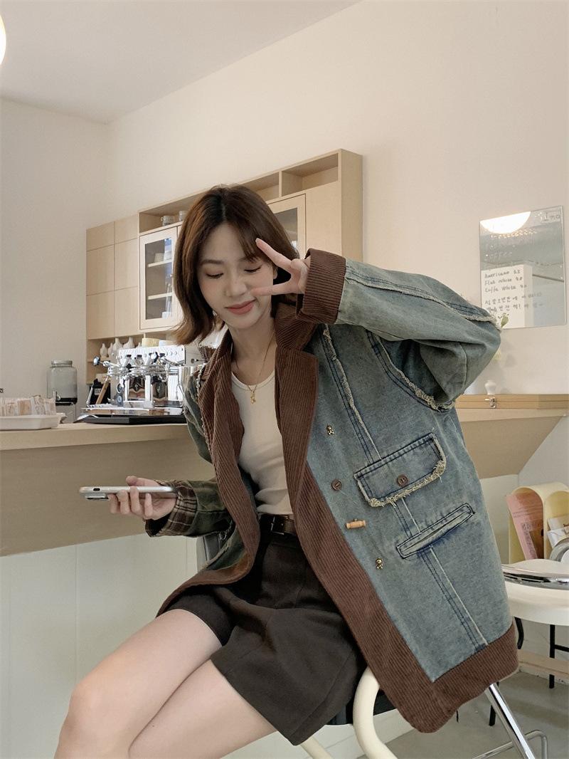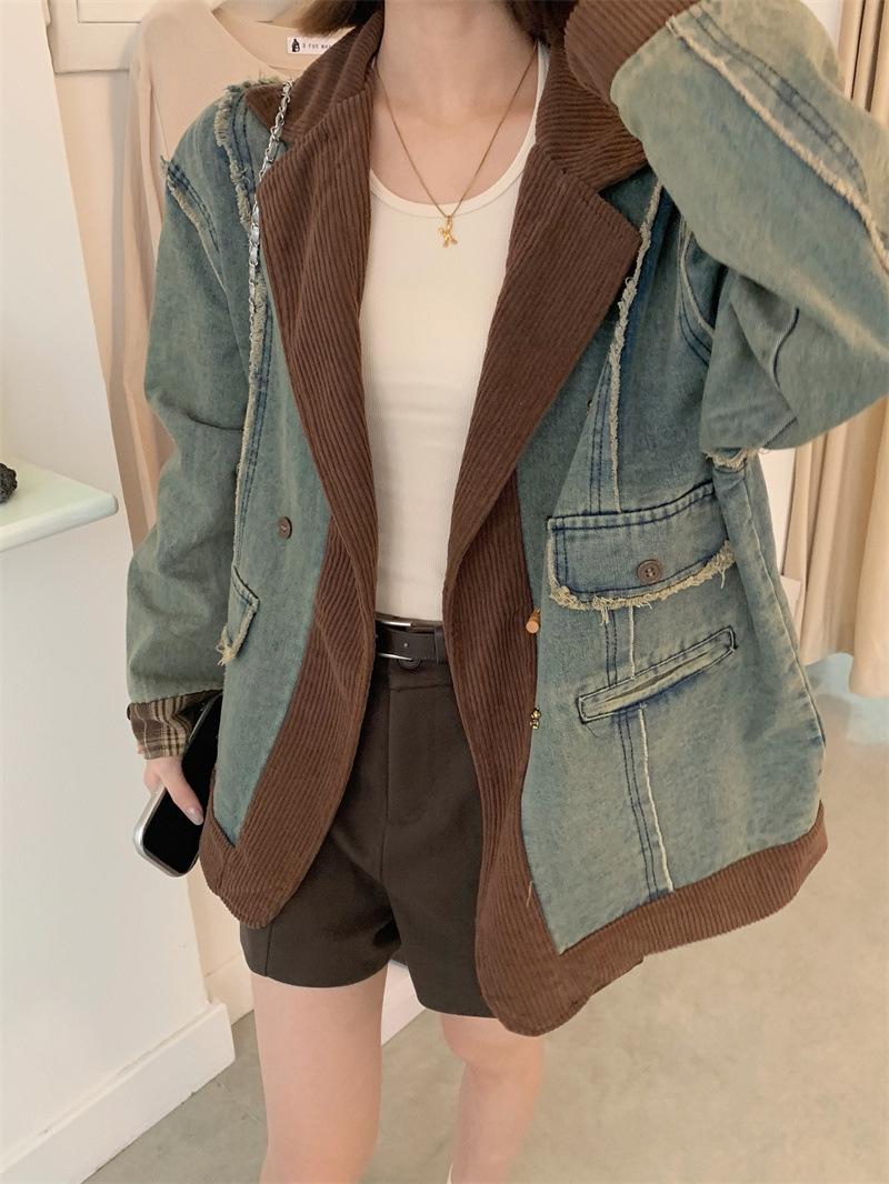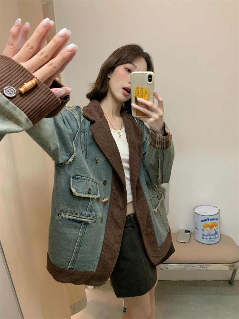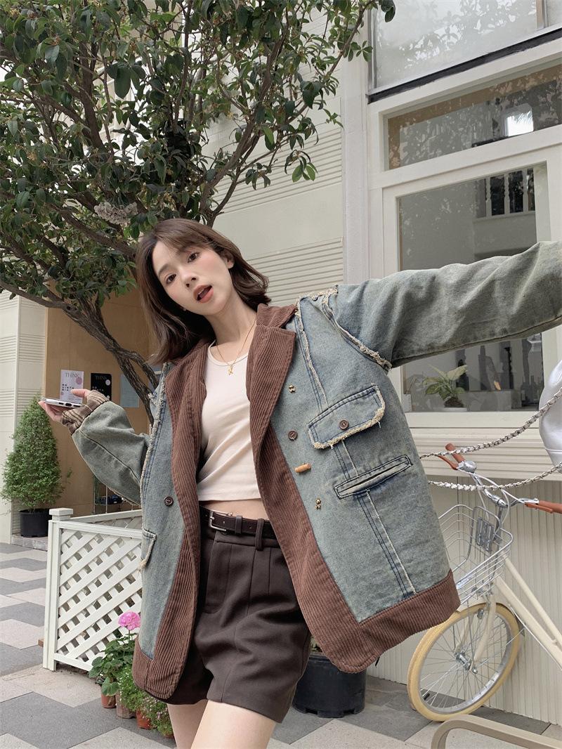Chaqueta de Traje de Mezclilla con Costuras de Pana de Estilo Vintage de Hong Kong para Mujer Primavera y Otoño 2024 Nuevo Diseño Top Casual para Mujer