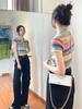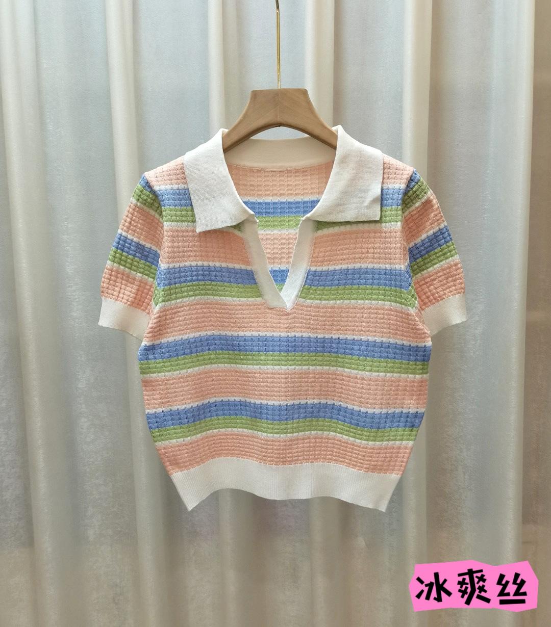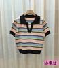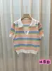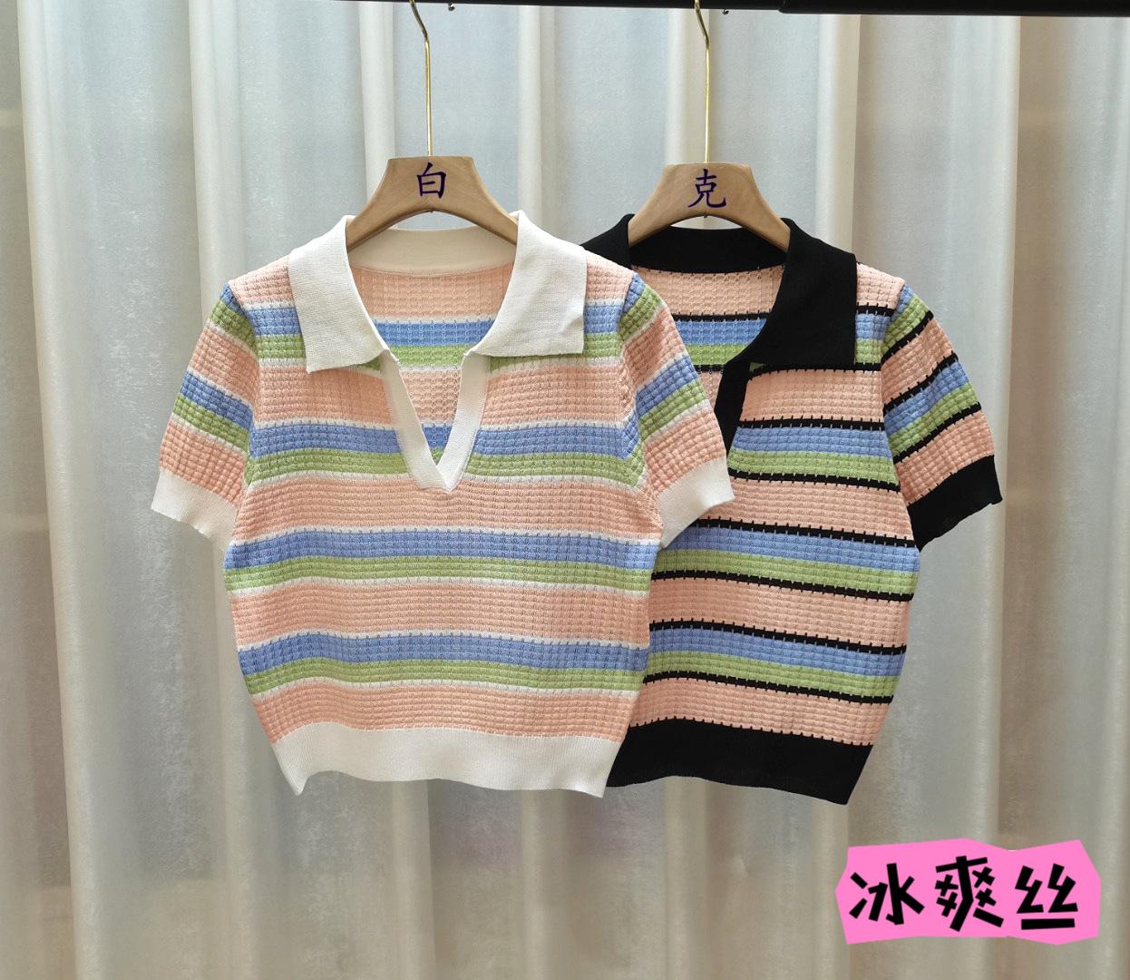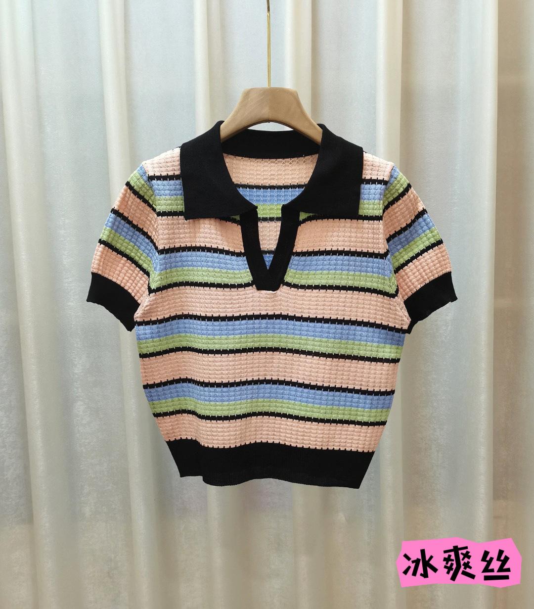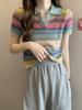 Camiseta de Manga Corta con Cuello Polo de Estilo Dulce y Picante con Rayas de Arcoíris para Mujer, Verano, Diseño de Nicho, Top Corto de Punto