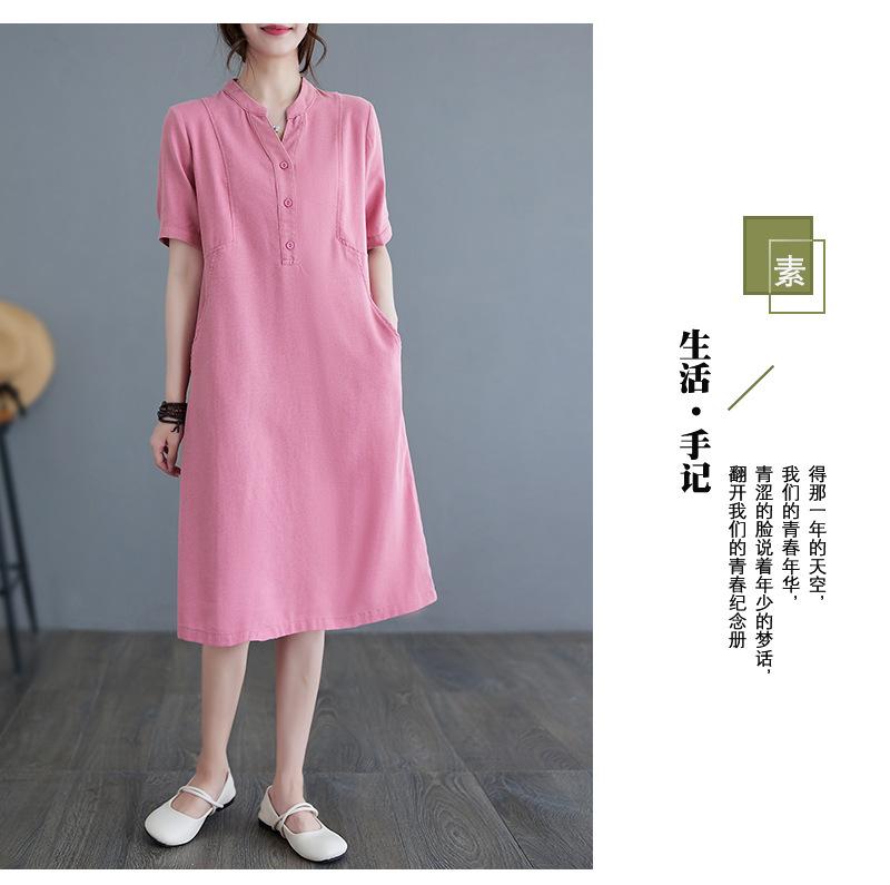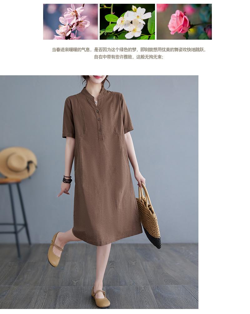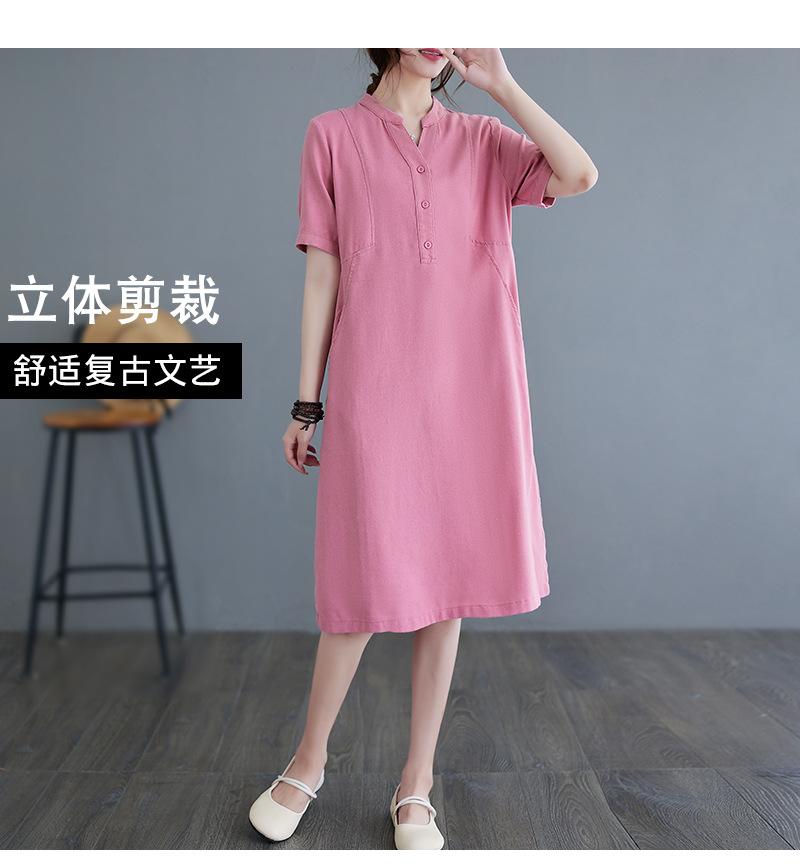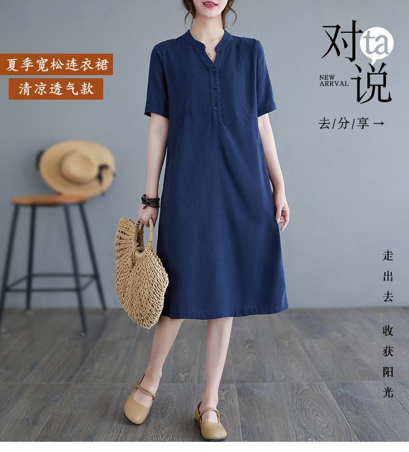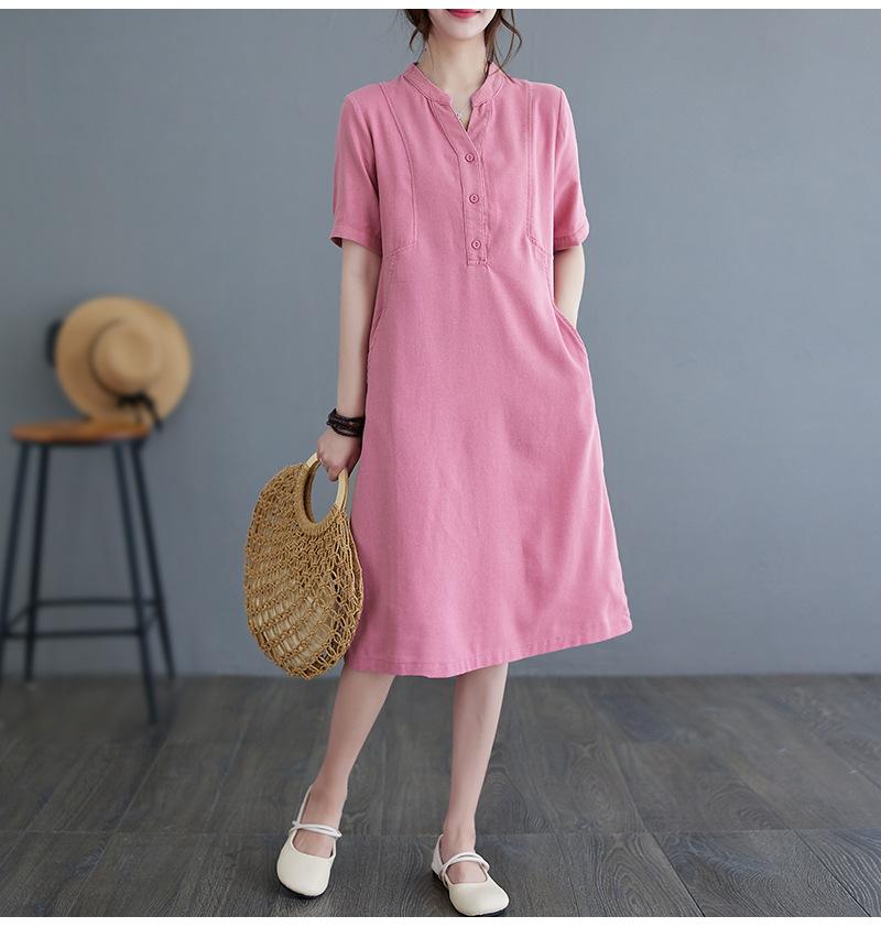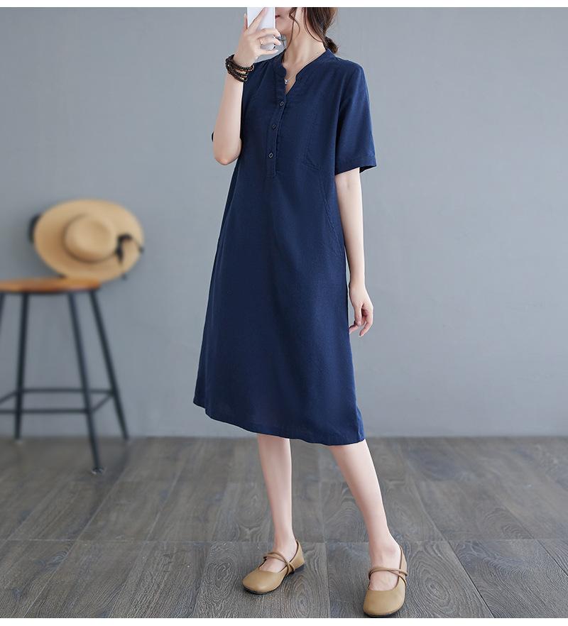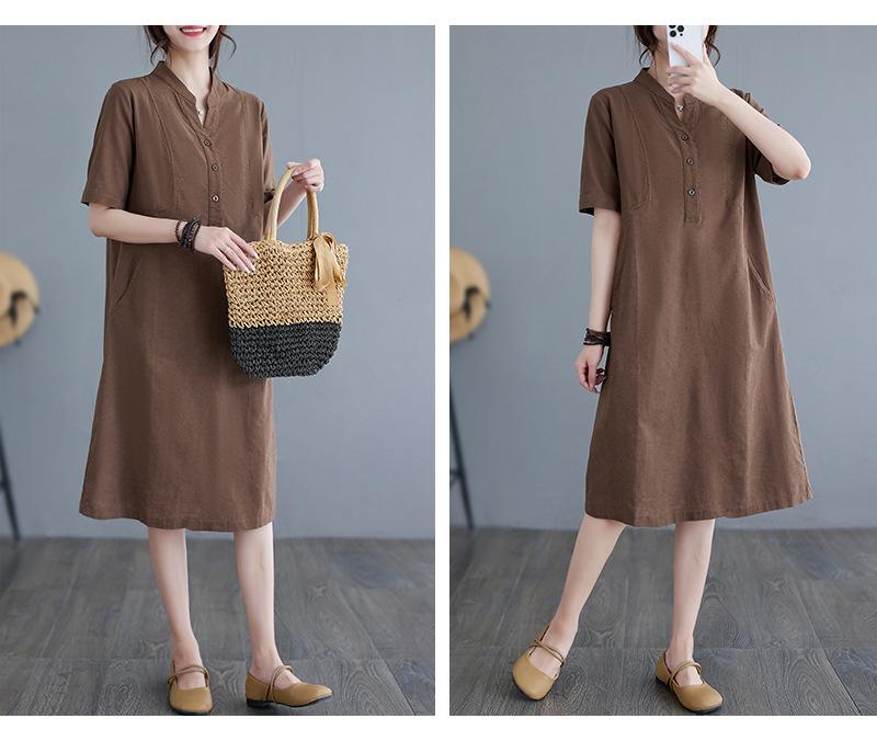 Foto real 2024 verano nuevo arte holgado color sólido algodón cuello V manga corta vestido de mujer largo 1685#