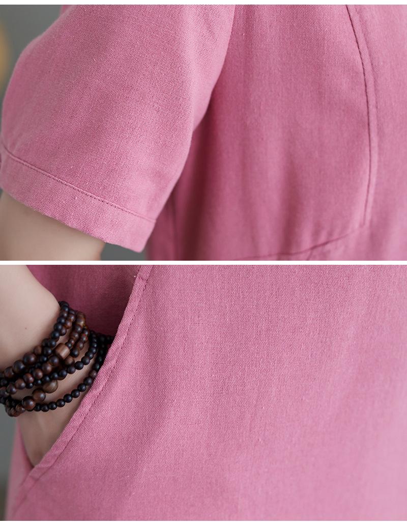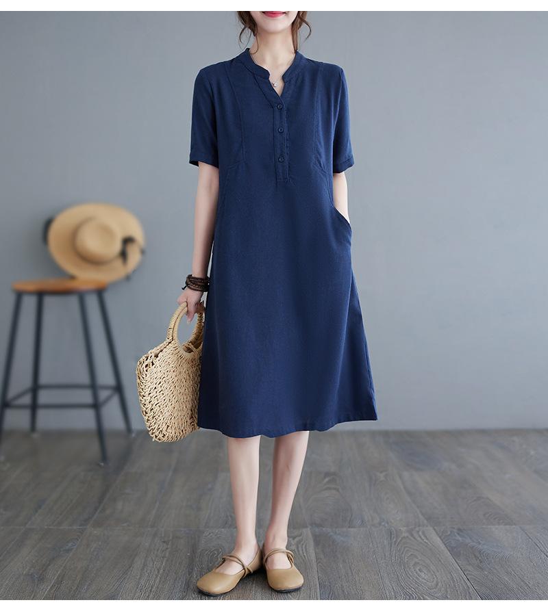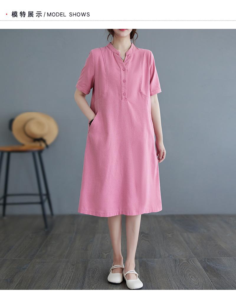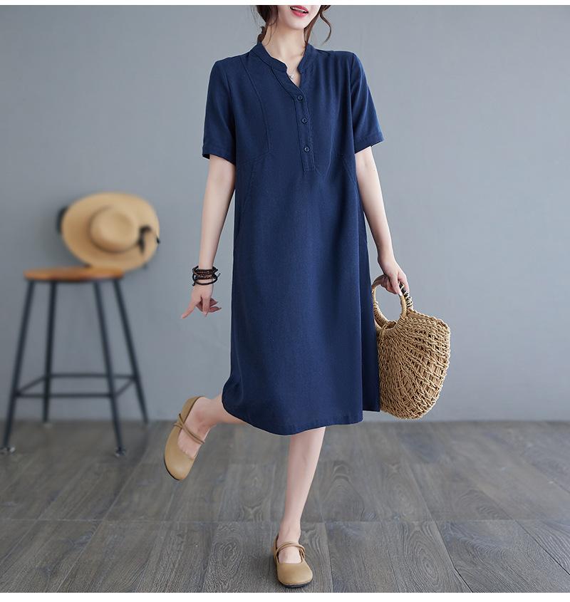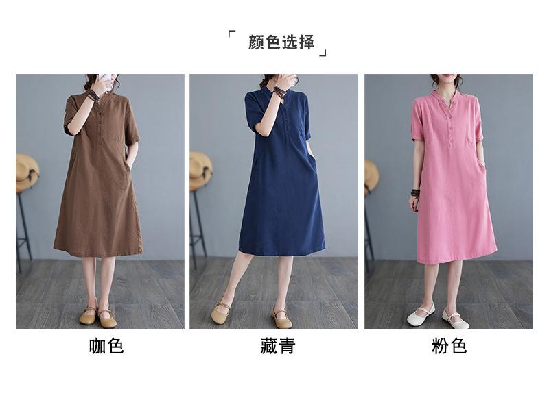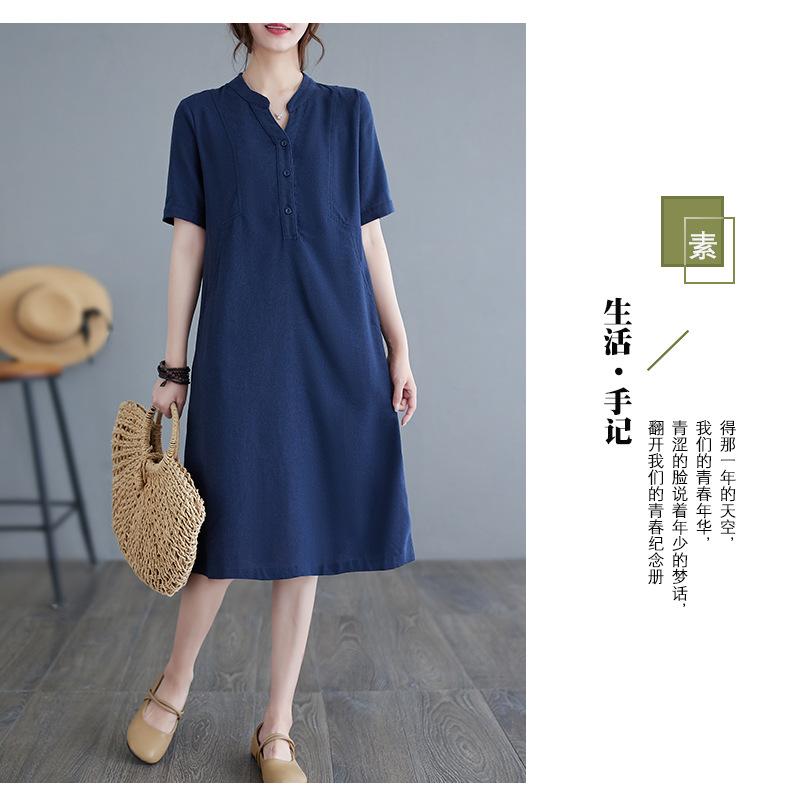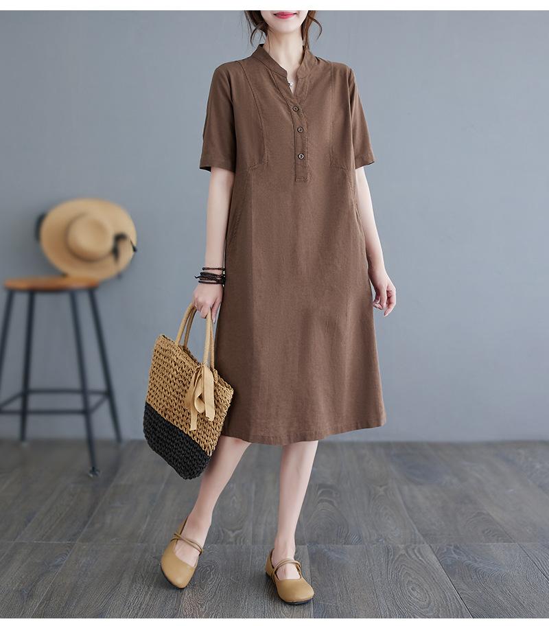 Foto real 2024 verano nuevo arte holgado color sólido algodón cuello V manga corta vestido de mujer largo 1685#