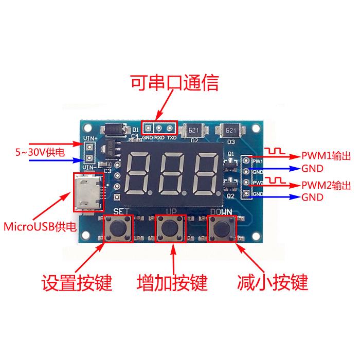 1.Dos independientesmodulación por ancho de pulsos (PWM)La salida, la frecuencia y el ciclo de trabajo se pueden configurar por separado;