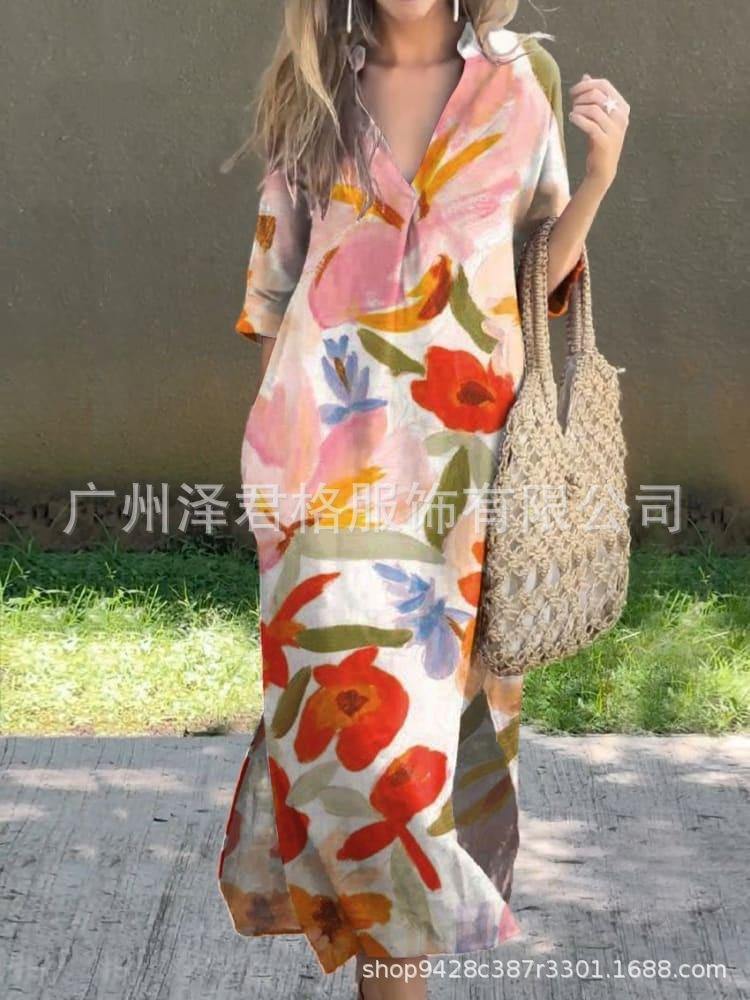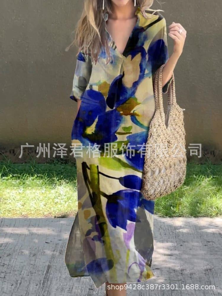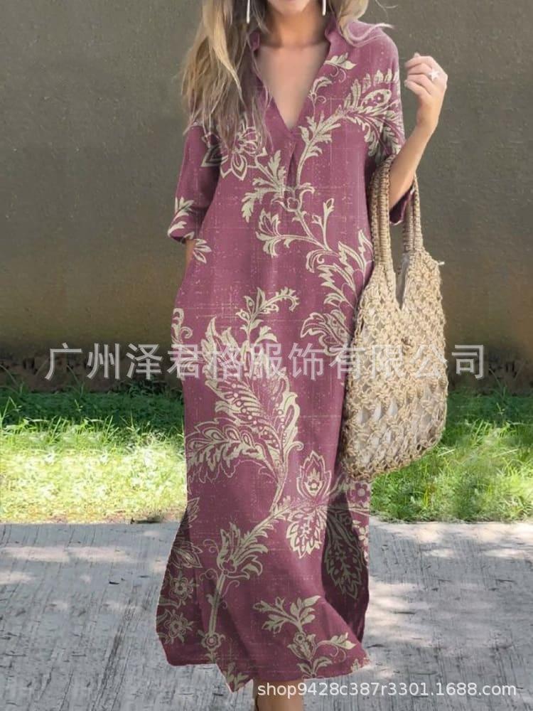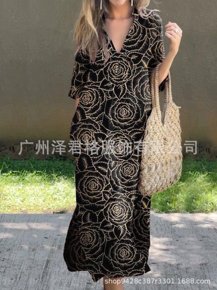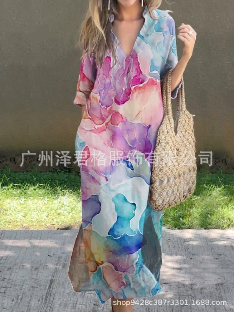 Vestido confeccionado con falda informal, estampado sencillo y cuello en V, para mujer, verano, 2024, Amazon, transfronterizo, Europa y América