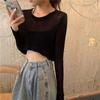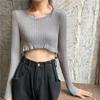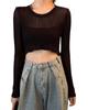 2023 Nuevo Estilo Rayas Verticales Estilo Delgado Corto Delantero y Largo Atrás Ligeramente Transparente Tejido de Punto de Manga Larga para Mujer Verano Top Corto al Ombligo a la Moda