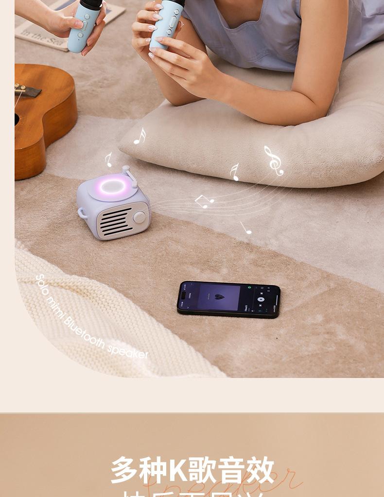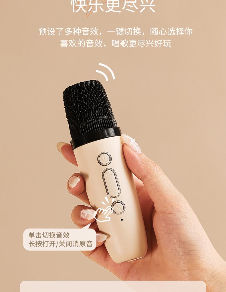 7. Mantenga presionado el botón de encendido del micrófono durante 3 segundos para encender/apagar el micrófono, entrar en el estado de búsqueda inalámbrica, la luz LED azul parpadea y el altavoz se conecta automáticamente después de reproducir el tono de aviso. Después de que la conexión sea exitosa, la luz LED azul permanece encendida; haga clic en el botón de encendido para apagar/encender el micrófono. Haga clic en el botón de volumen "+" para aumentar el volumen del micrófono; haga clic en el botón de volumen "-" para disminuir el volumen del micrófono. Mantenga presionado el botón "+" para cambiar a la canción anterior, y mantenga presionado el botón "-" para cambiar a la siguiente canción; haga clic en el botón del micrófono para recorrer una variedad de efectos de sonido mágicos: mantenga presionado el botón del micrófono para activar/desactivar la cancelación de la voz original.