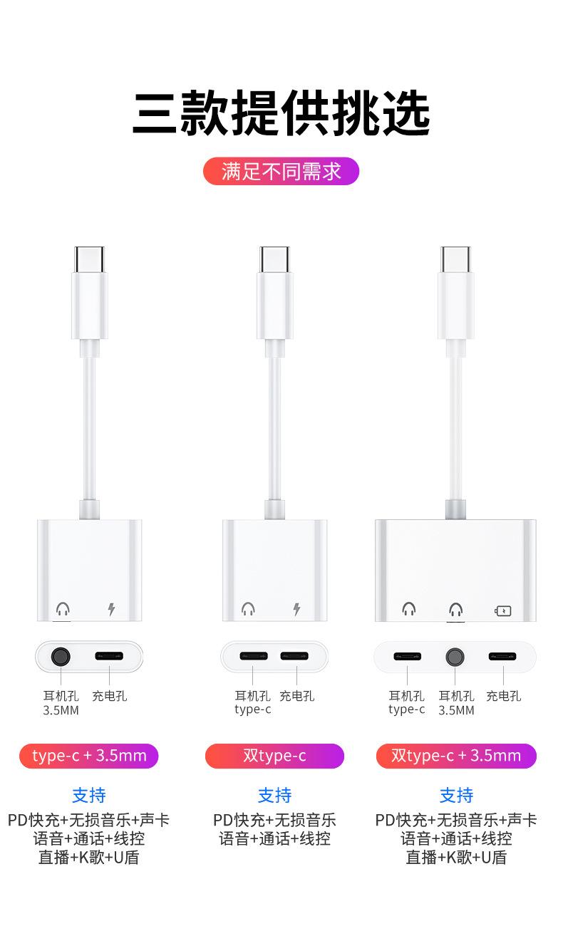 Type-C to C +3.5 analog version, Type-C to C + C Digital version 18W, Type-C to C +3.5 Digital Version 60W, Ty...
