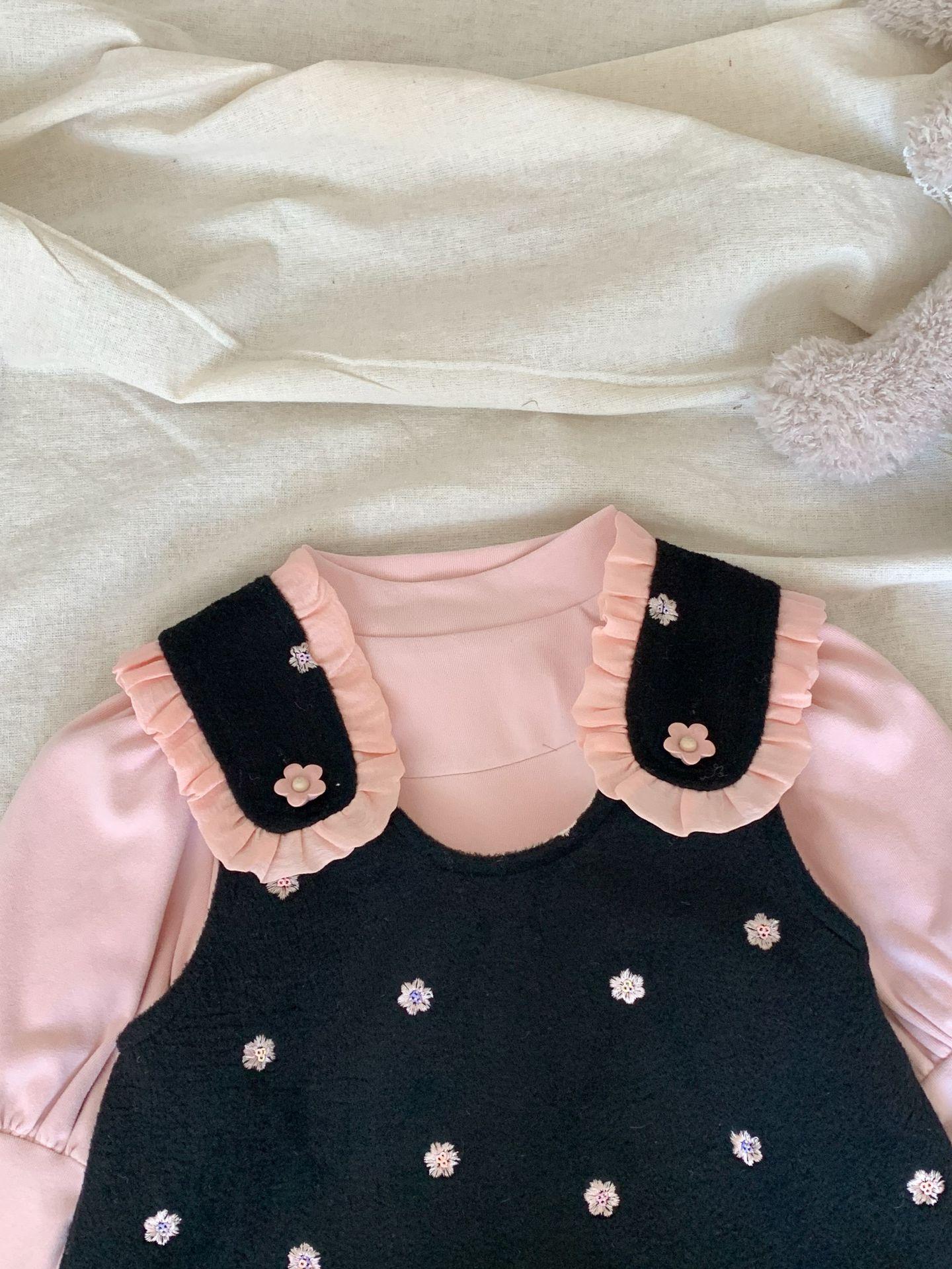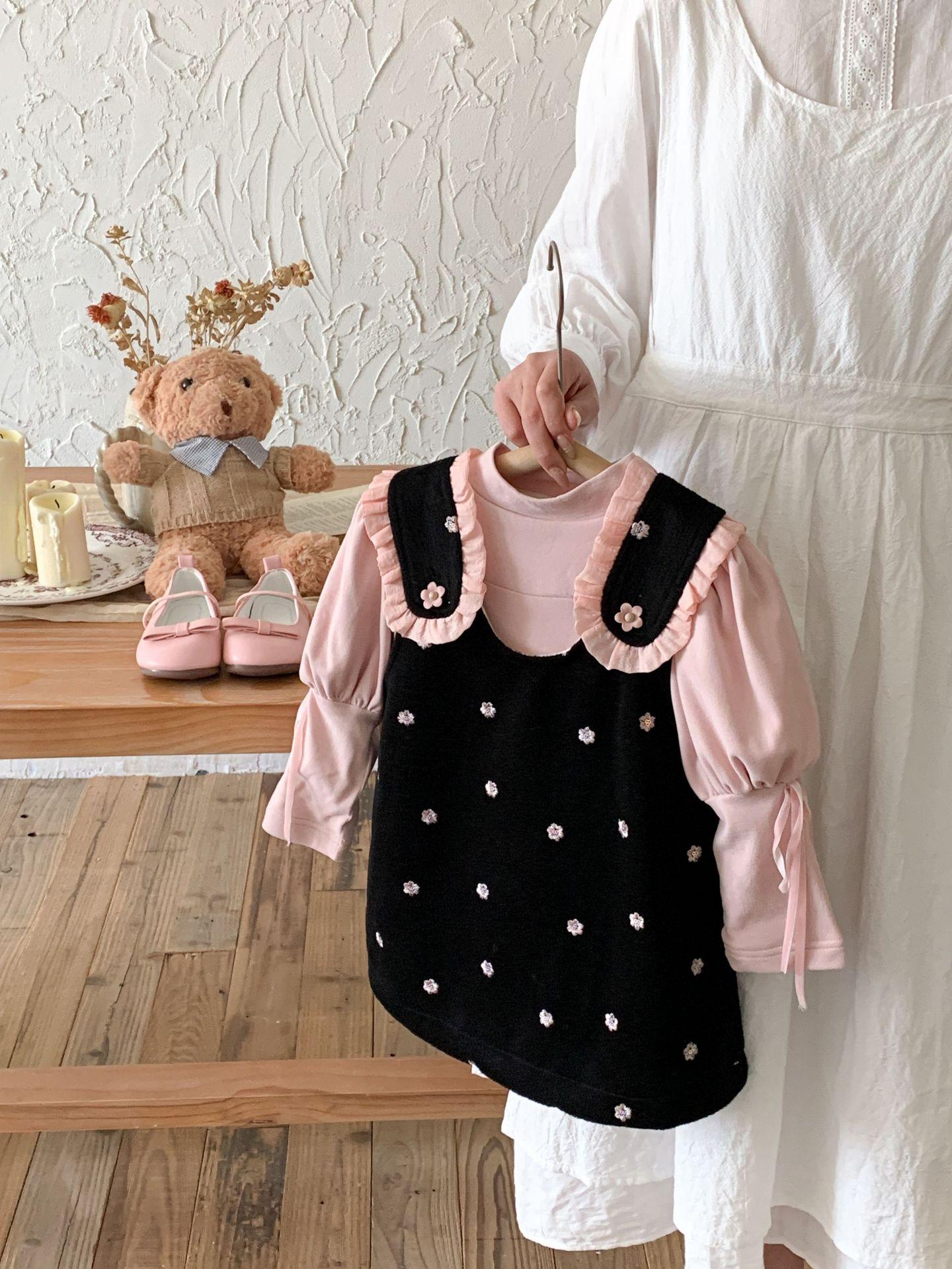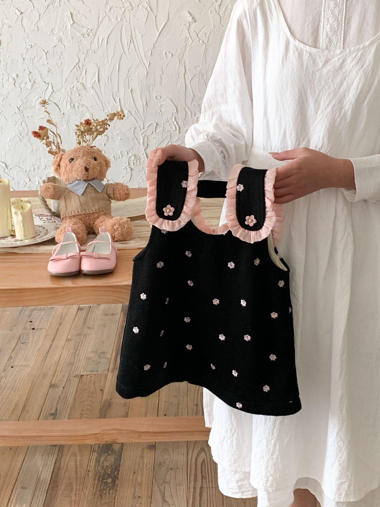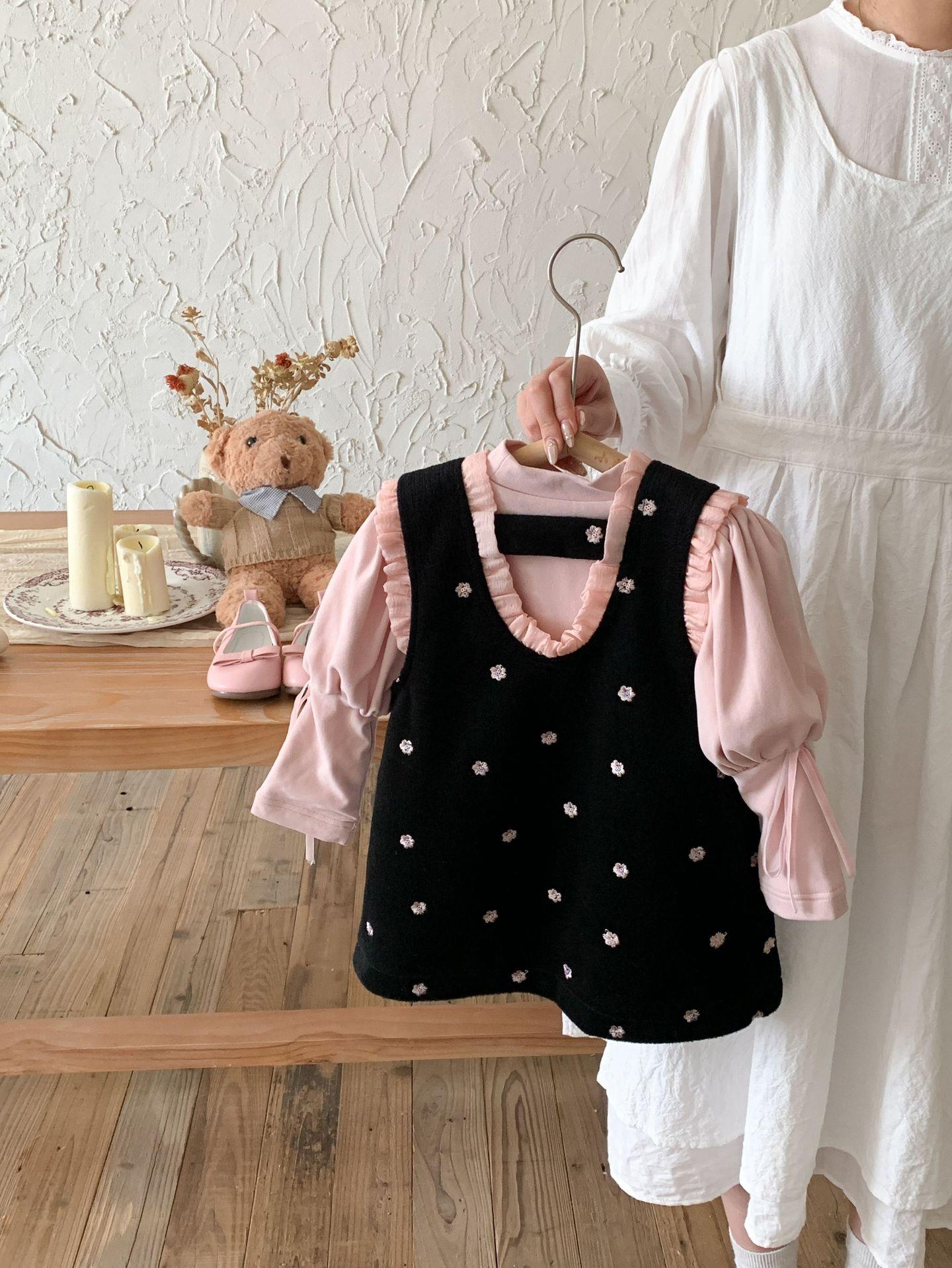 Conjunto para Niñas 24 Invierno Versión Coreana Vestido Chaleco de Lana Bordado Floral Manga Abullonada Estilo Princesa Coreana Infantil