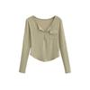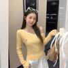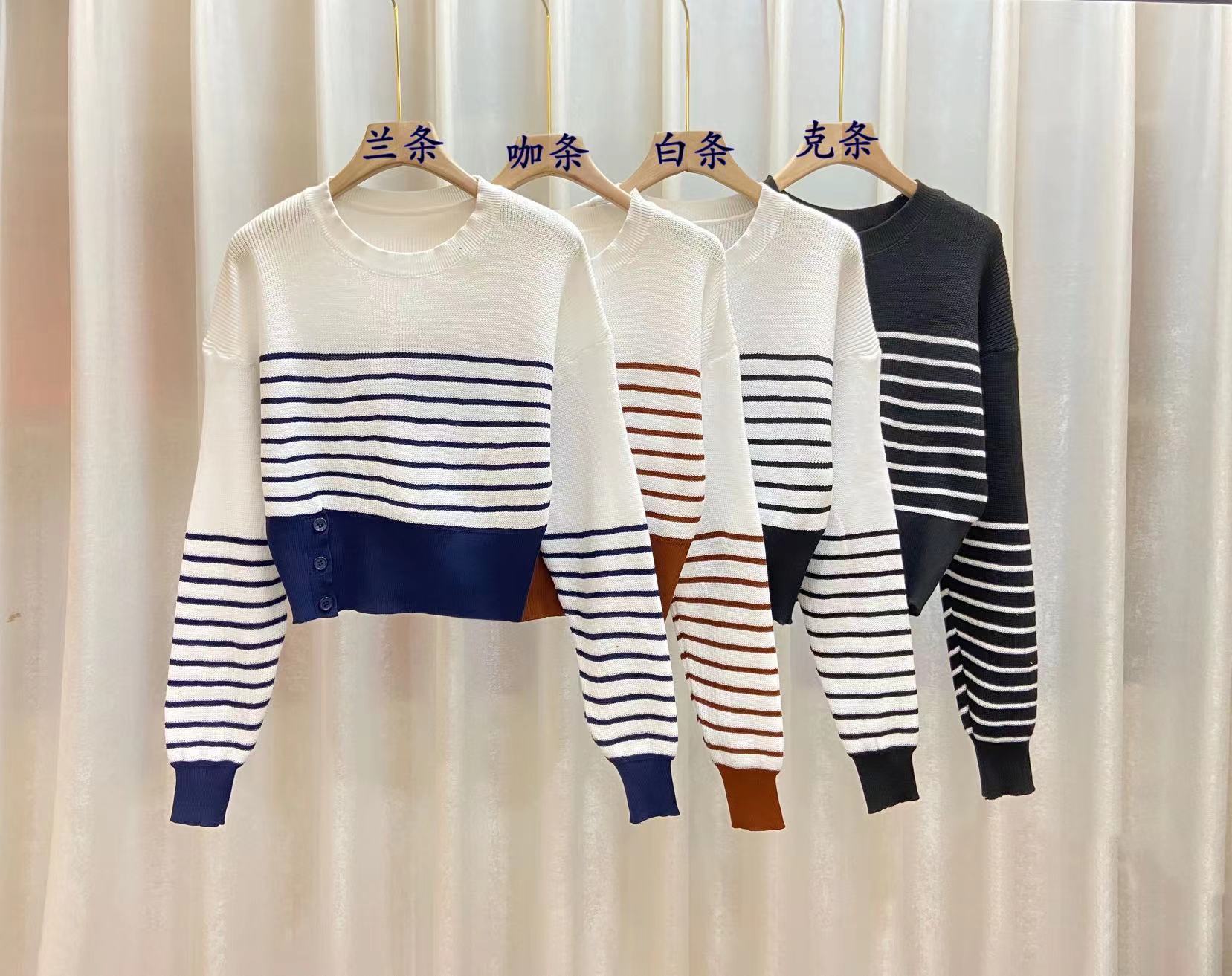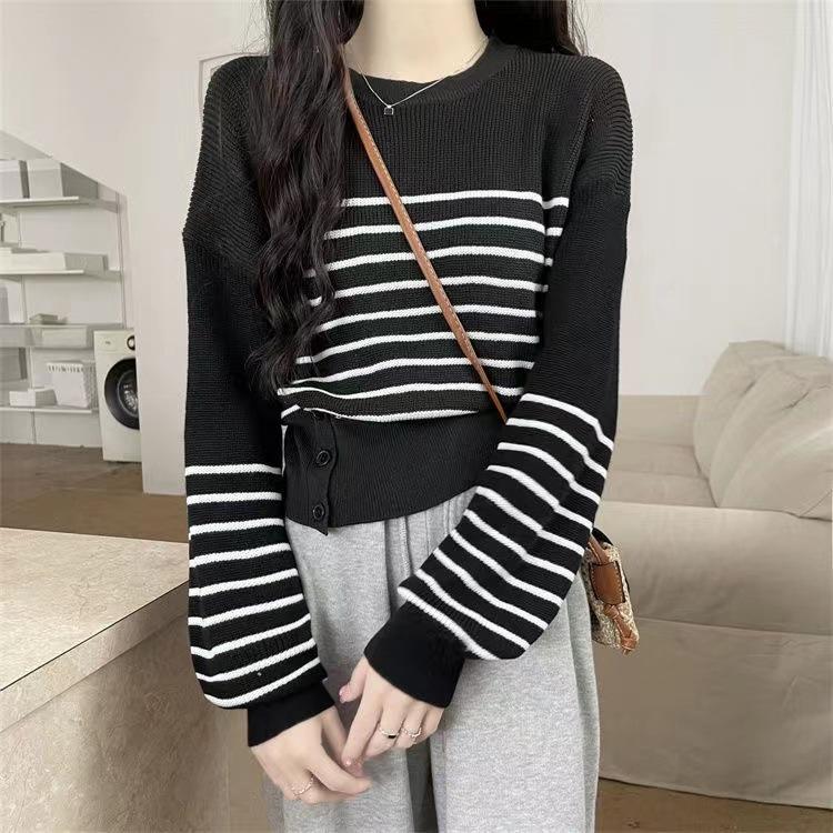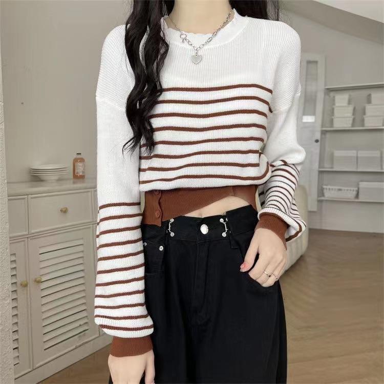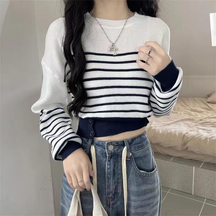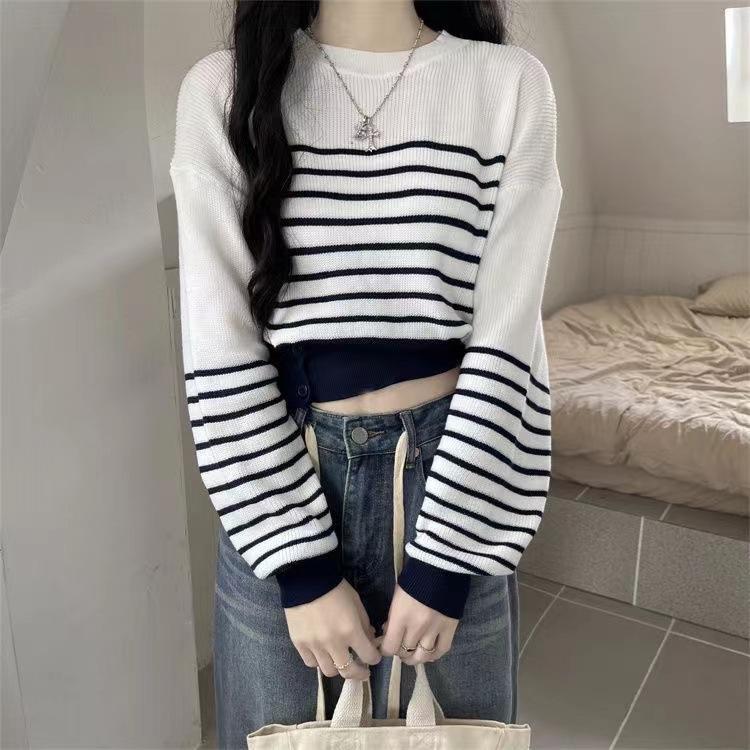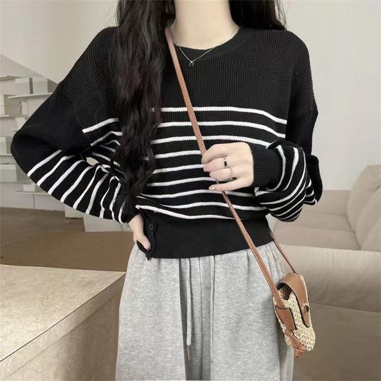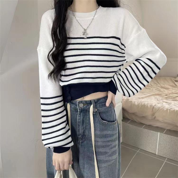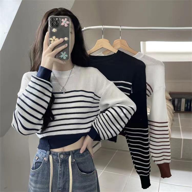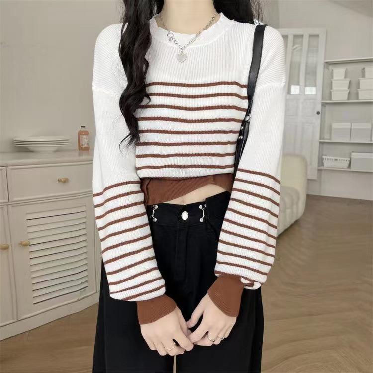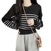 Suéter de Cuello Redondo a Rayas en Contraste Estilo Retro para Mujer Estilo Transfronterizo Nuevo Otoño e Invierno Slim de Manga Larga Top Corto