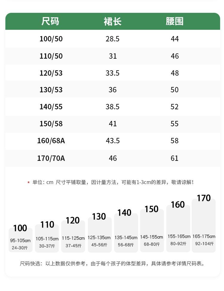 Recommended height for size 100 is 95-105cm, Recommended height for size 110 is 105-115cm, Recommended height ...