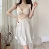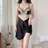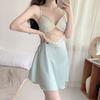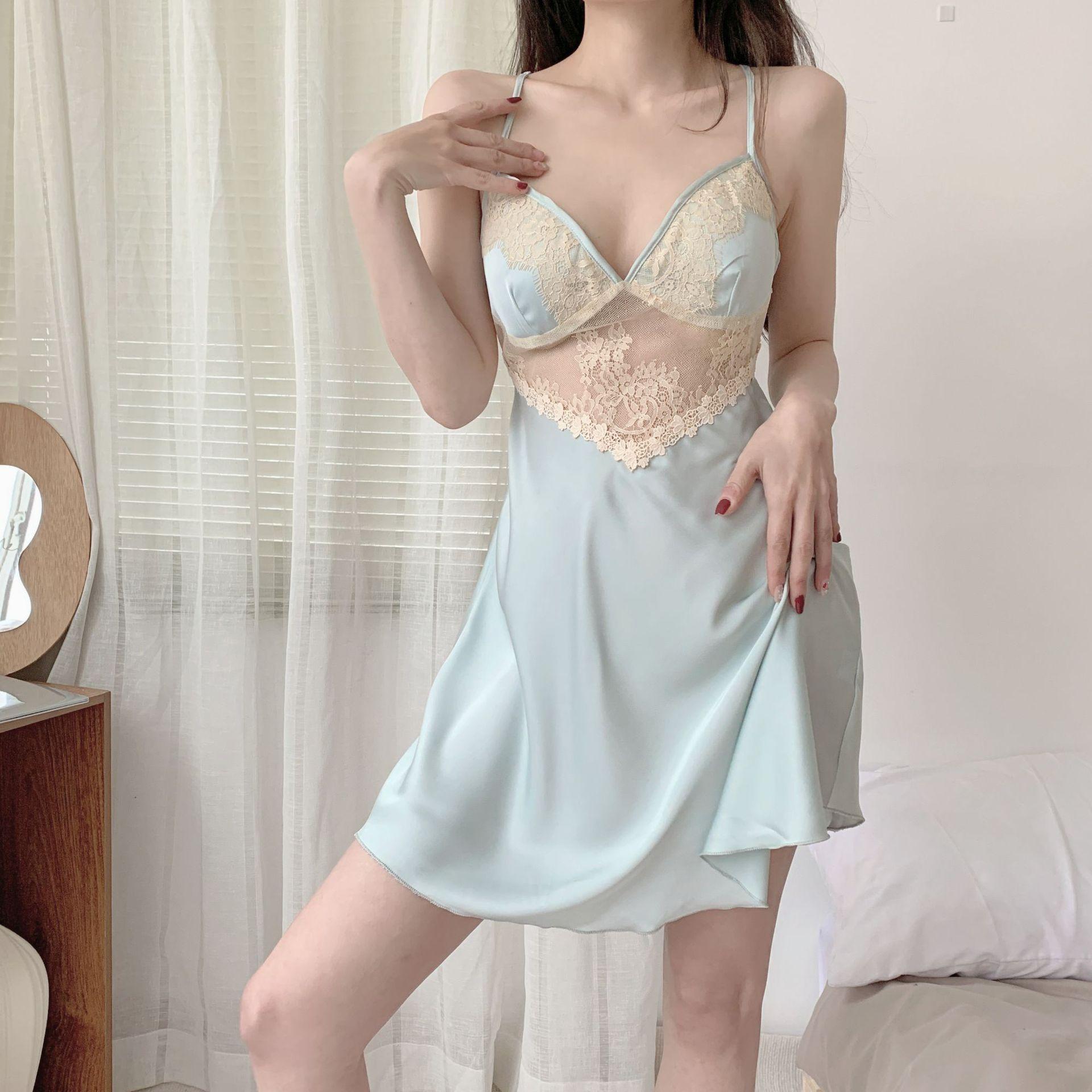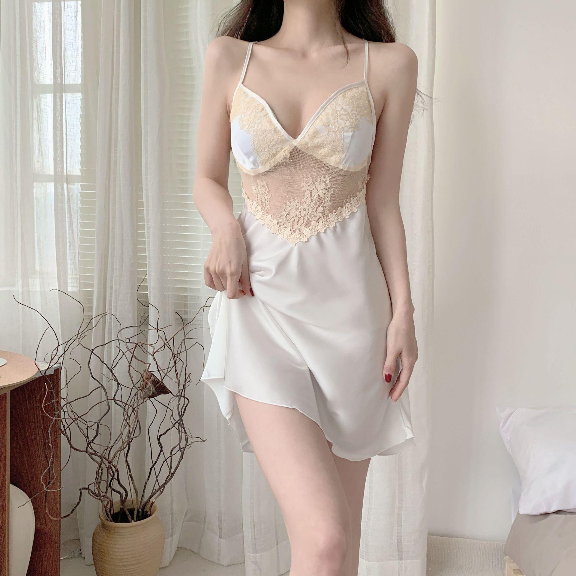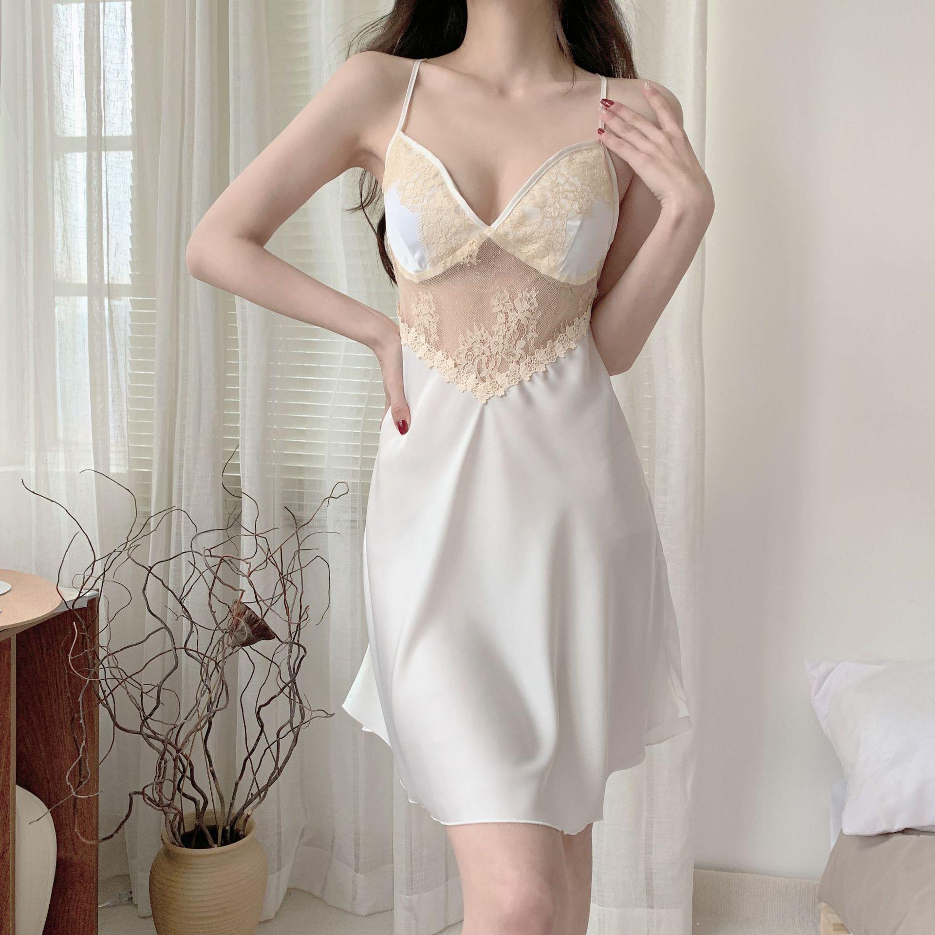 Camisón de Encaje Malla Hueca Sexy Estilo Europeo y Americano Satén Tentación Pijama Falda Corta Hermosa Espalda Privado Habitación Tirantes