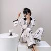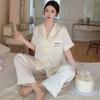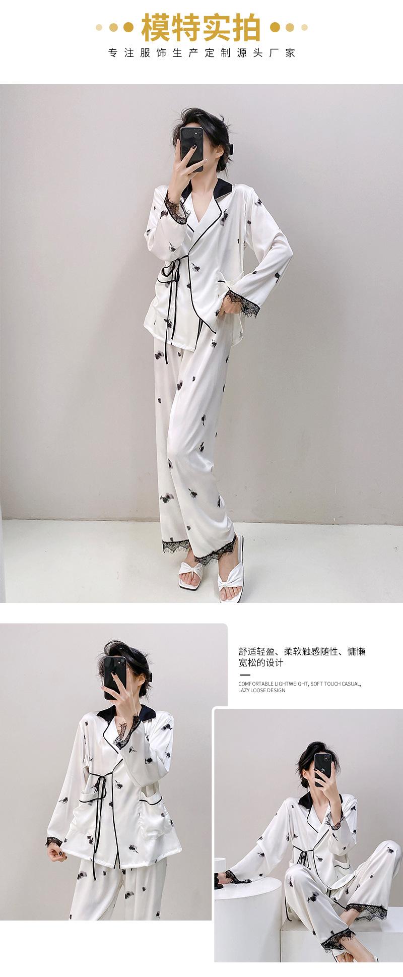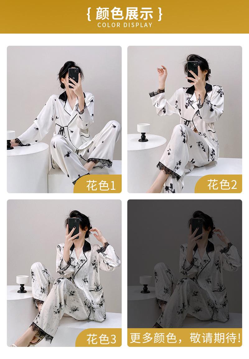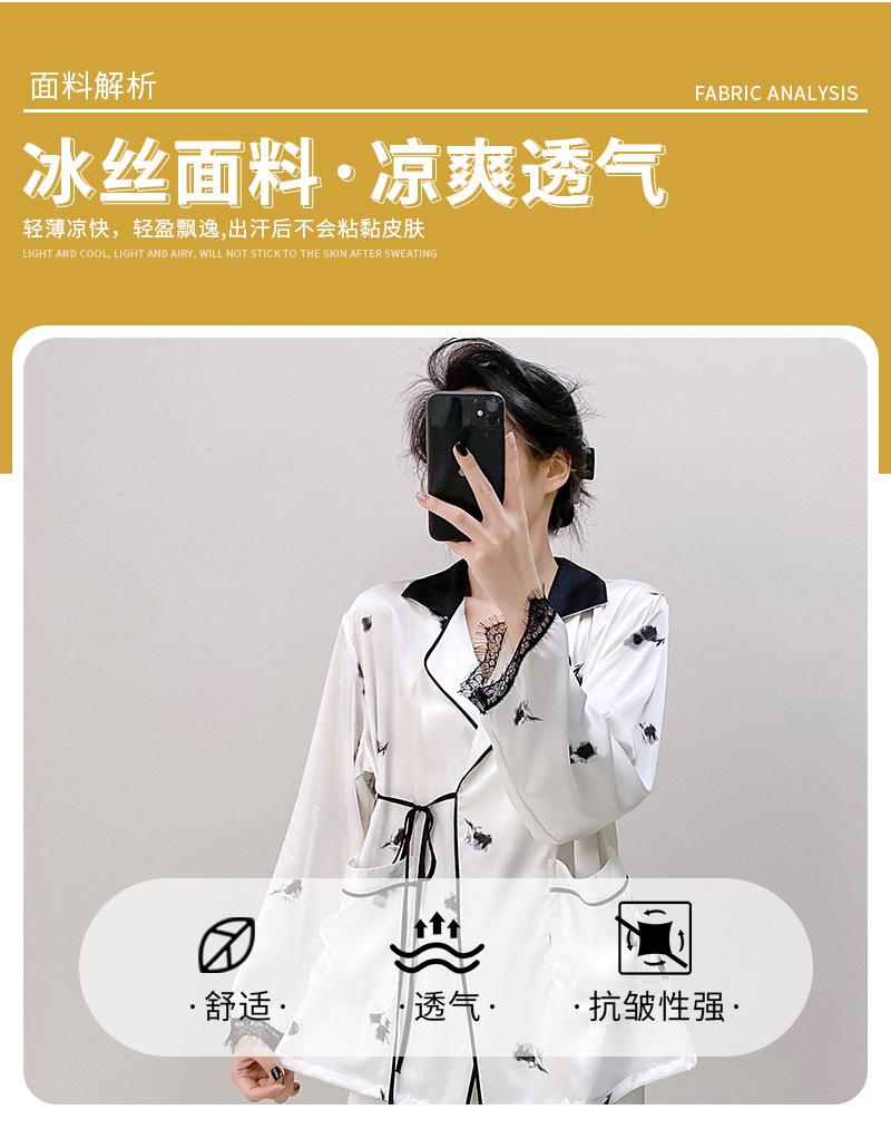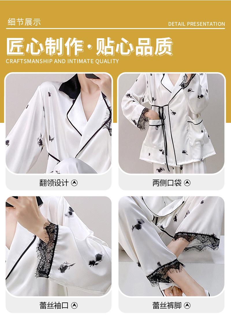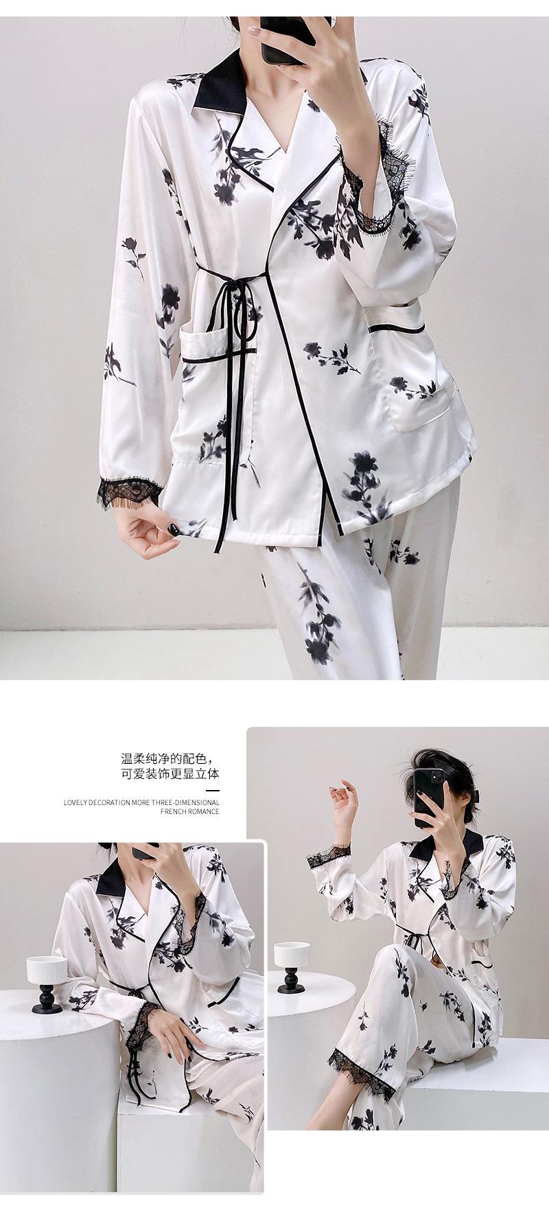 Pijama Nuevo de Seda para Mujer Estampado de Tinta Casual Manga Larga Pantalones Seda de Hielo Se Puede Usar Fuera de Casa Traje de Dos Piezas