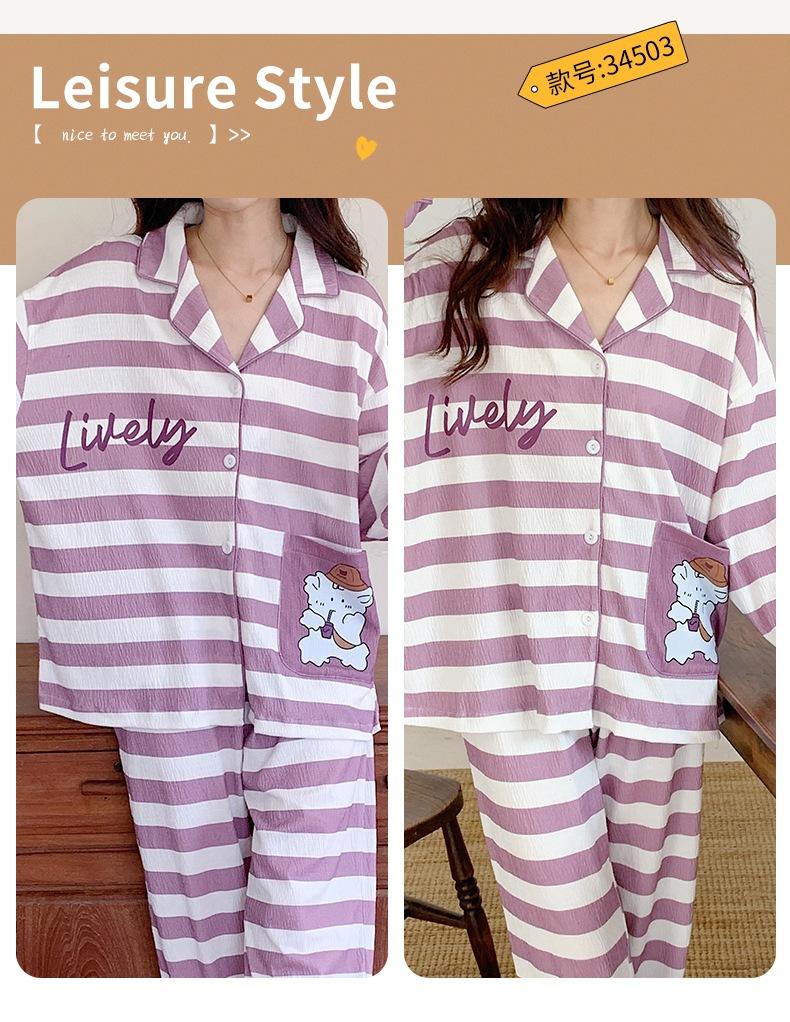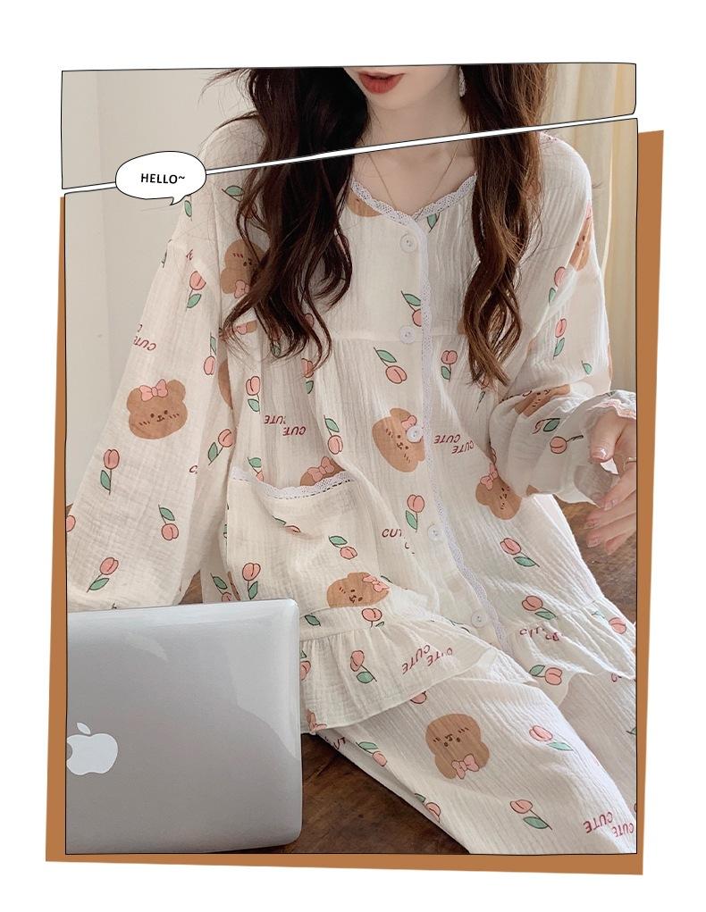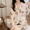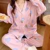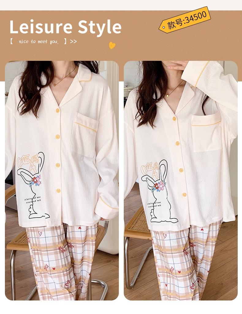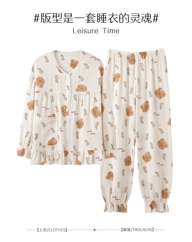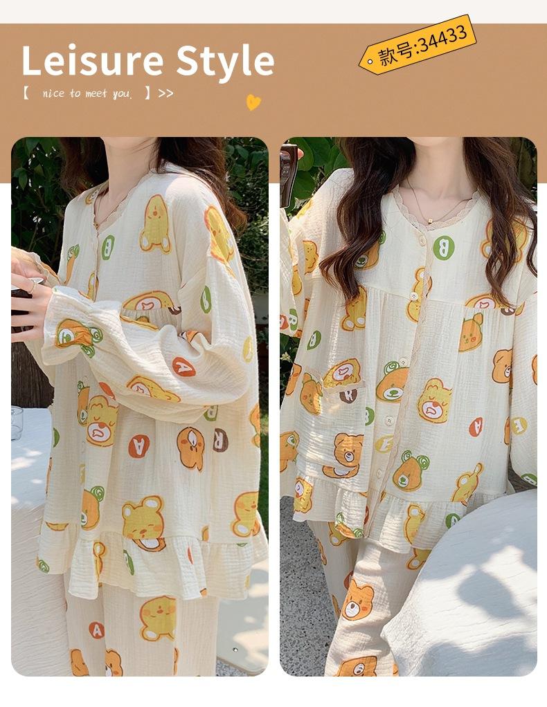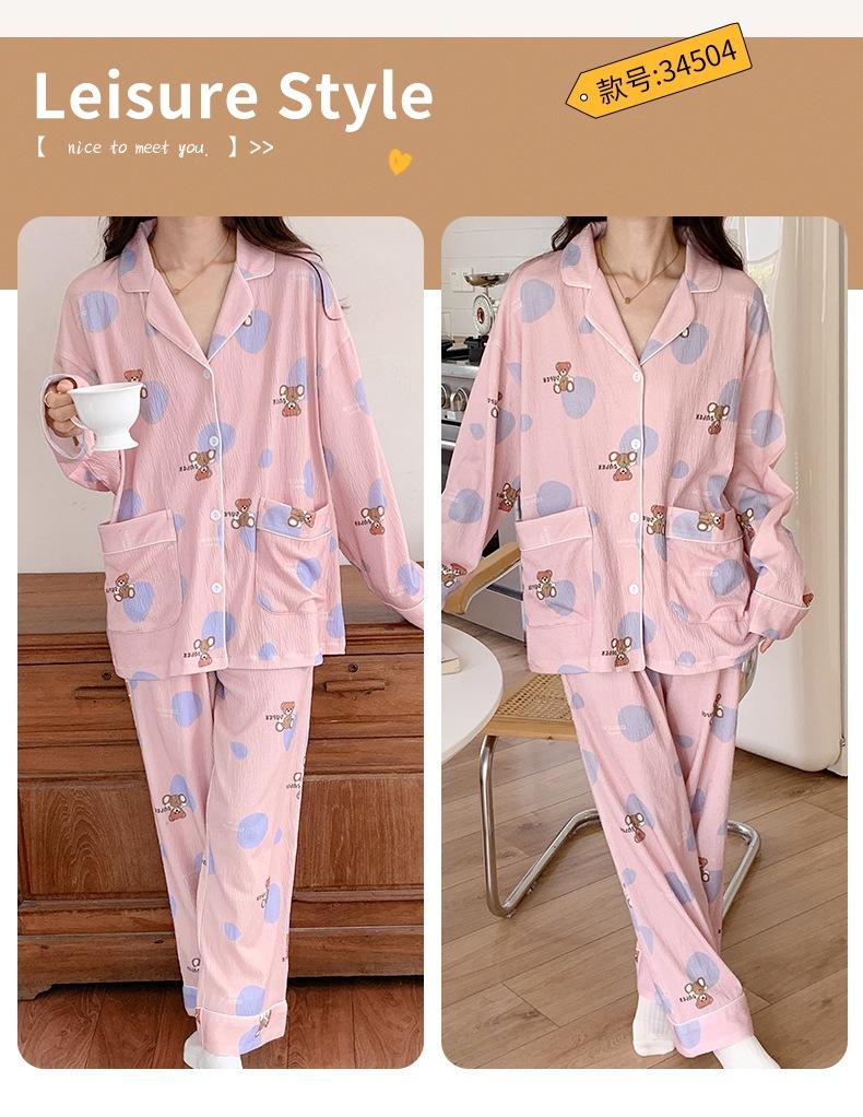 Pijamas nuevos de primavera y otoño para mujer, cárdigan de algodón tejido 6535, de tela arrugada, de manga larga, con dibujos animados, ropa para el hogar.