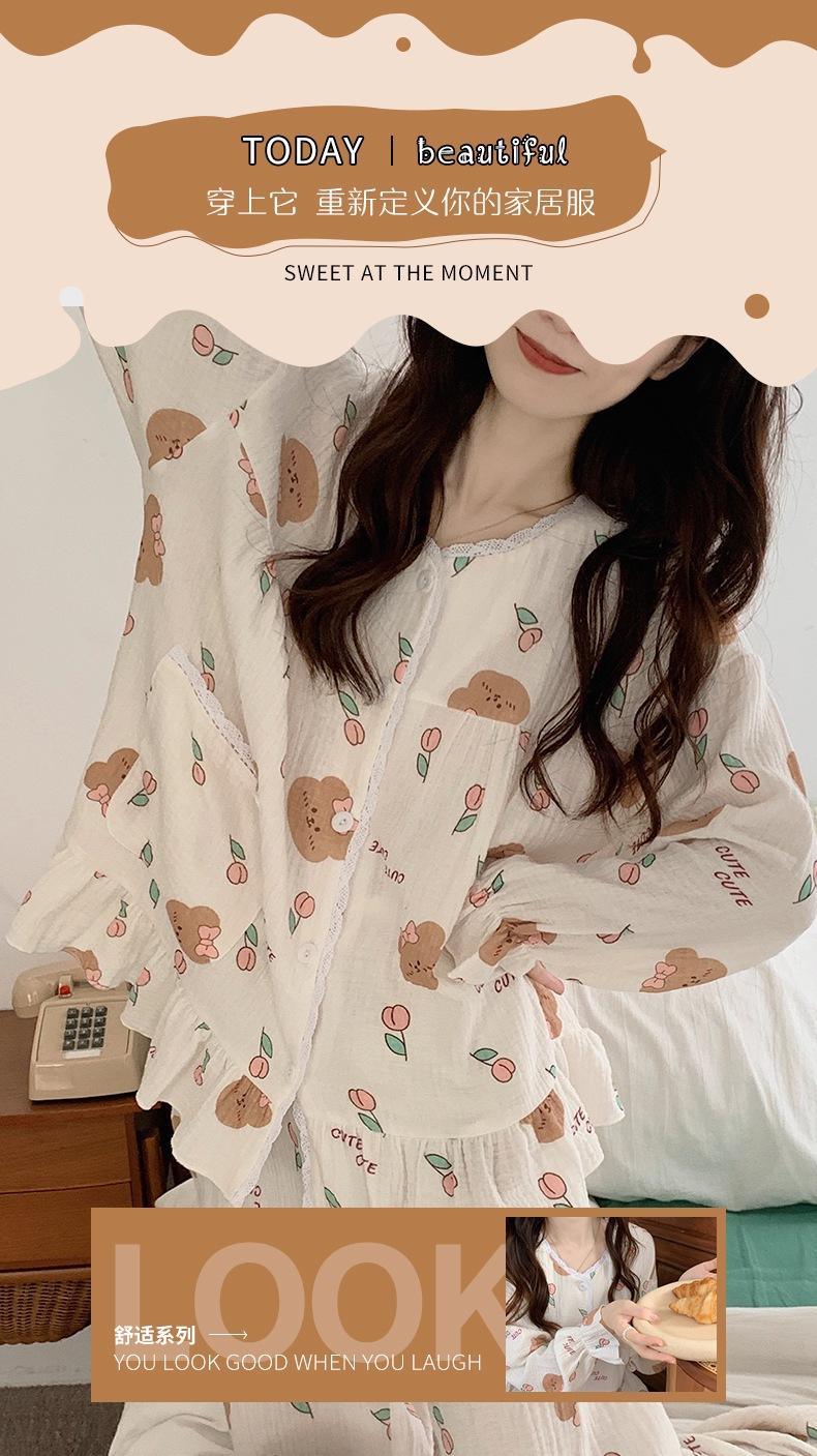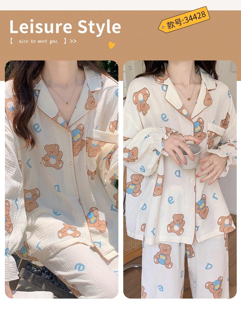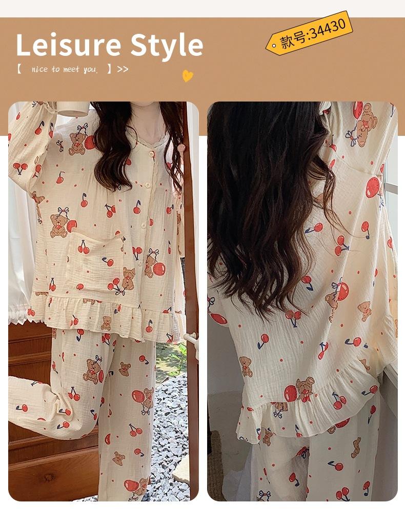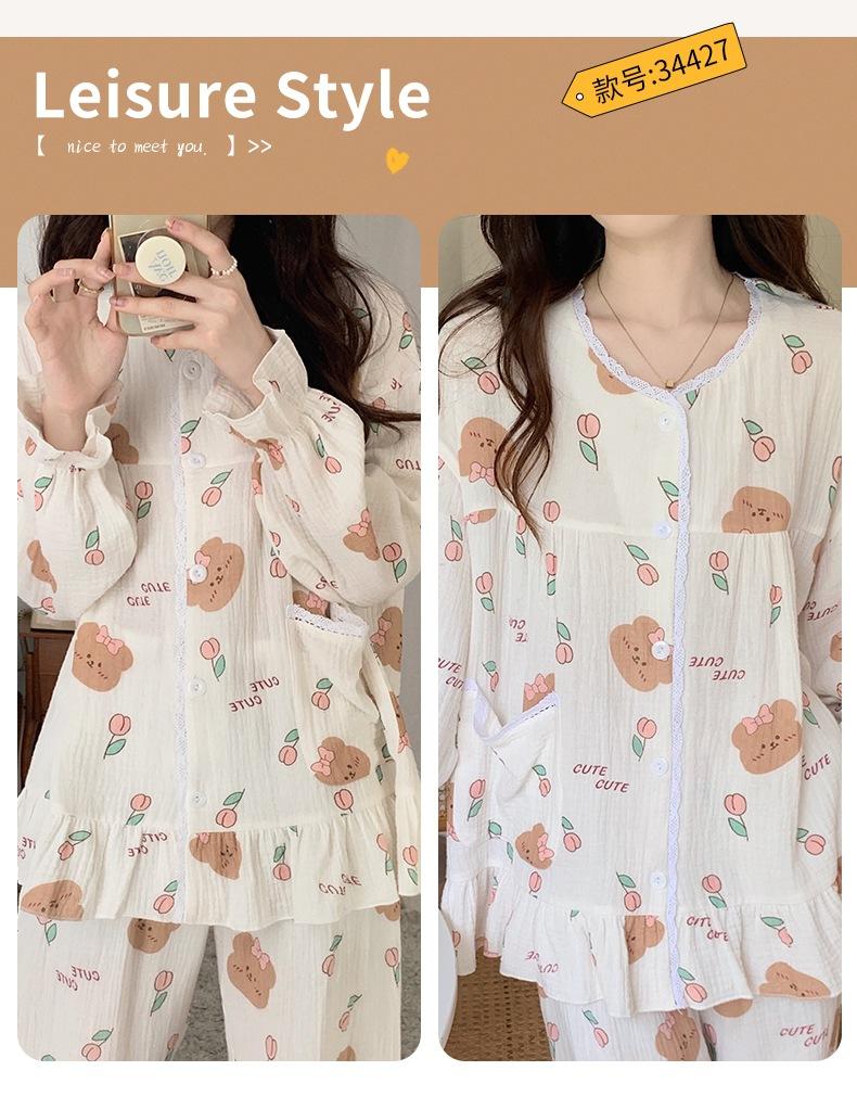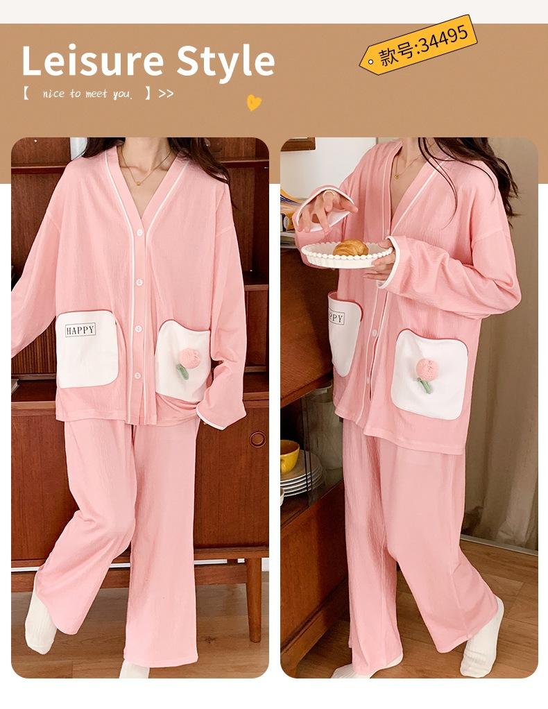 Pijamas nuevos de primavera y otoño para mujer, cárdigan de algodón tejido 6535, de tela arrugada, de manga larga, con dibujos animados, ropa para el hogar.
