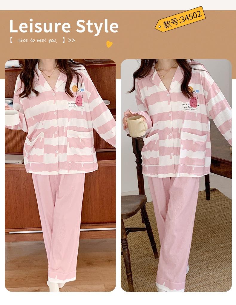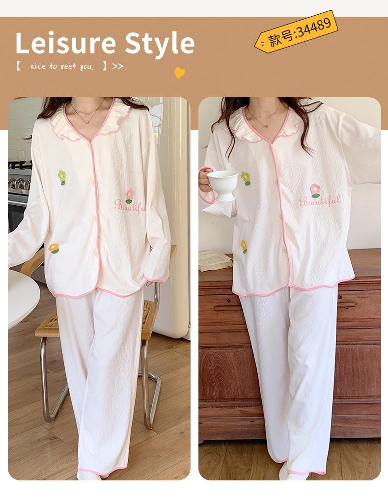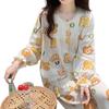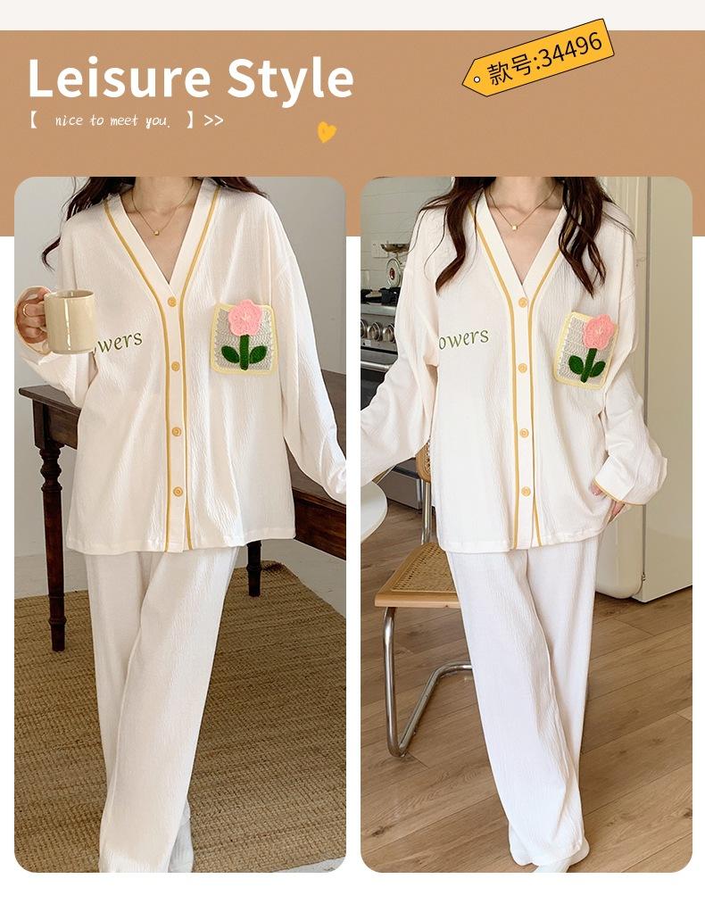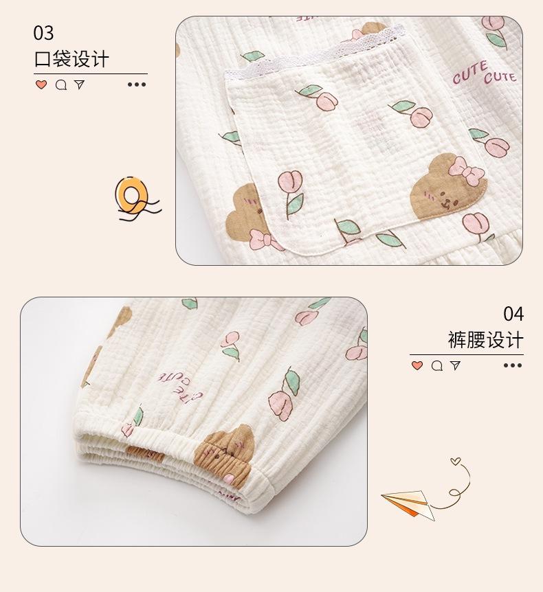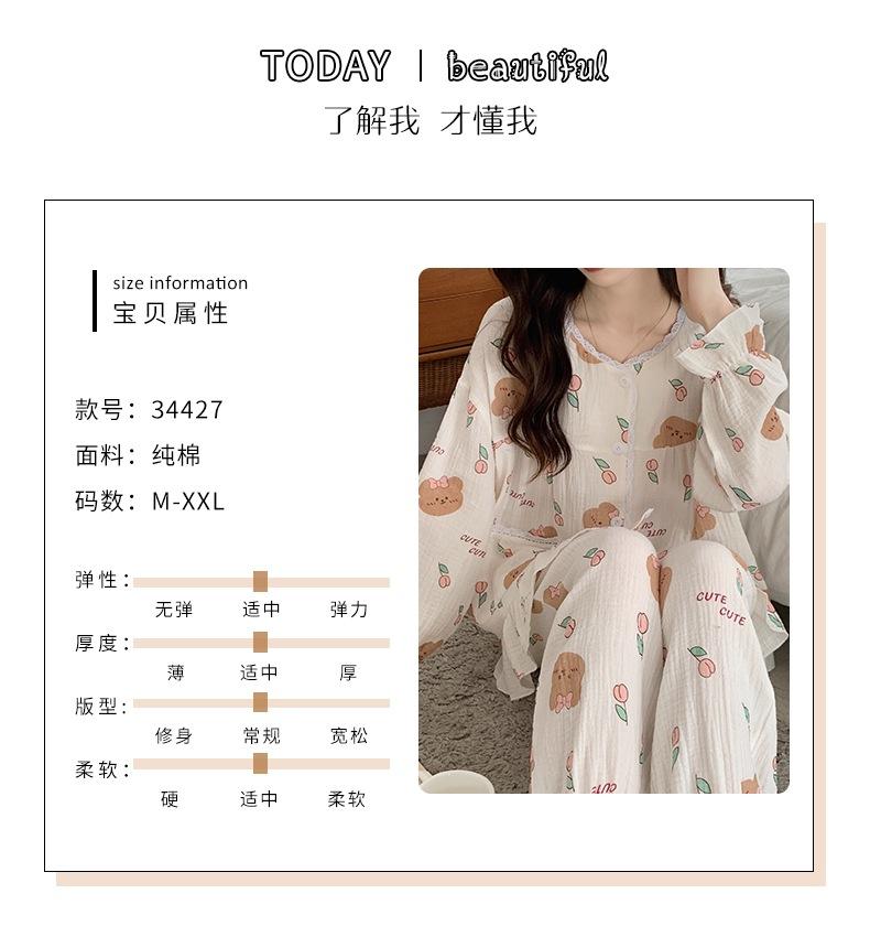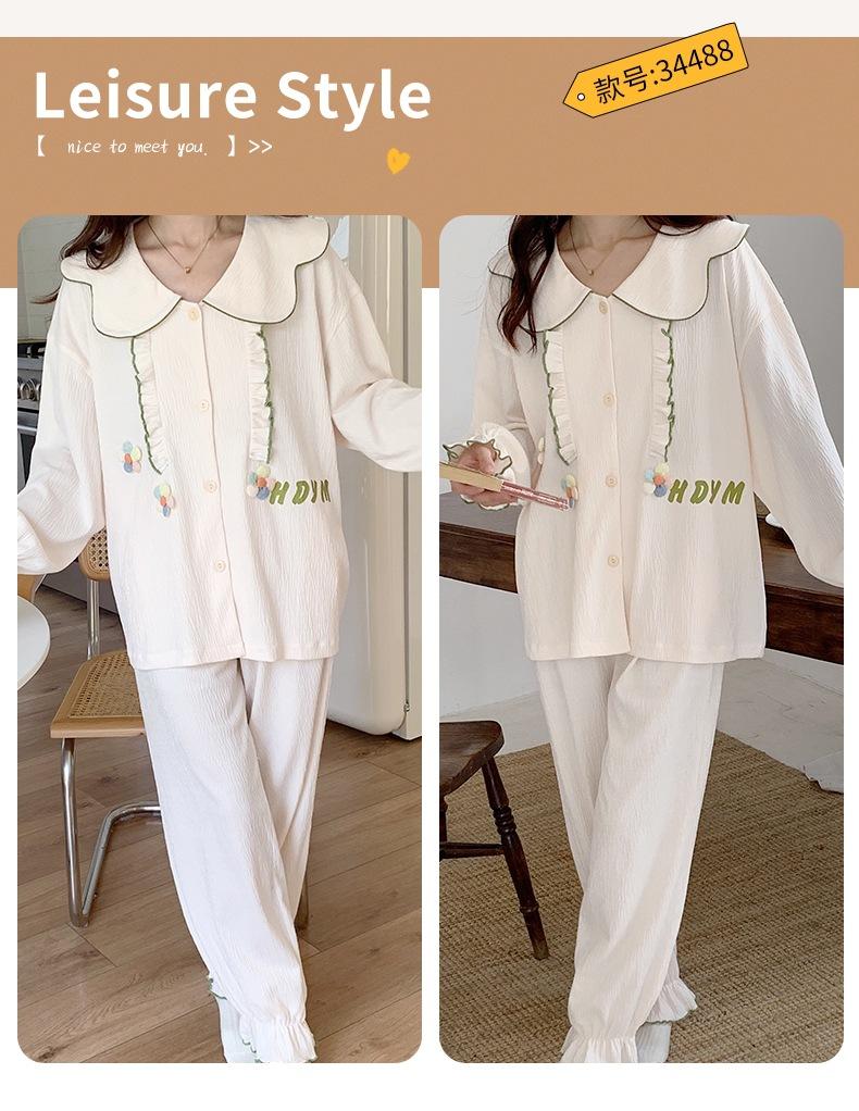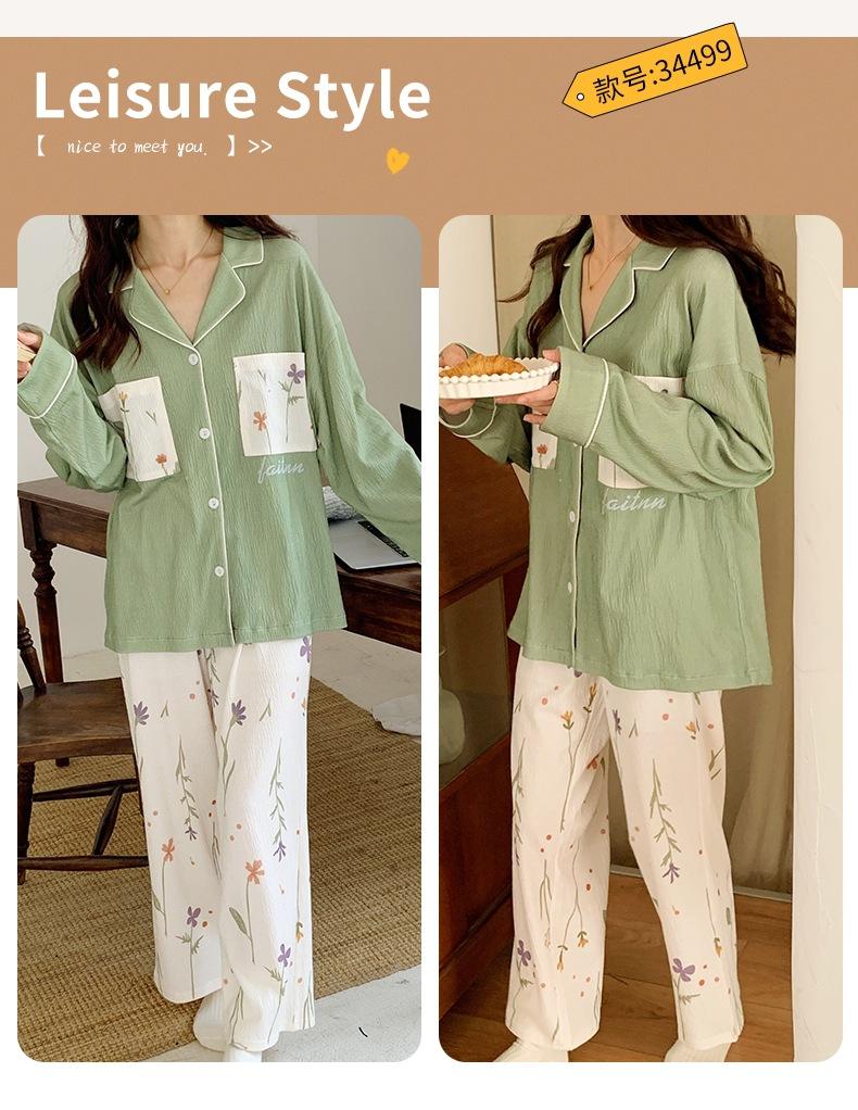 Pijamas nuevos de primavera y otoño para mujer, cárdigan de algodón tejido 6535, de tela arrugada, de manga larga, con dibujos animados, ropa para el hogar.