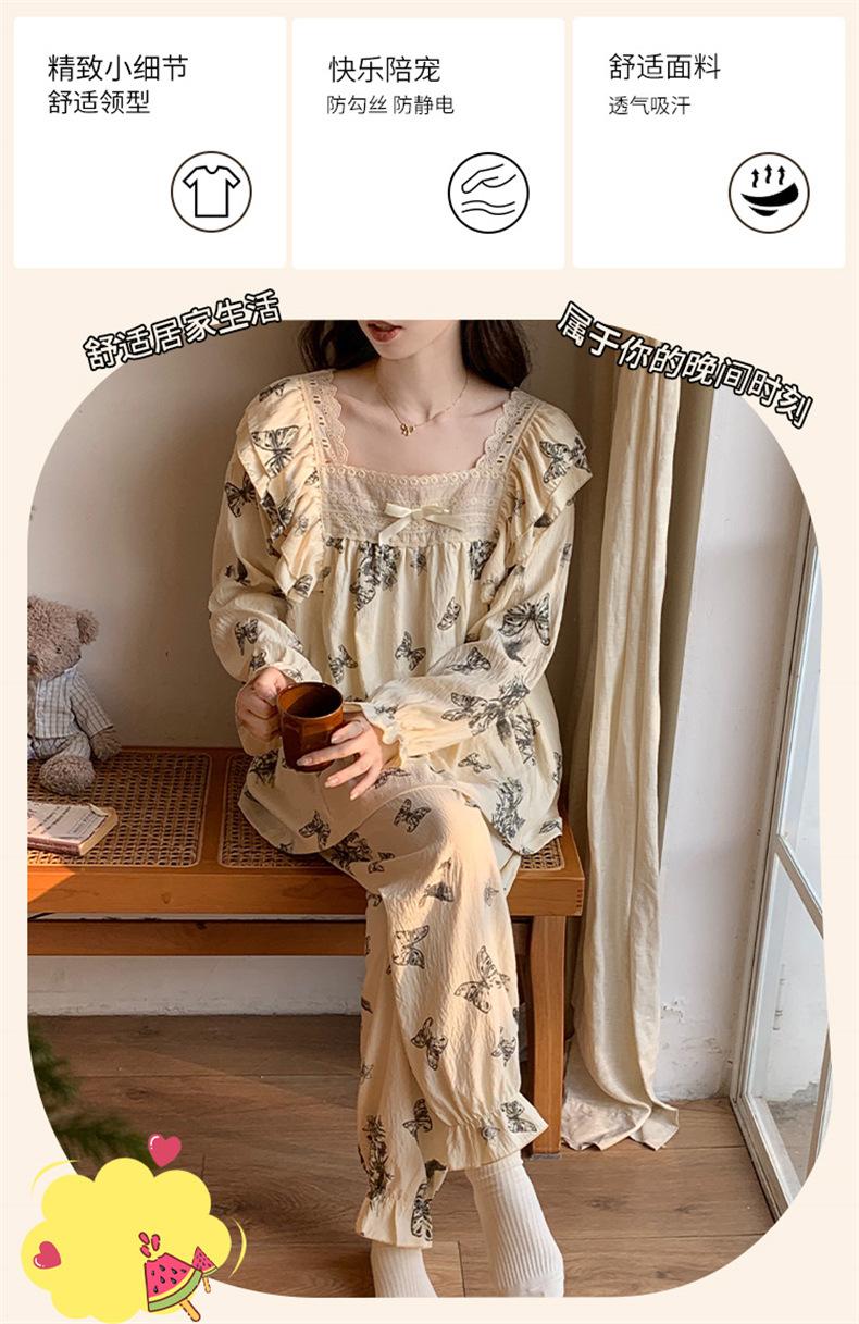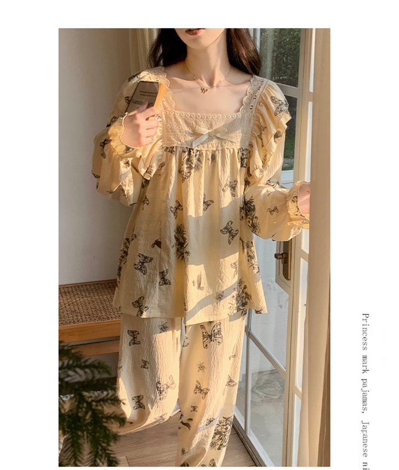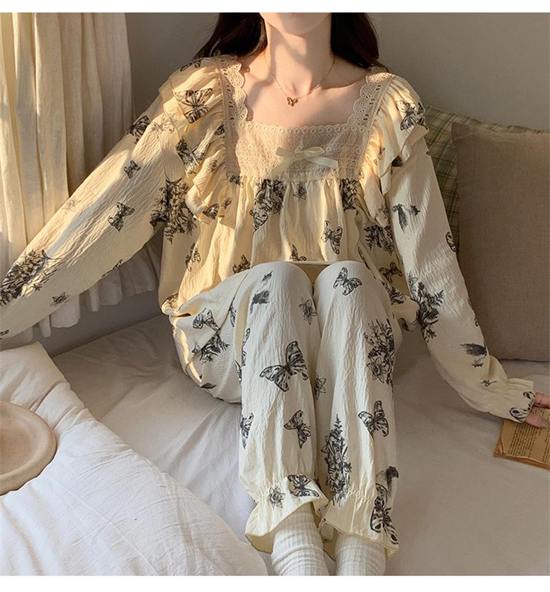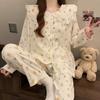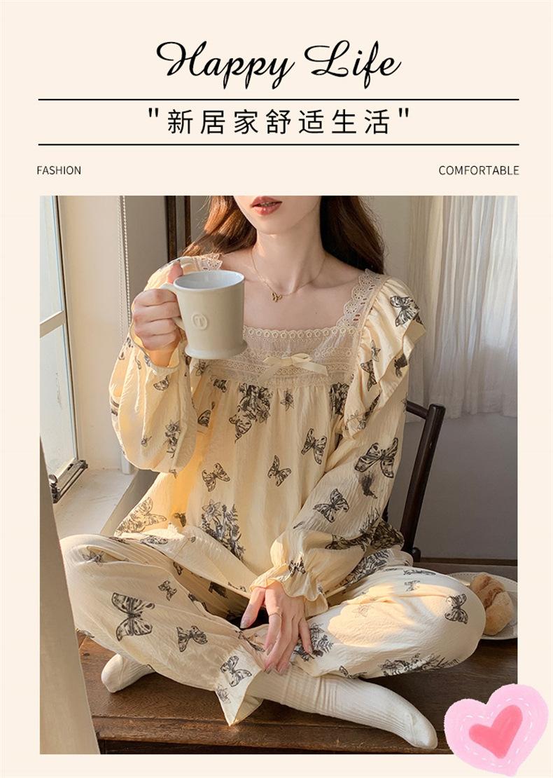Pijama de Algodón Nube para Mujer Primavera y Otoño Manga Larga Delgada Verano Encaje Estilo Princesa Corte Ropa de Exterior Traje Ropa para el Hogar