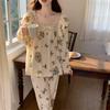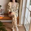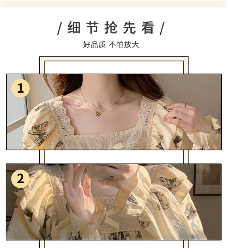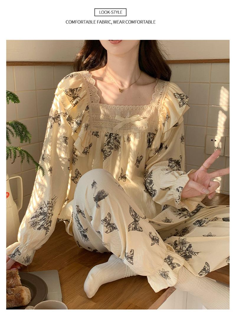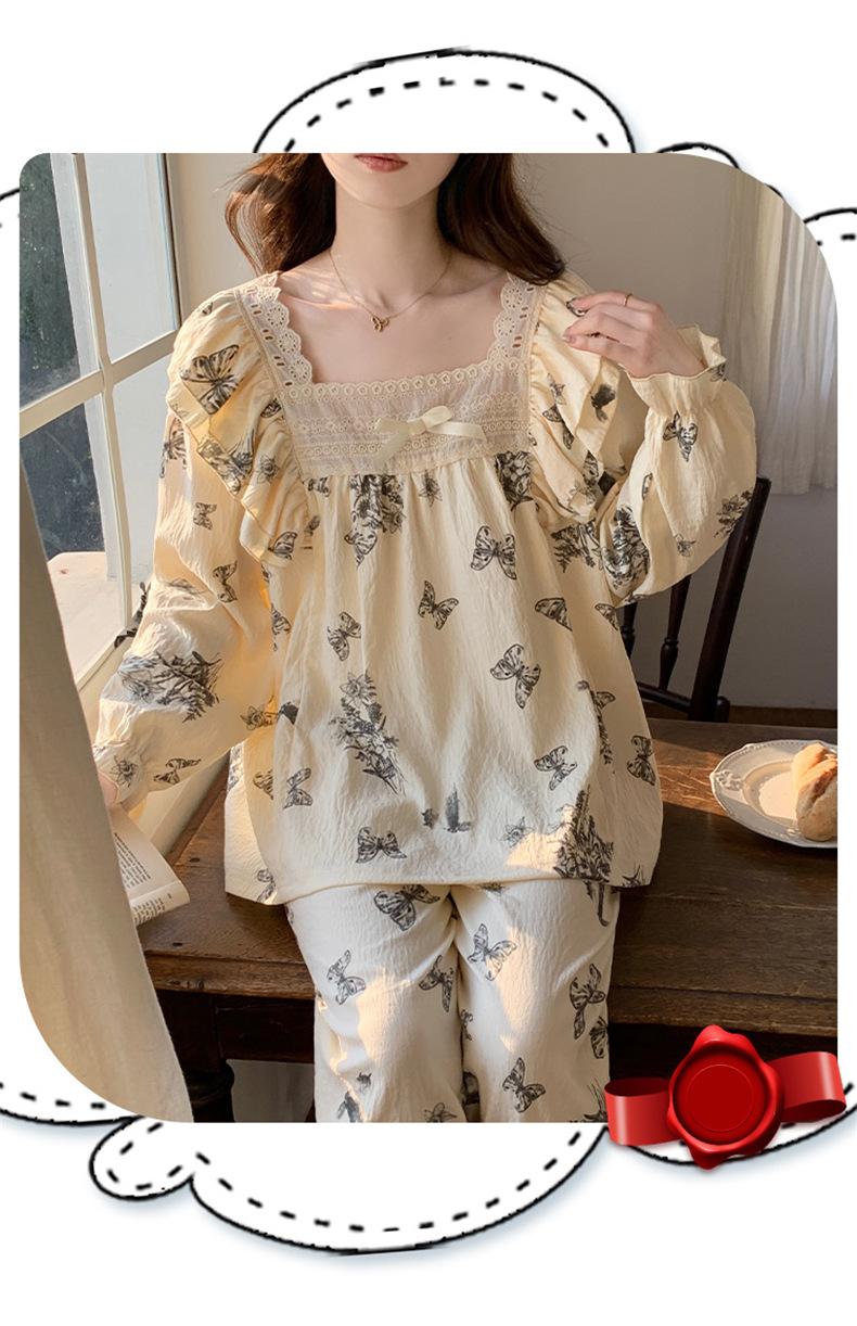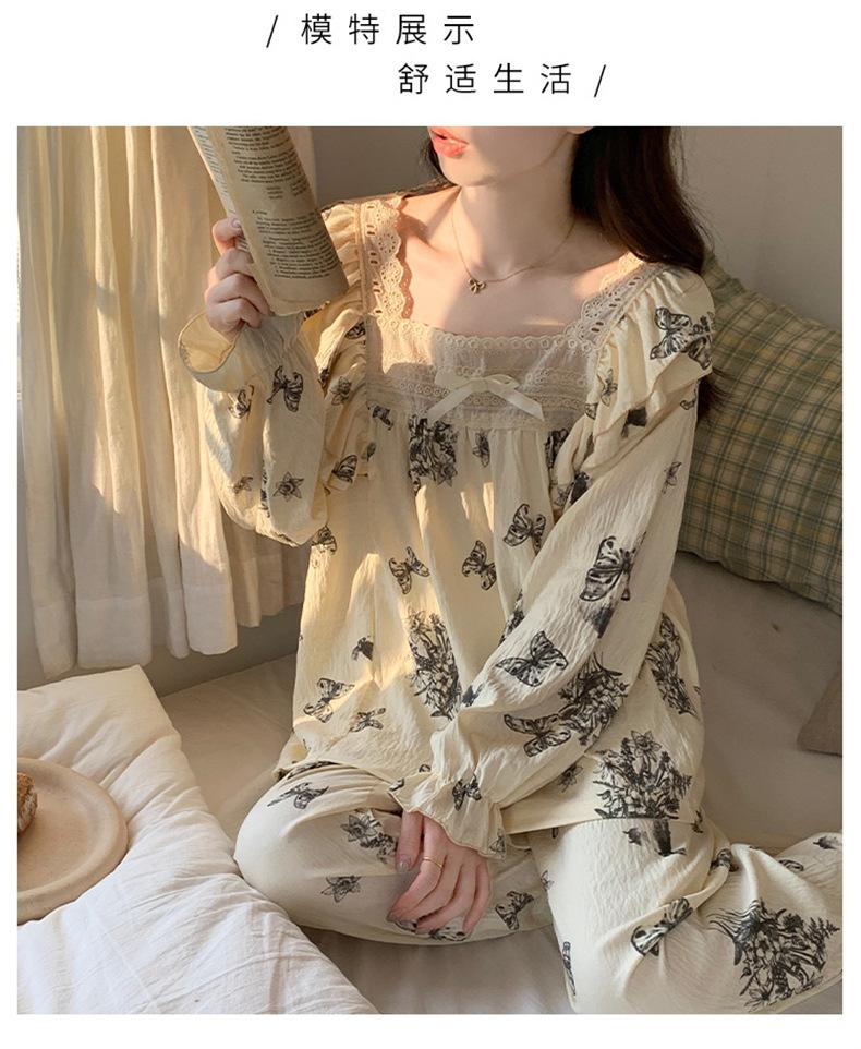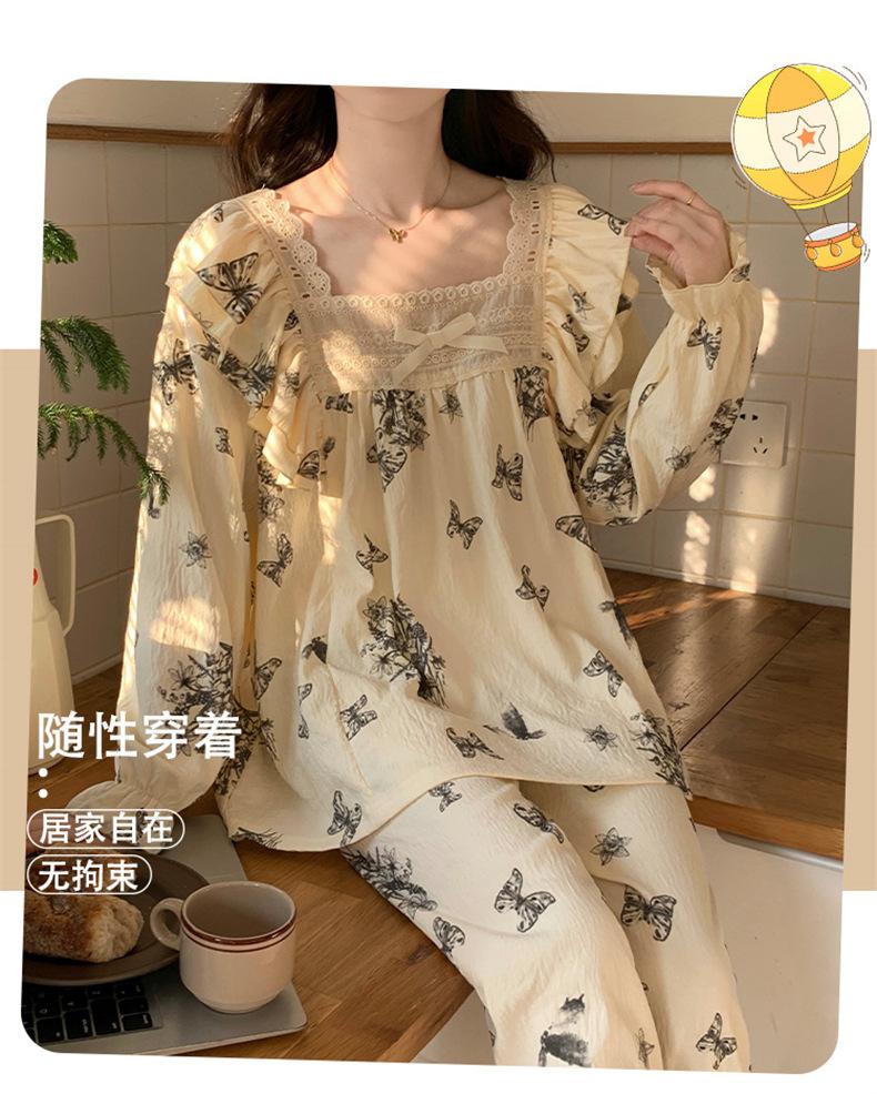 Pijama de Algodón Nube para Mujer Primavera y Otoño Manga Larga Delgada Verano Encaje Estilo Princesa Corte Ropa de Exterior Traje Ropa para el Hogar