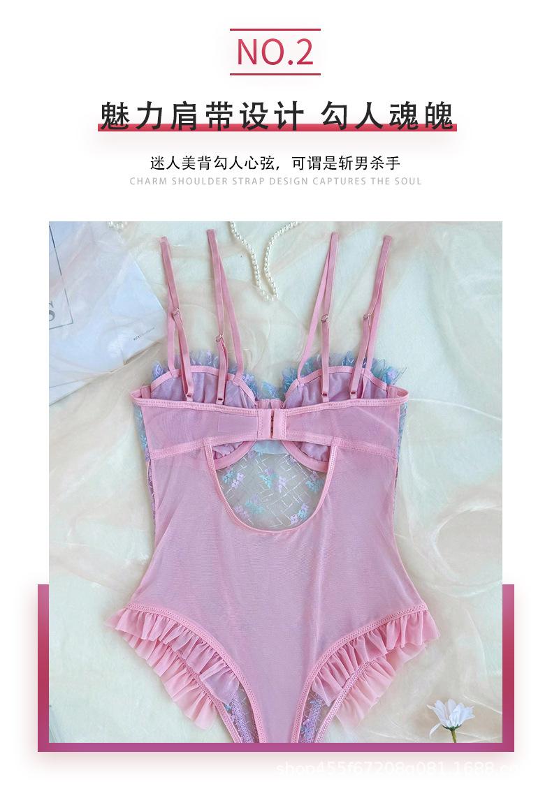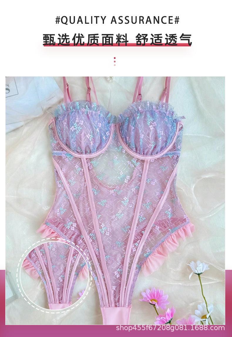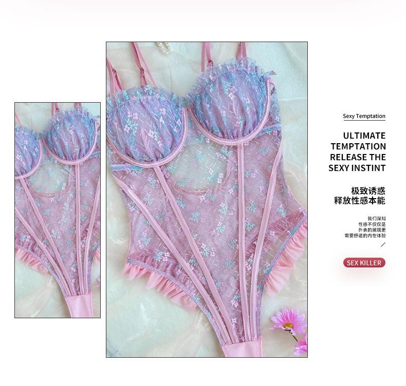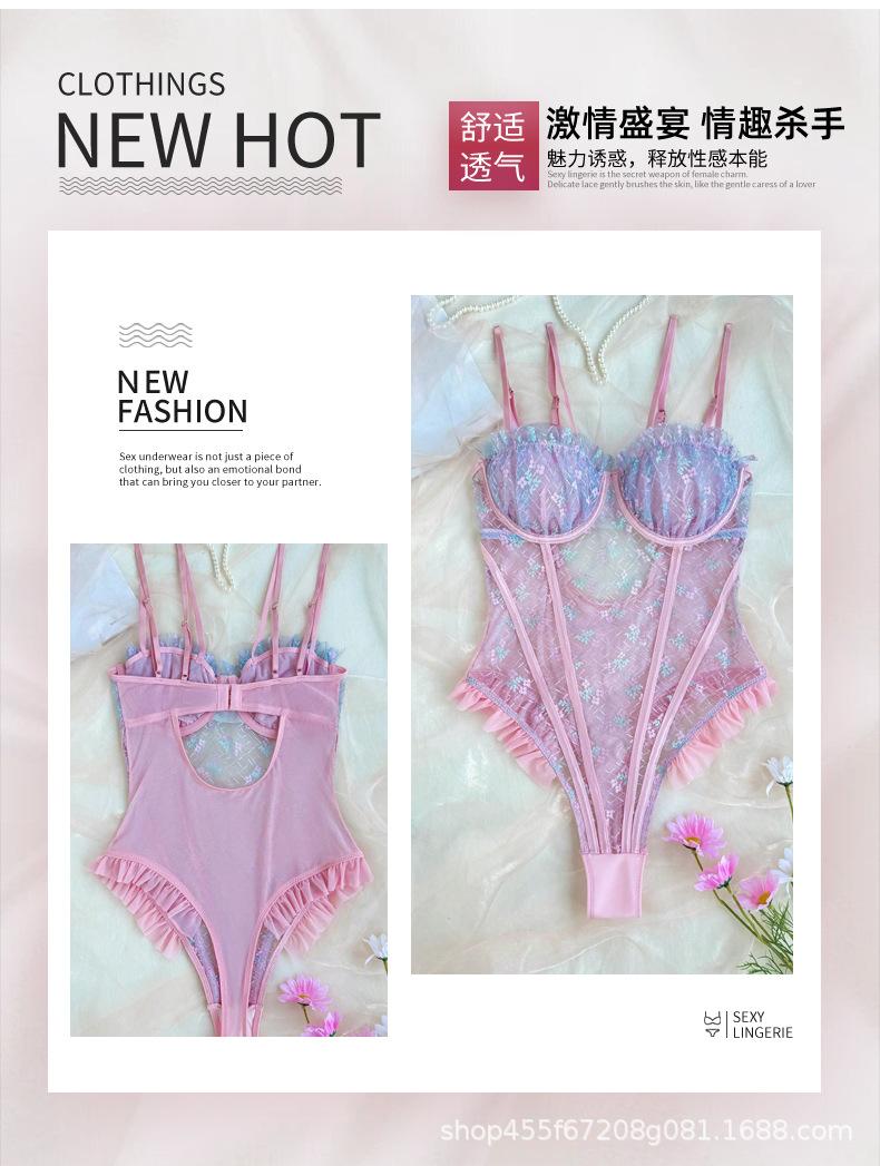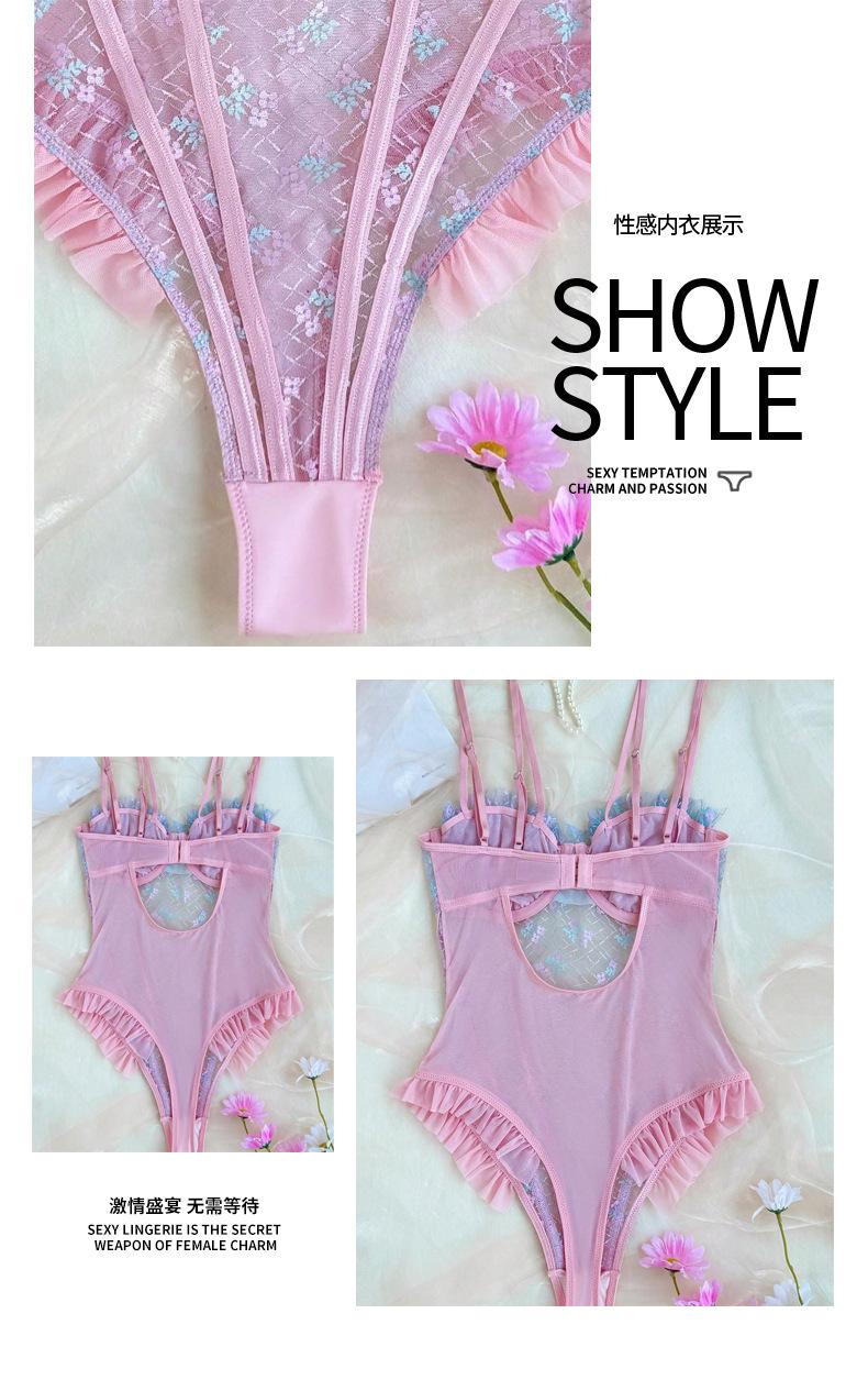 Lencería de Deseo Puro Elegante y Lujosa de Estilo Francés con Aros, Body con Tirantes, Rosa Bordado con Volantes Fruncidos Qqny