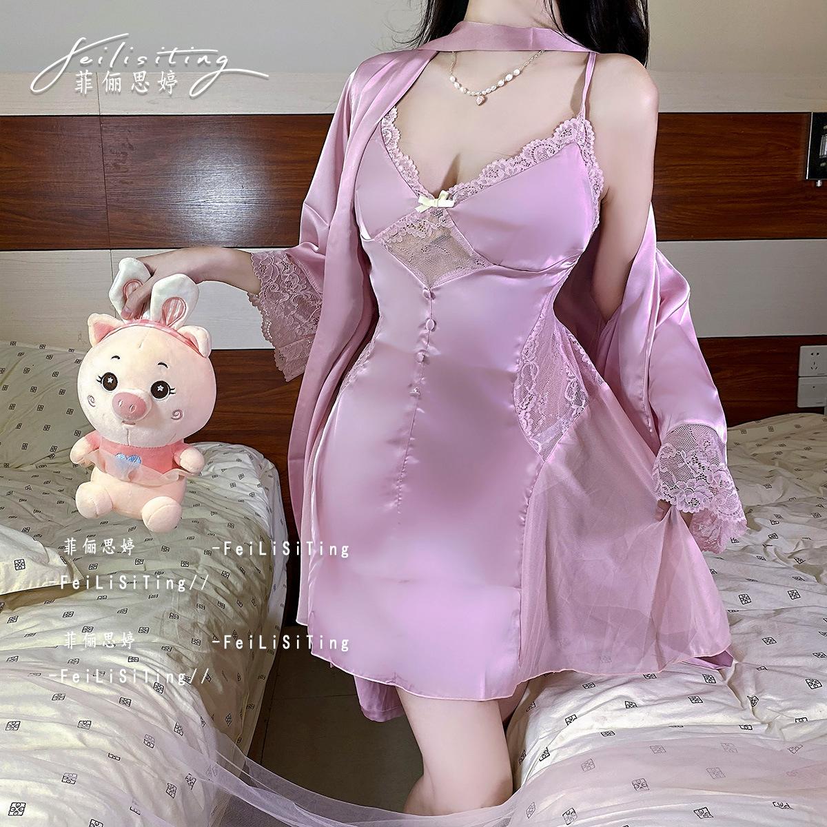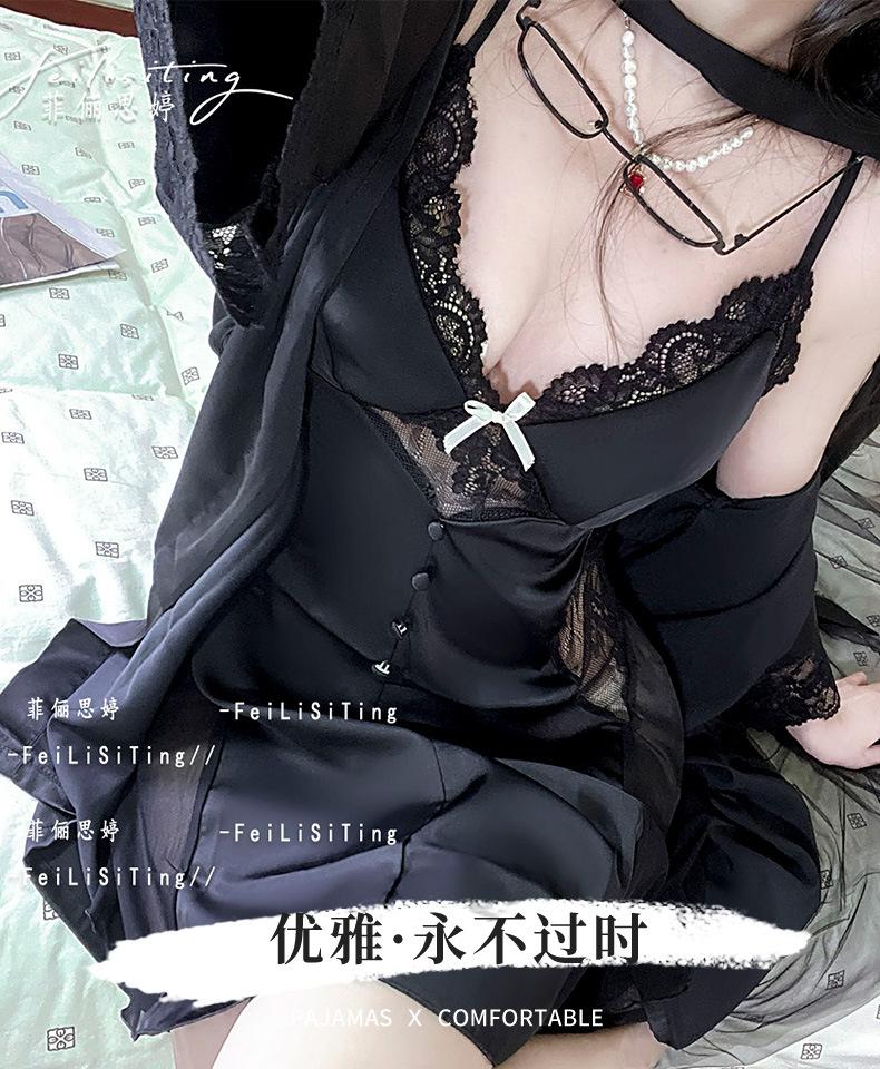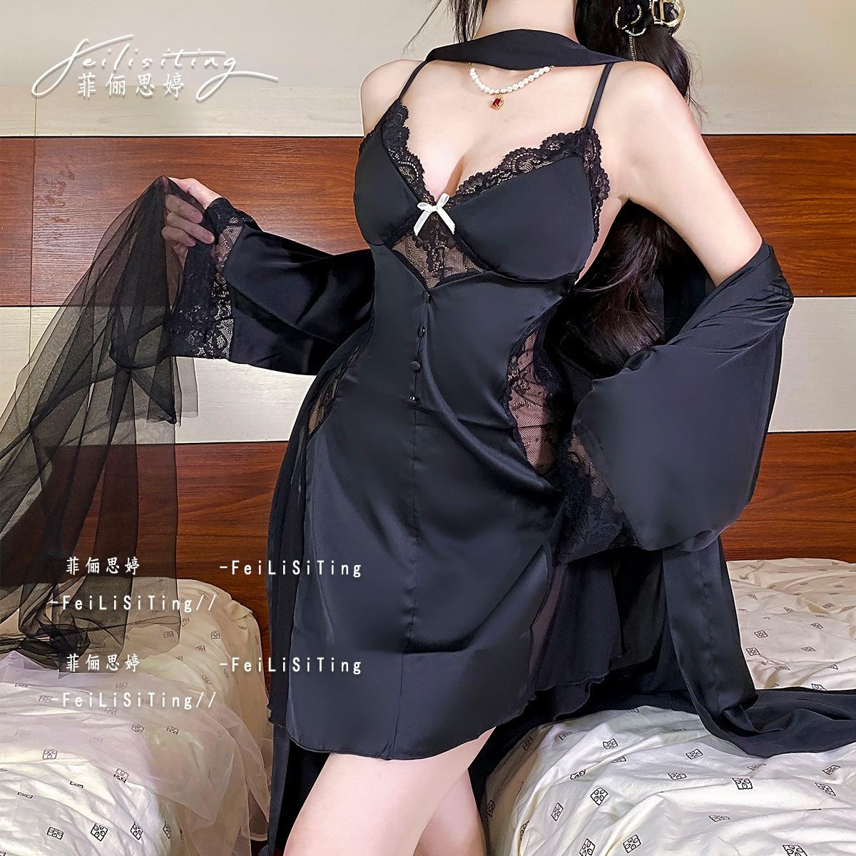 Pijama sexy de mujer con encaje negro y seda helada, camisón con tirantes finos en el pecho, Pure Desire, alta gama, verano 2024, nuevo estilo
