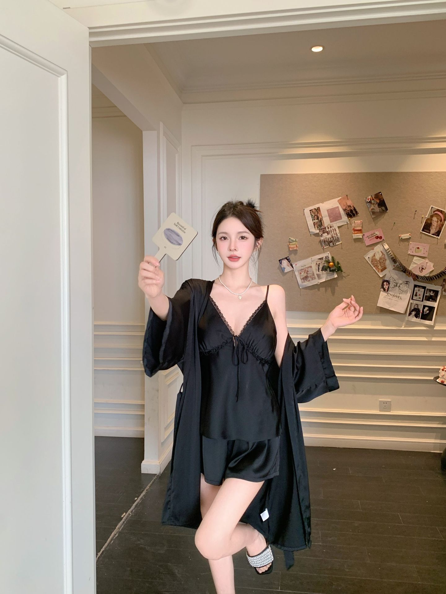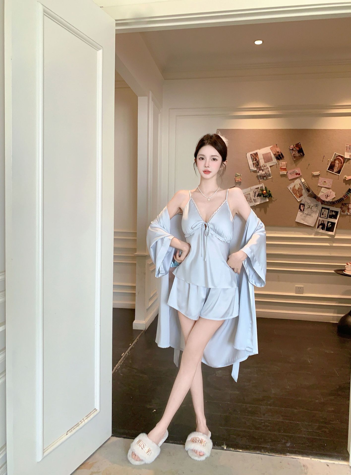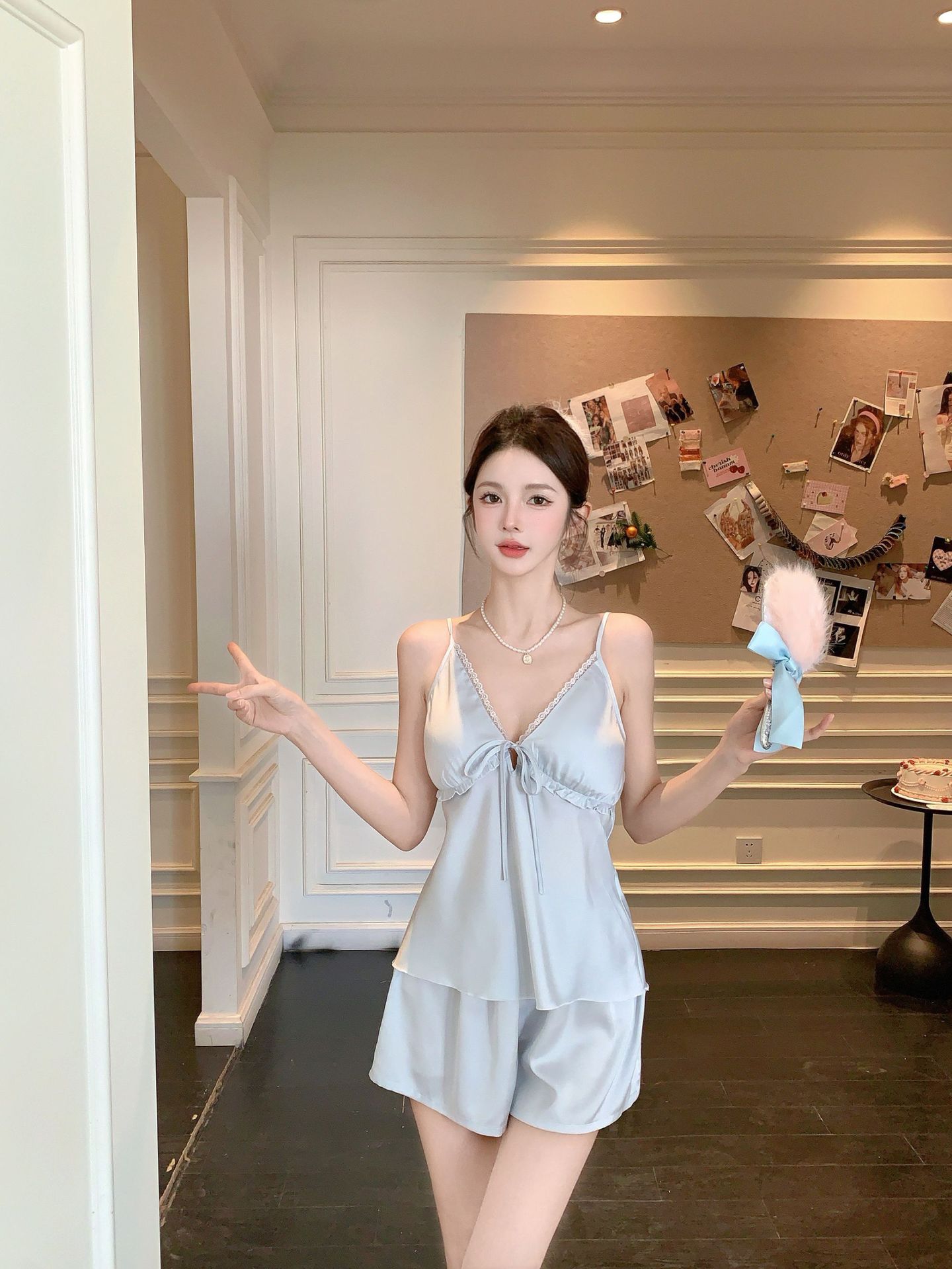 Pijama de verano sexy con escote en V y pantalones cortos con tirantes, conjunto de tres piezas para mujer, ropa de casa fresca de seda helada dulce, estilo Ins