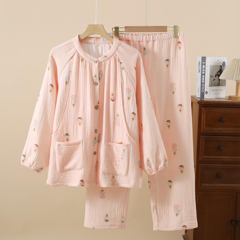 Pijama de Gasa de Algodón de Cuatro Capas para Mujeres Embarazadas Primavera, Otoño e Invierno Ropa de Luna Engrosada Ropa de Algodón para el Hogar para el Embarazo y la Lactancia Postparto