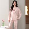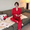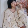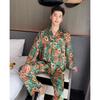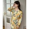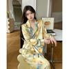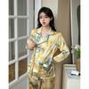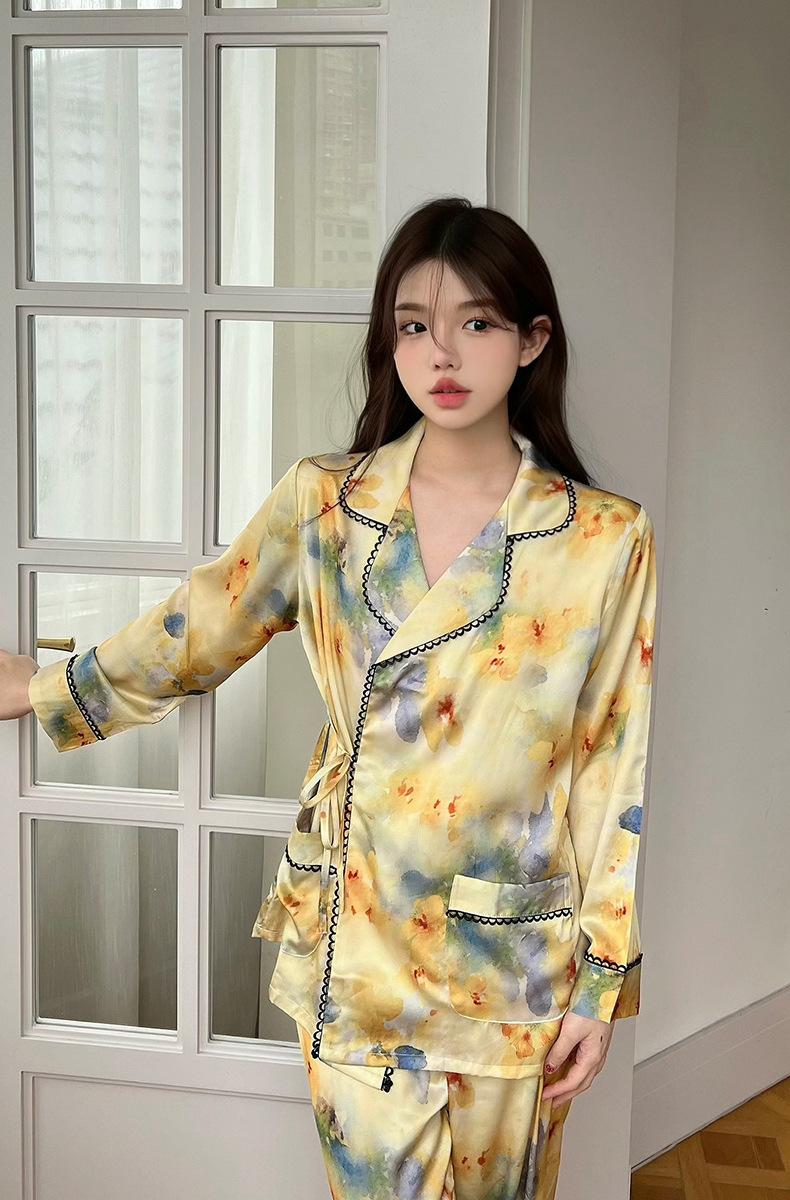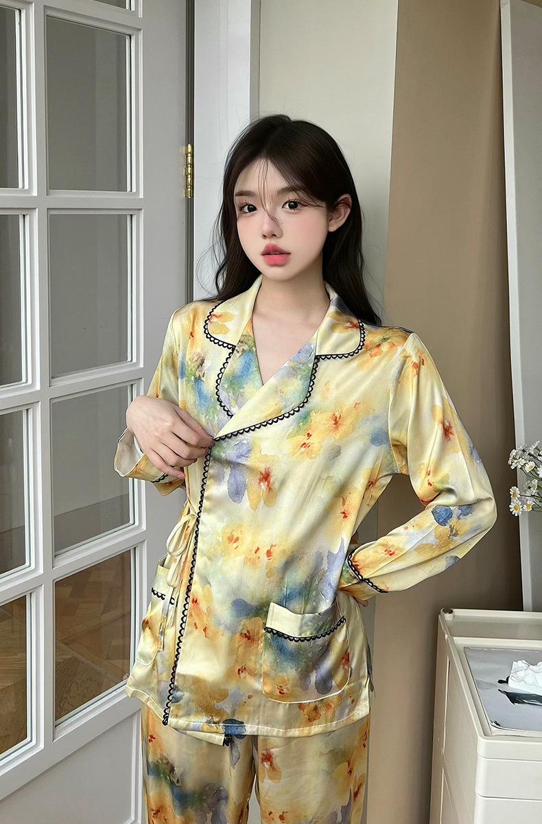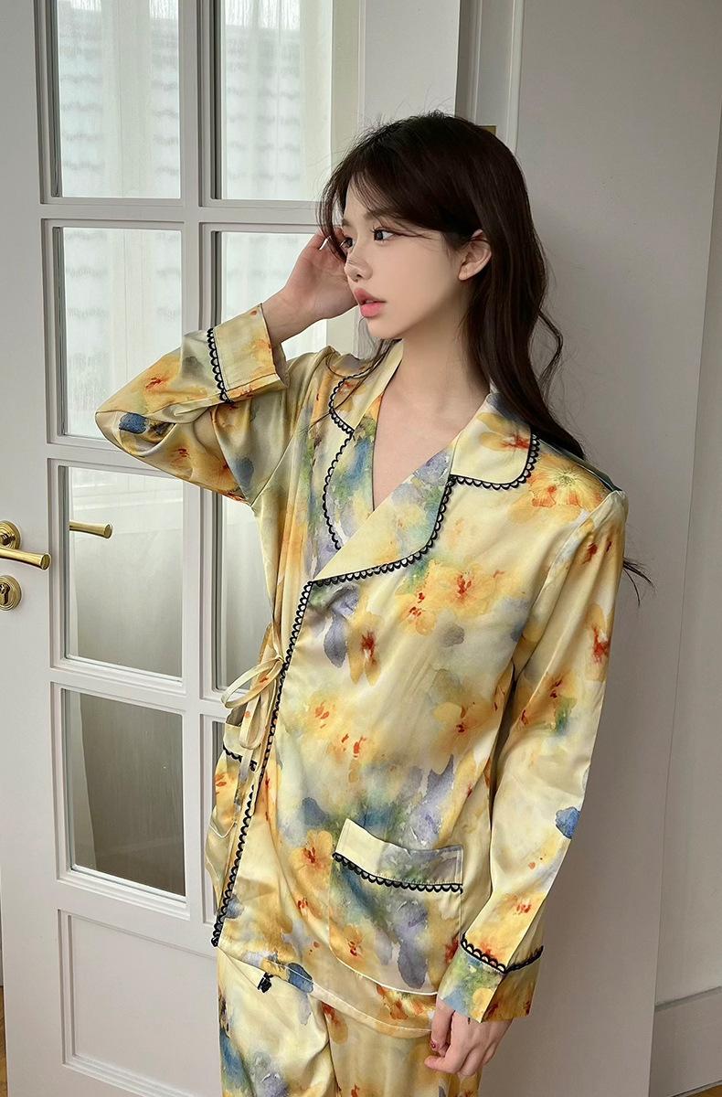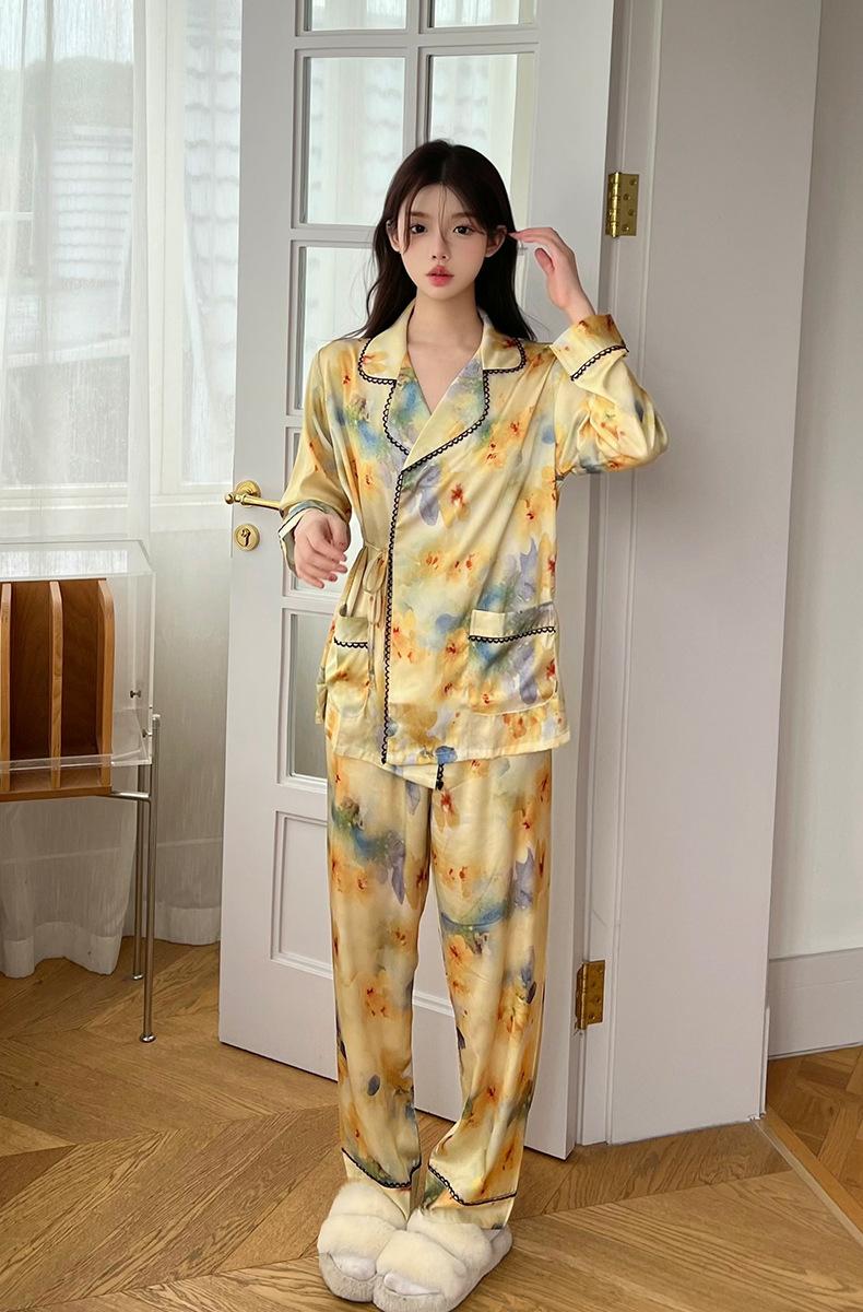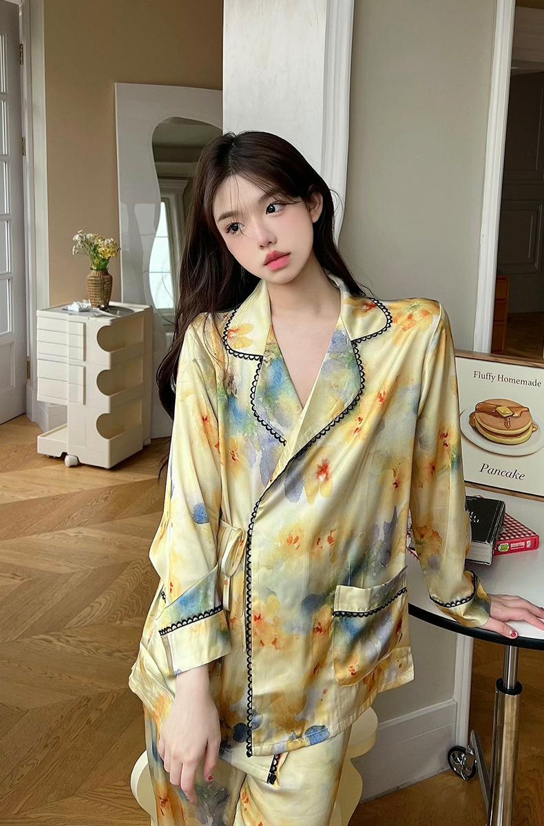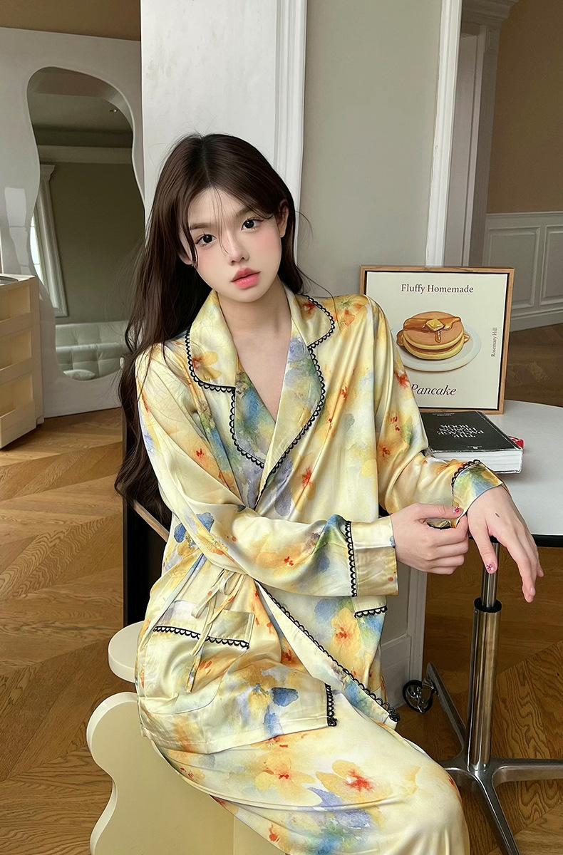 Pijama de mujer estilo pintura al óleo con cordones de flores, de seda helada de principios de primavera, de manga larga, cálido y cómodo, para el hogar.