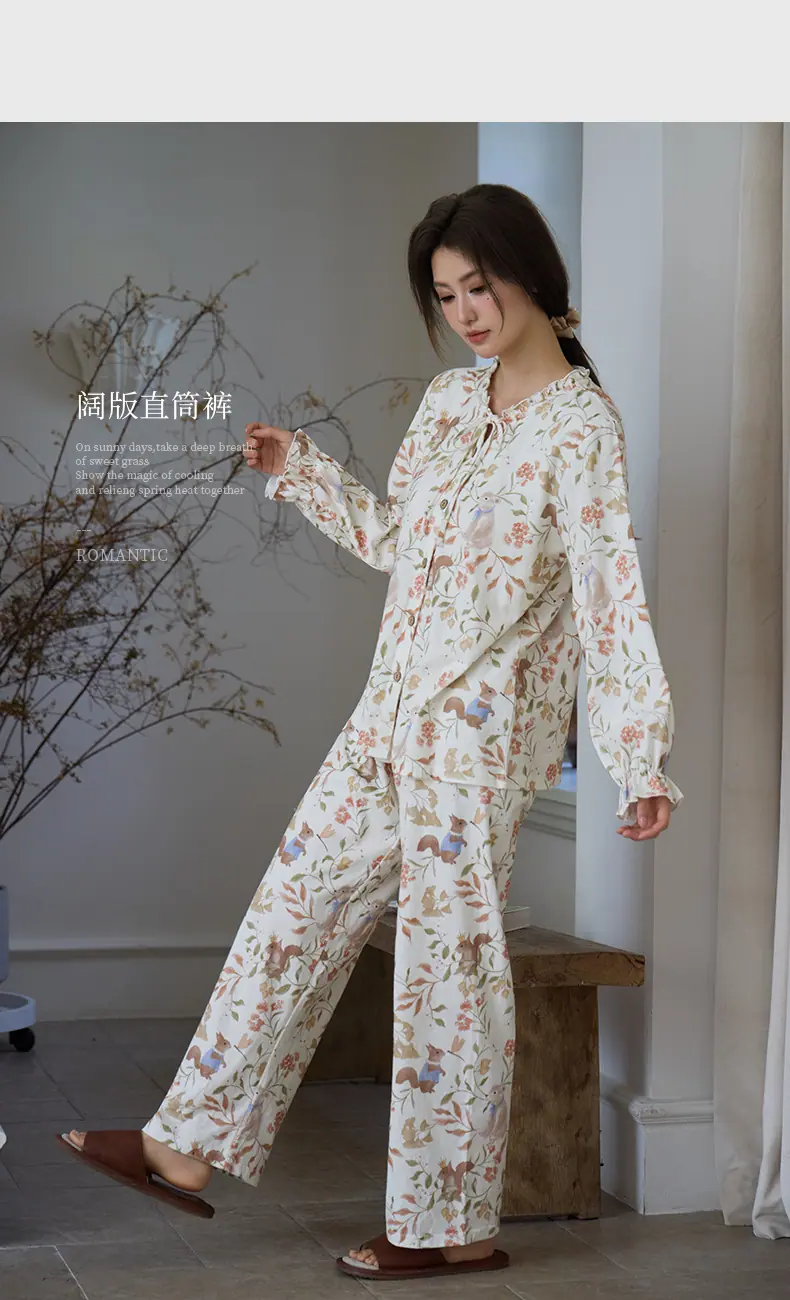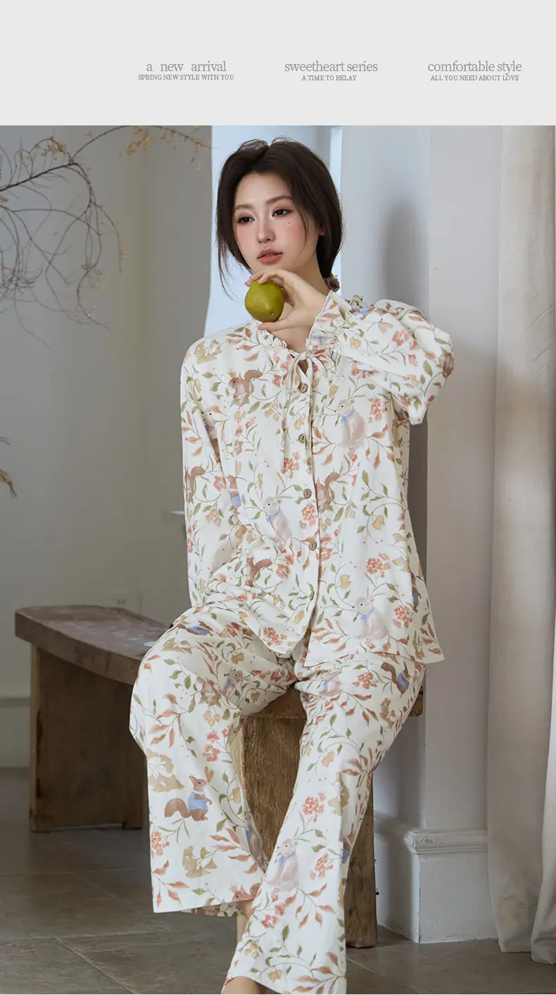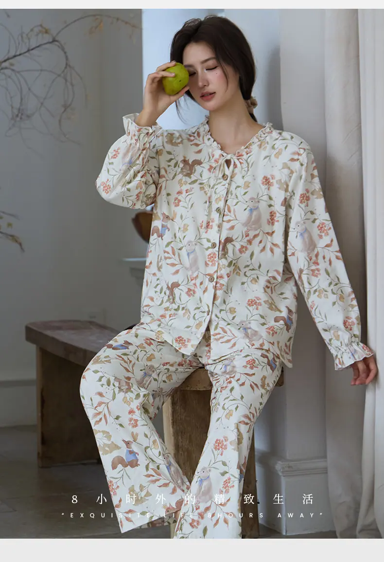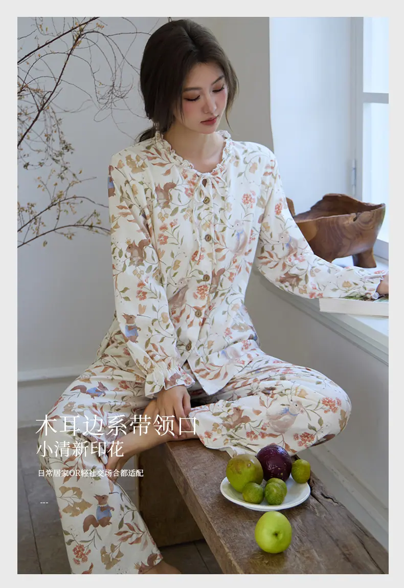 Pijama de Punto de Algodón Puro para Mujer, Nuevo Estilo Pastoral con Almohadillas en el Pecho, Primavera, Otoño e Invierno, Conjunto de Ropa para el Hogar de Manga Larga Estampado de Algodón Puro