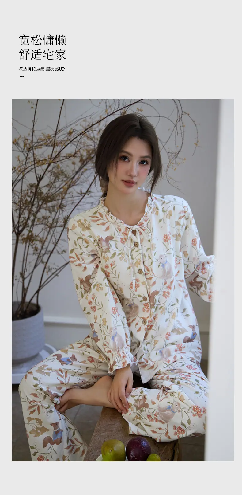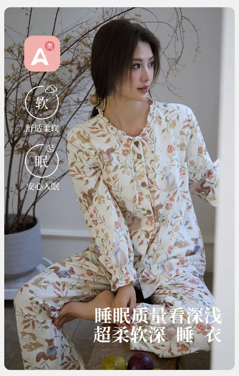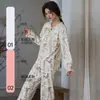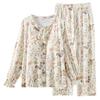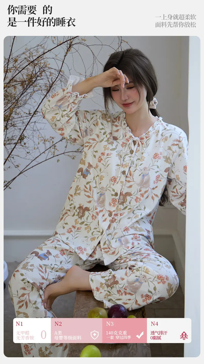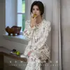 Pijama de Punto de Algodón Puro para Mujer, Nuevo Estilo Pastoral con Almohadillas en el Pecho, Primavera, Otoño e Invierno, Conjunto de Ropa para el Hogar de Manga Larga Estampado de Algodón Puro