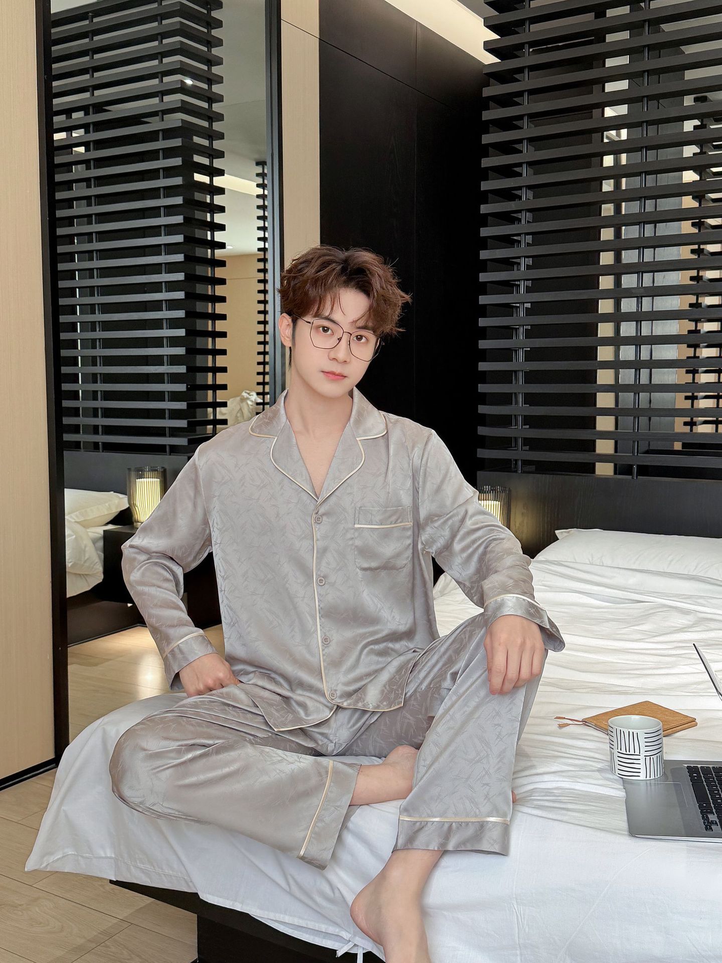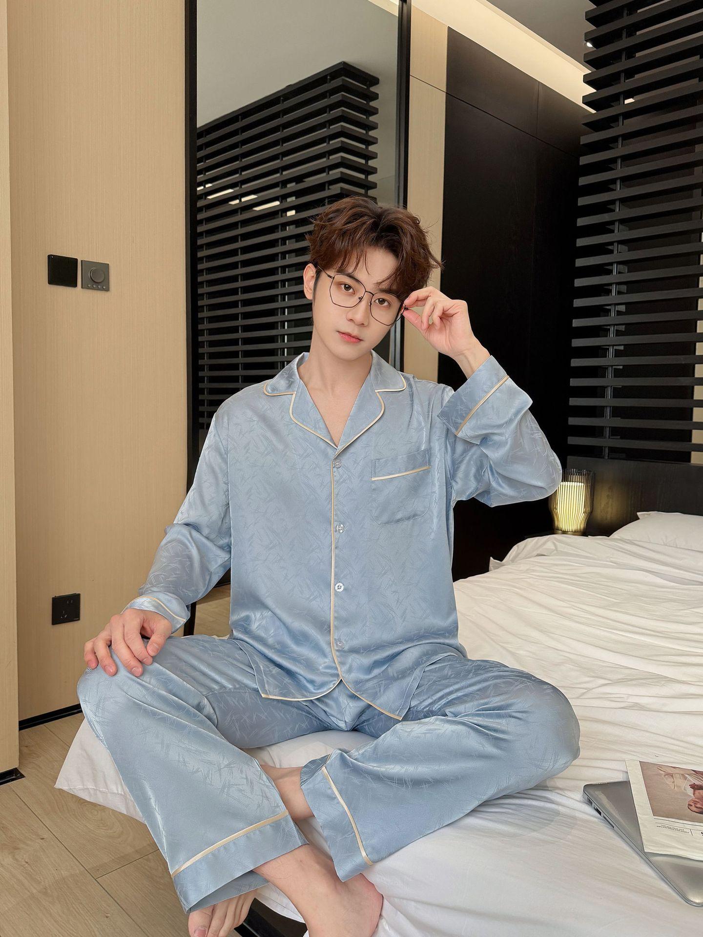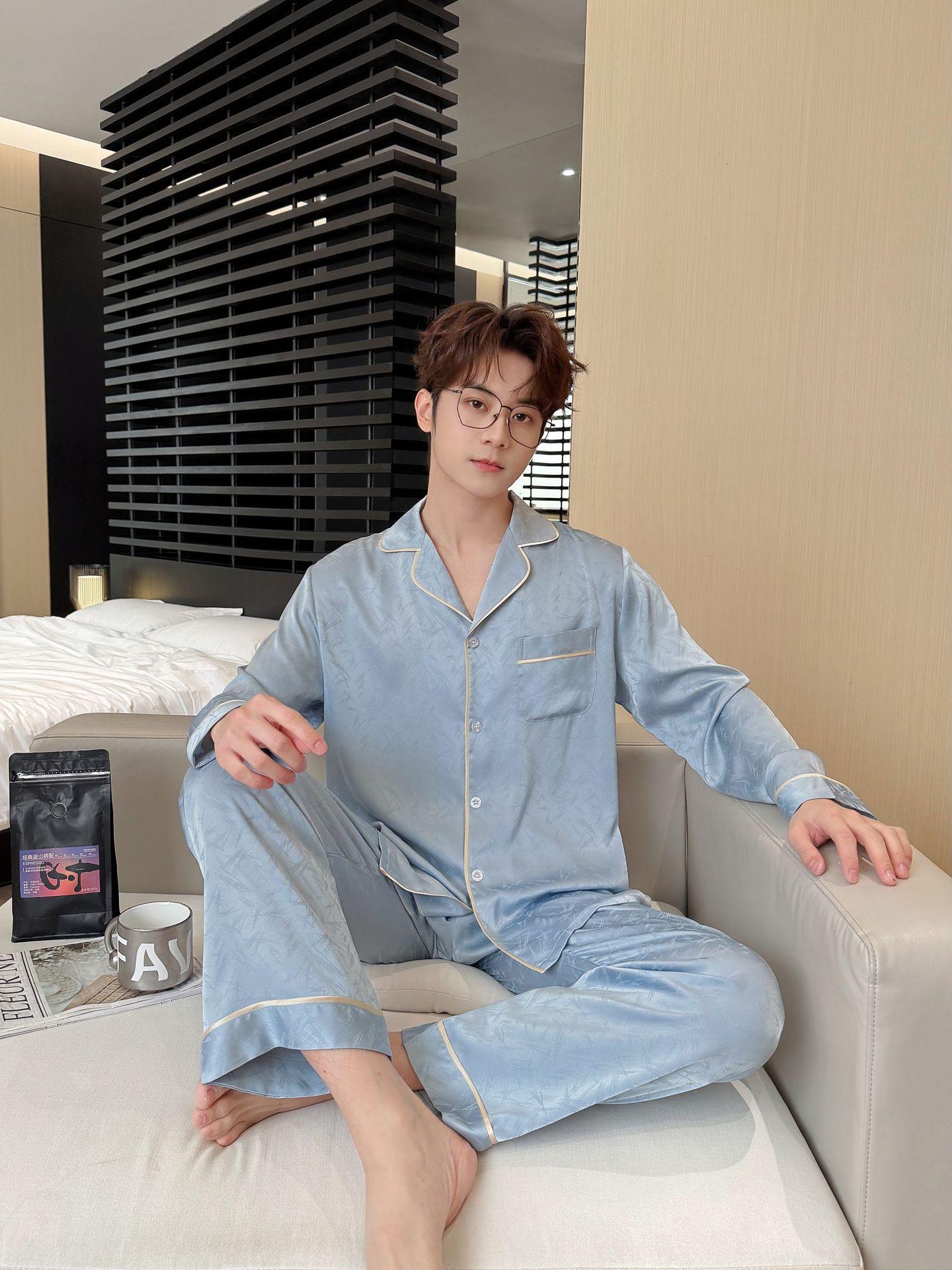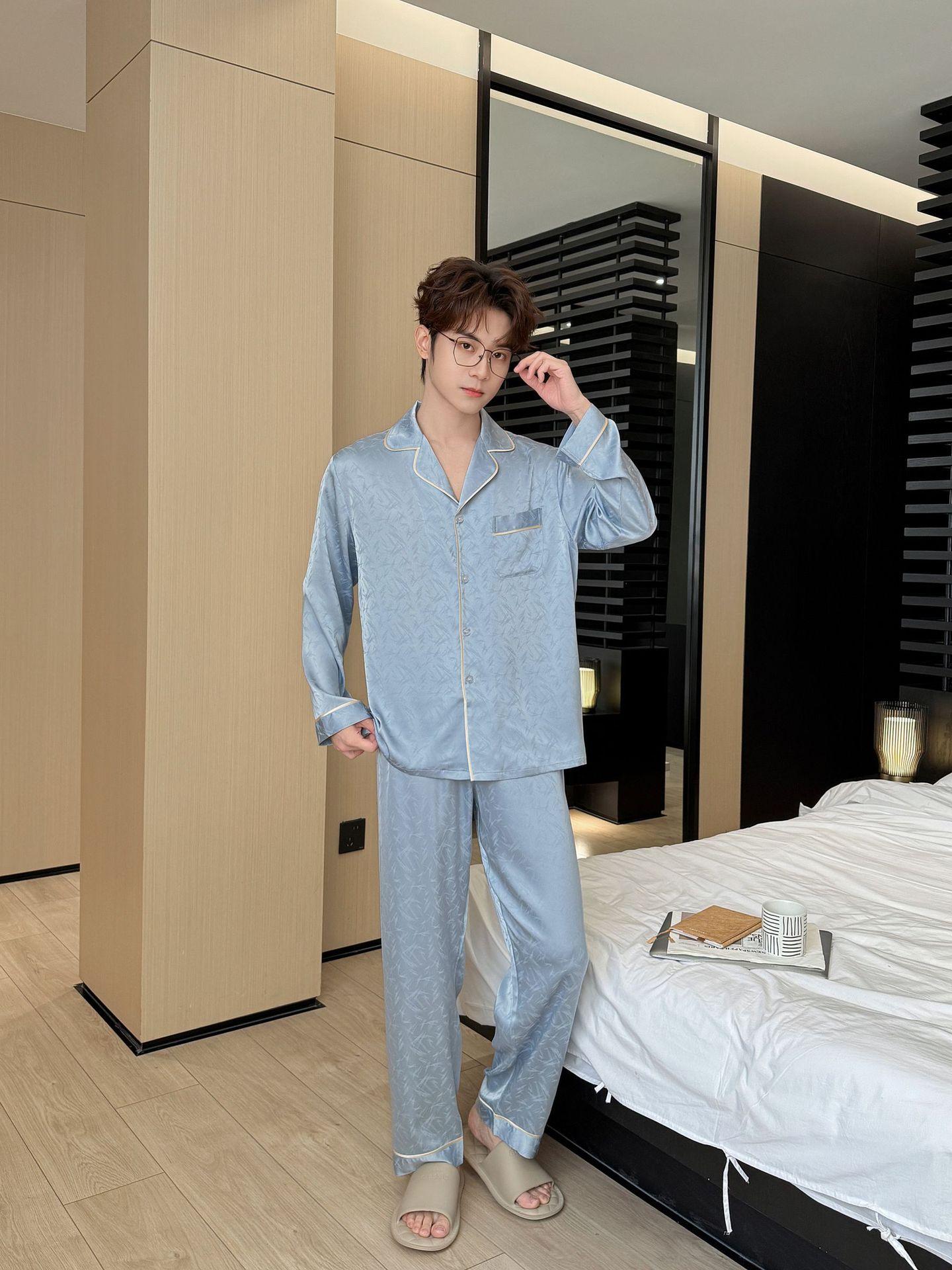 Pijamas para hombre, primavera y otoño, manga larga, seda fina de hielo, jacquard de alta calidad, tallas grandes, ropa de abrigo, ropa de casa, traje de otoño N256