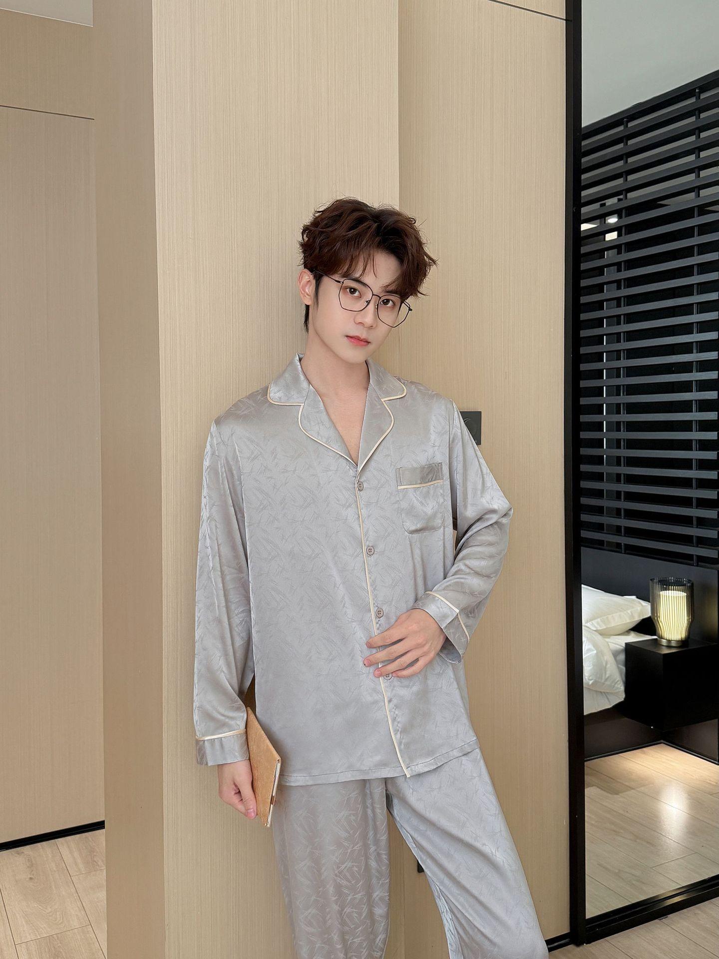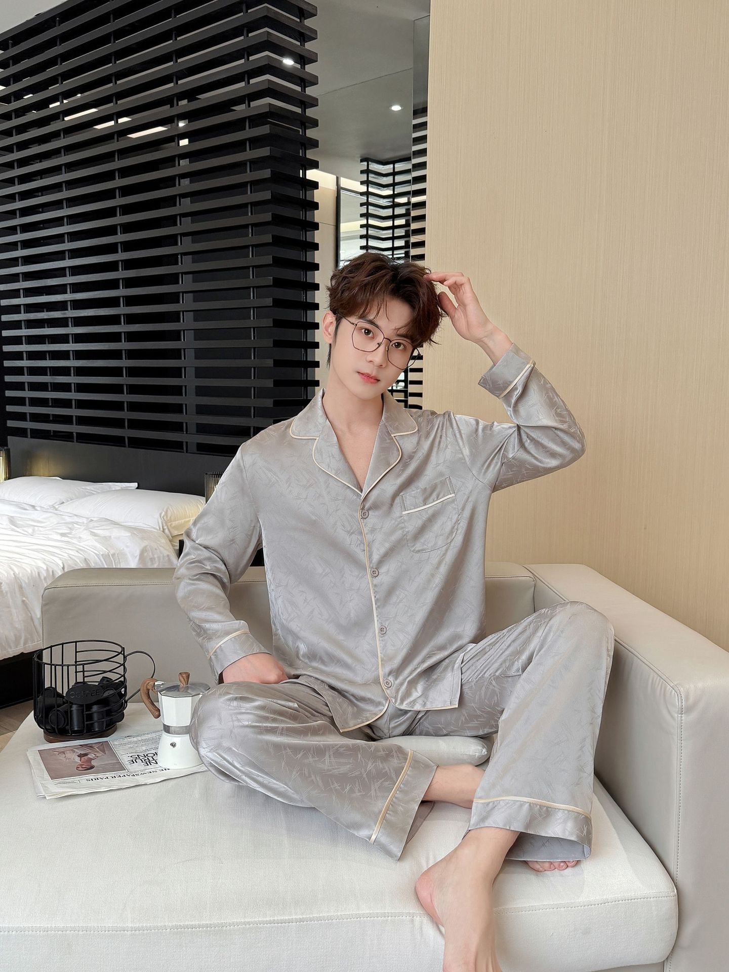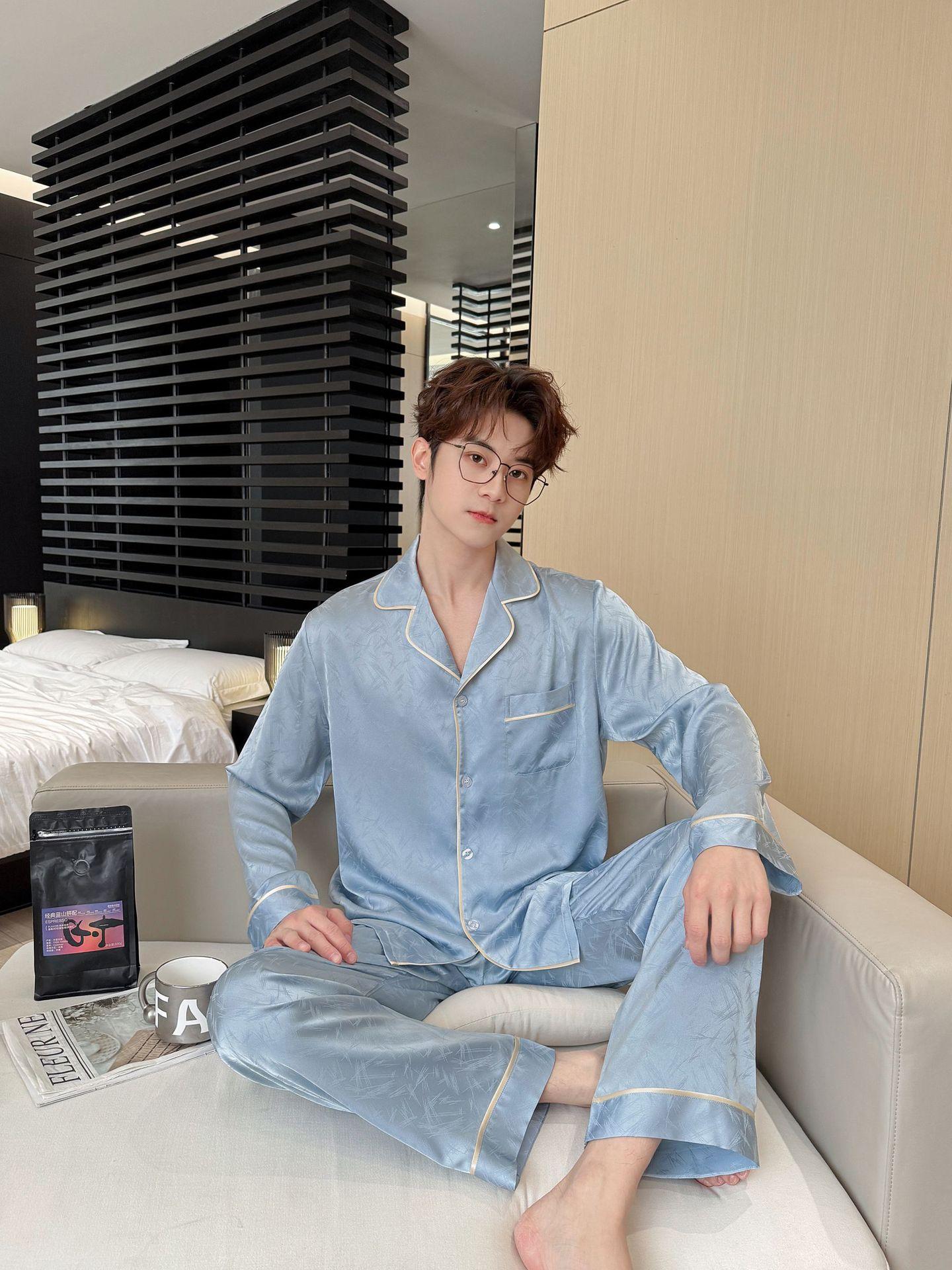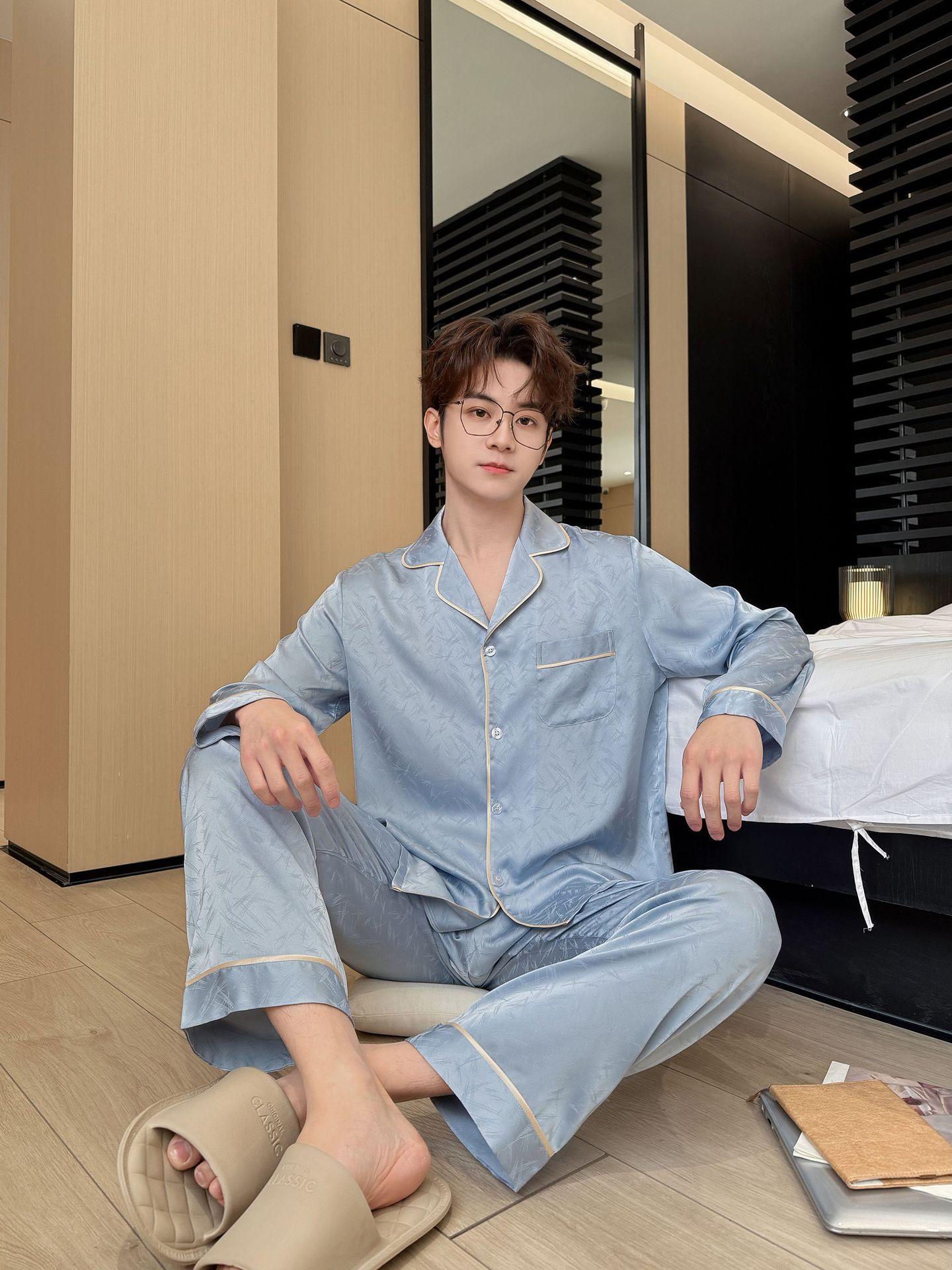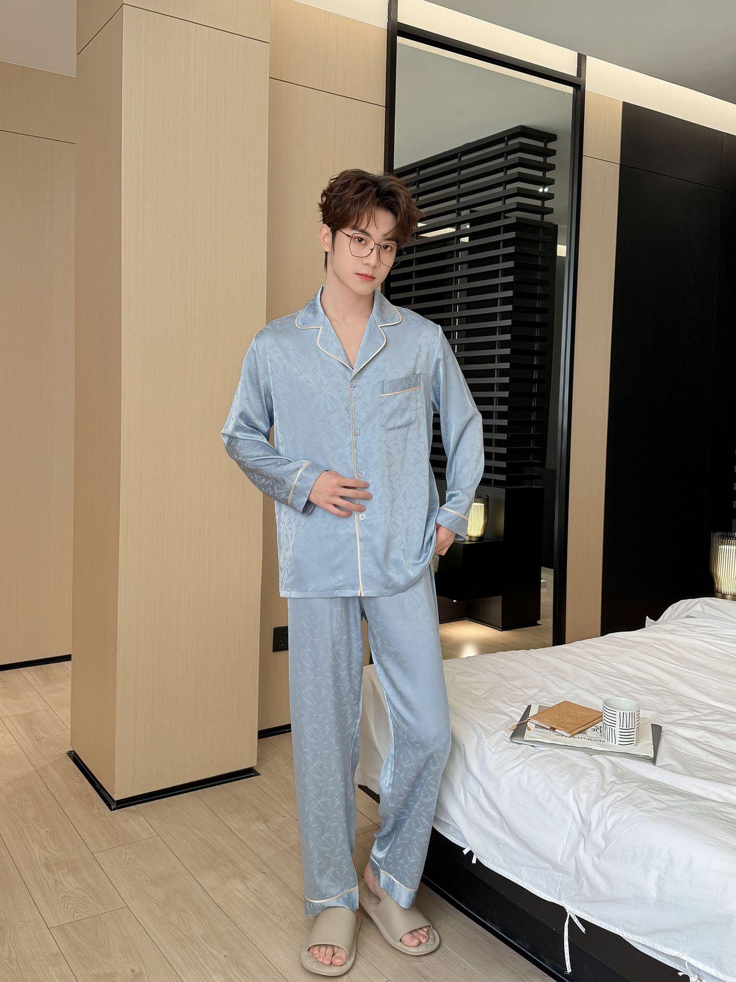 Pijamas para hombre, primavera y otoño, manga larga, seda fina de hielo, jacquard de alta calidad, tallas grandes, ropa de abrigo, ropa de casa, traje de otoño N256