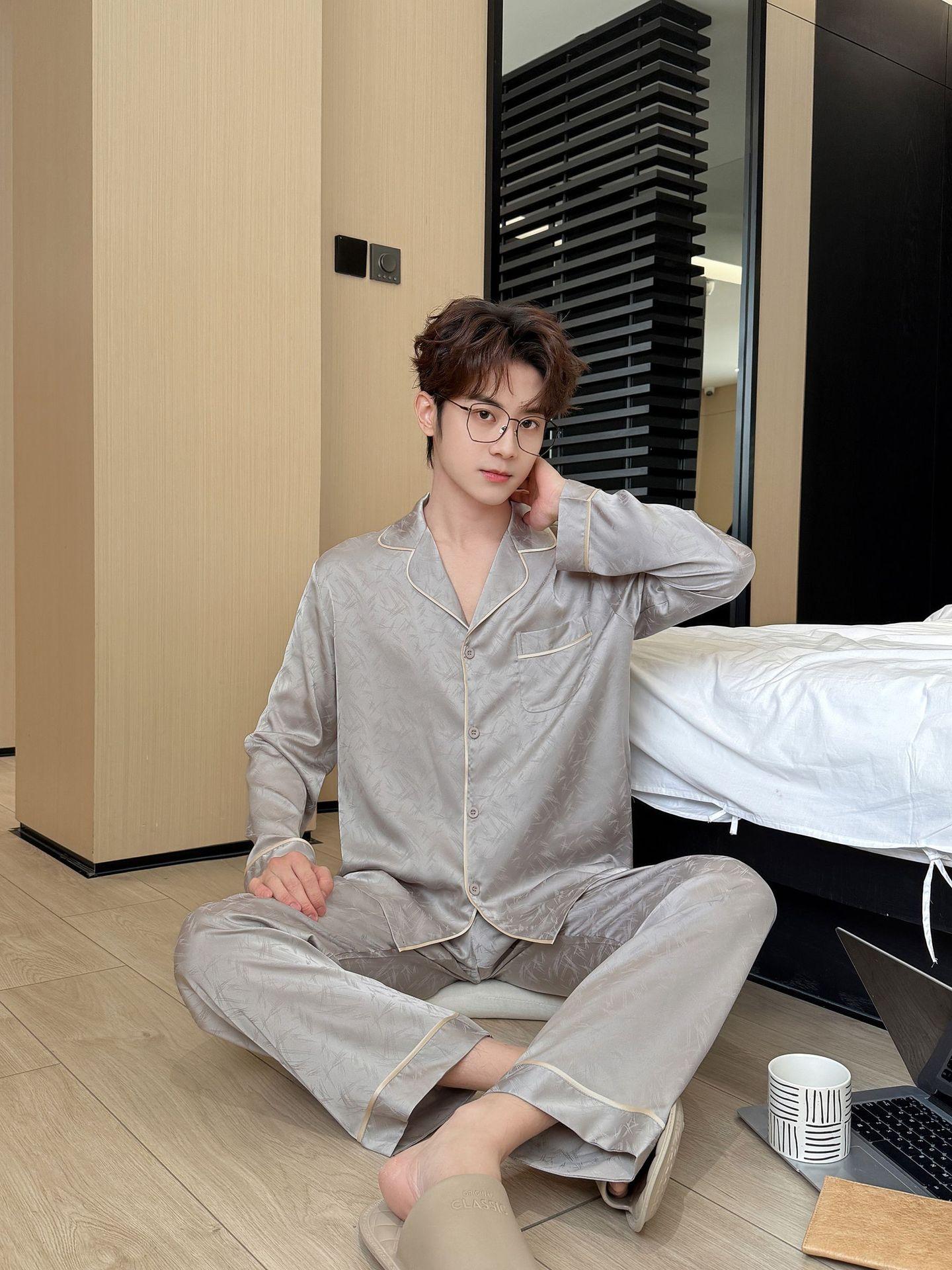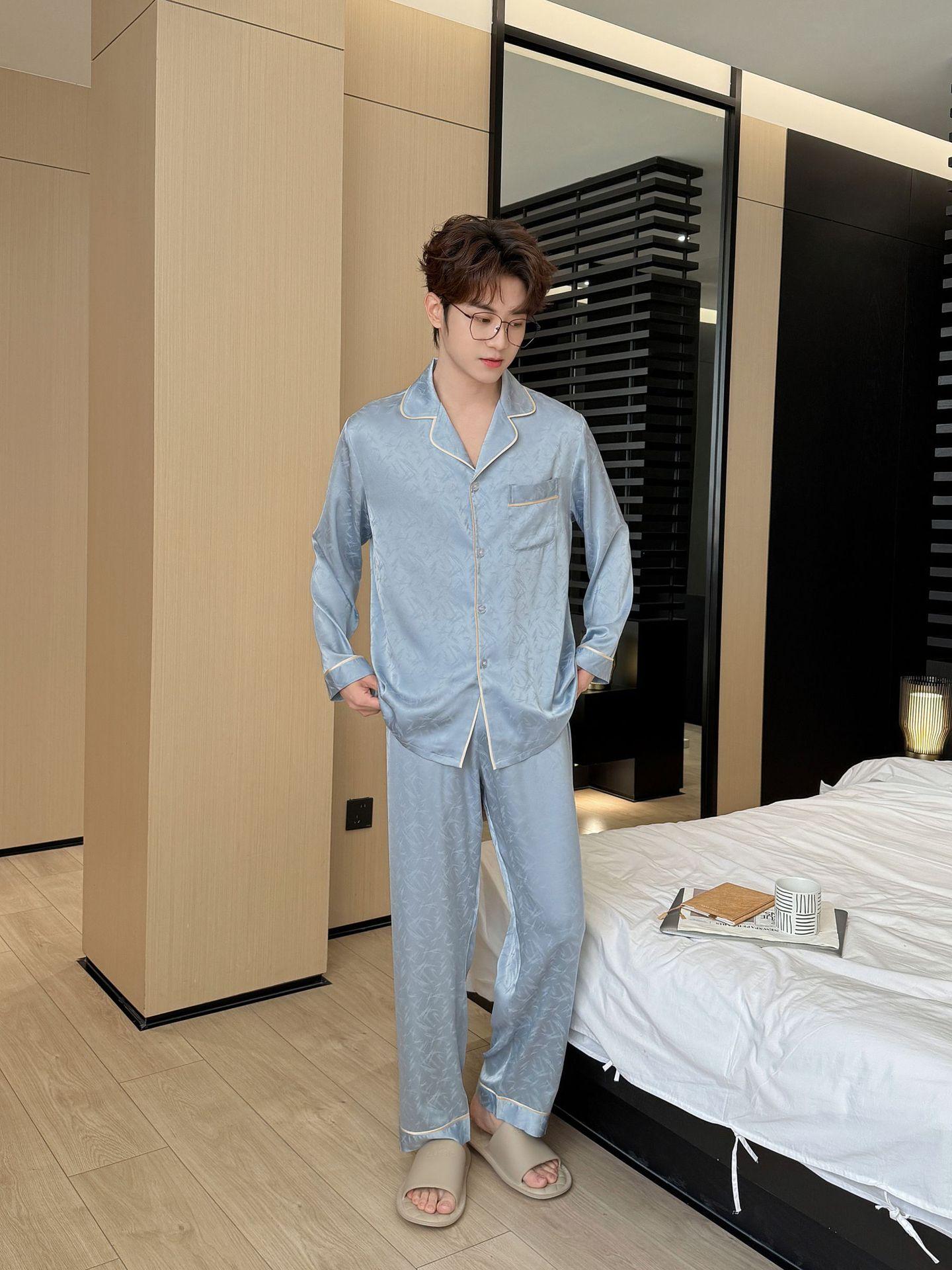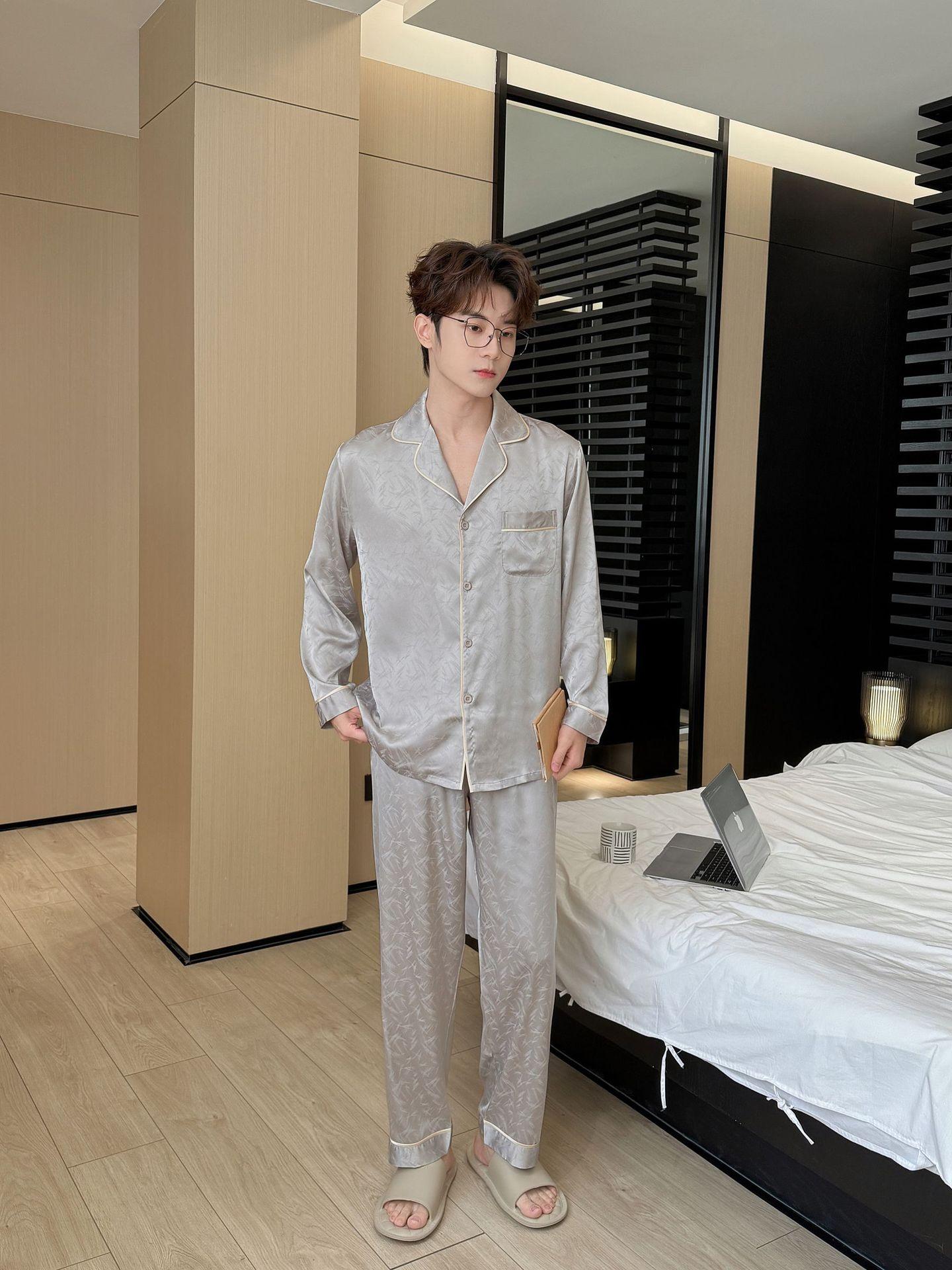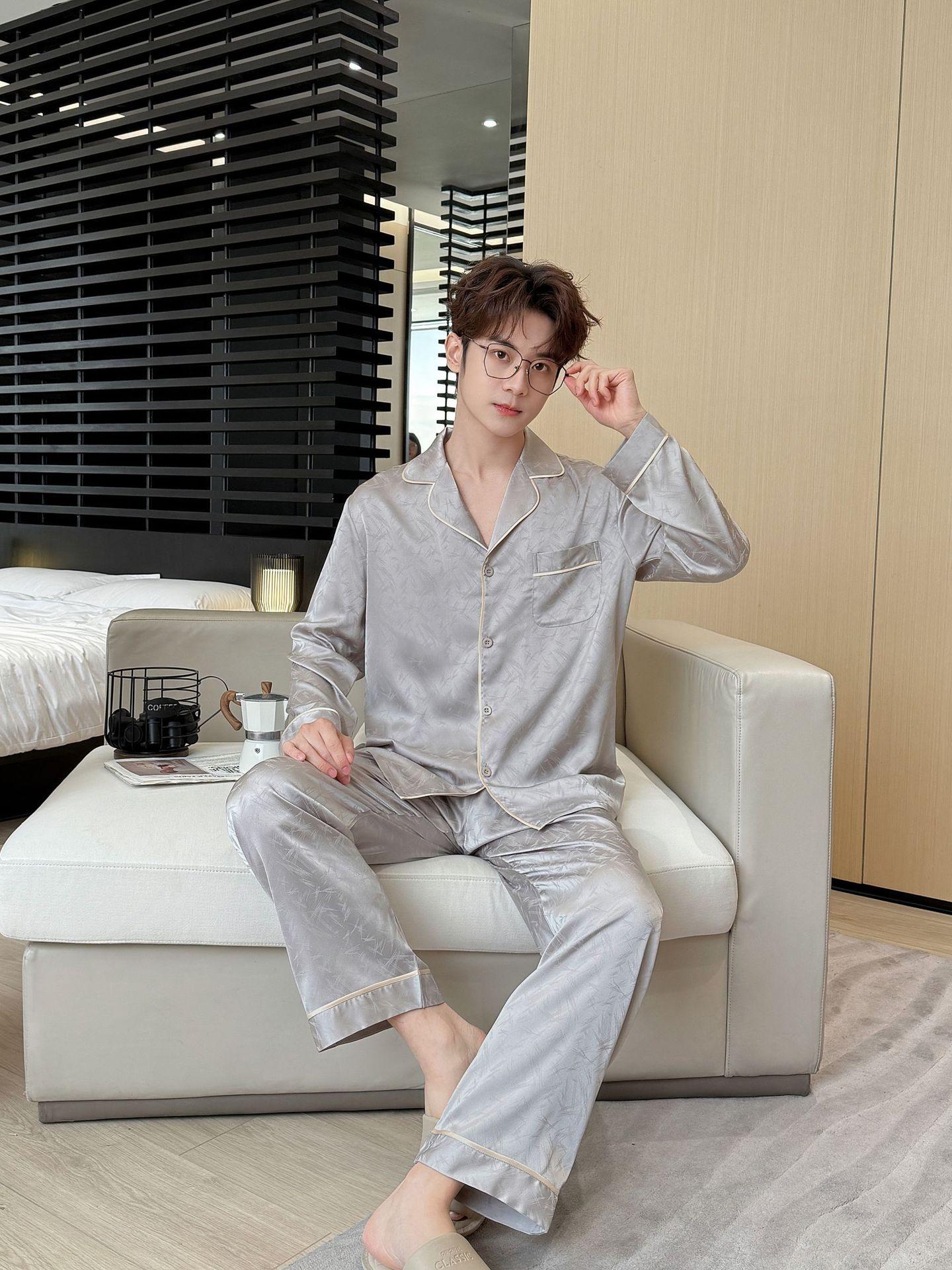 Pijamas para hombre, primavera y otoño, manga larga, seda fina de hielo, jacquard de alta calidad, tallas grandes, ropa de abrigo, ropa de casa, traje de otoño N256