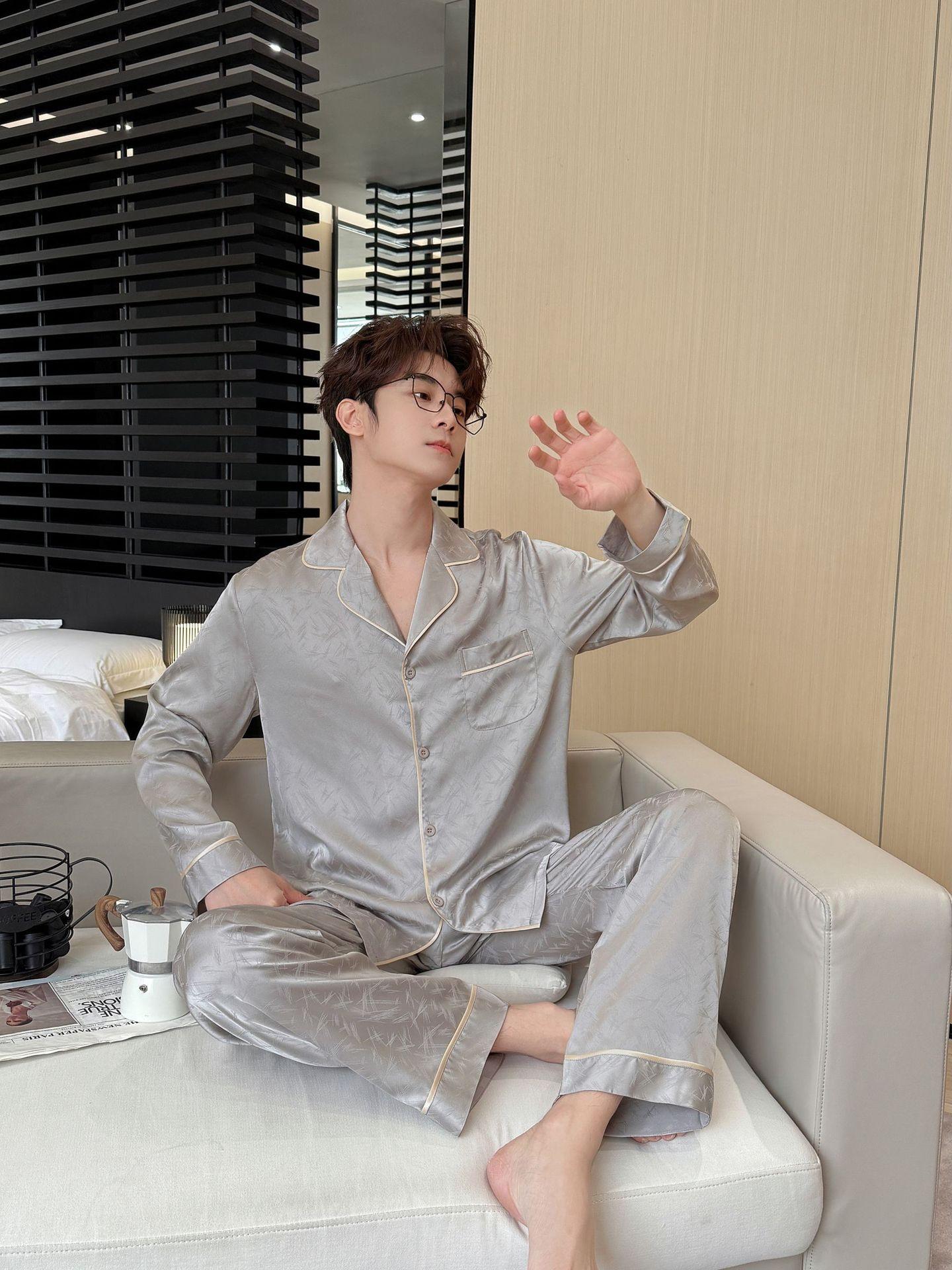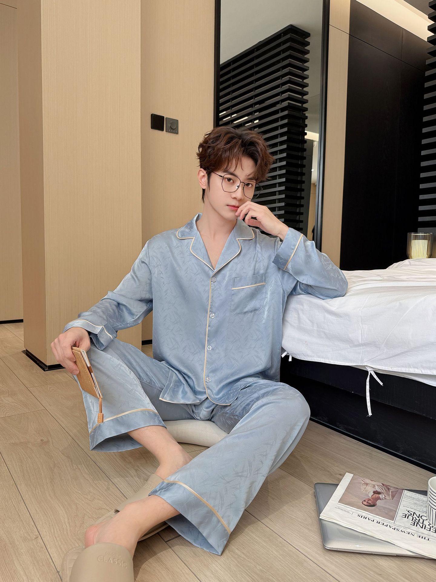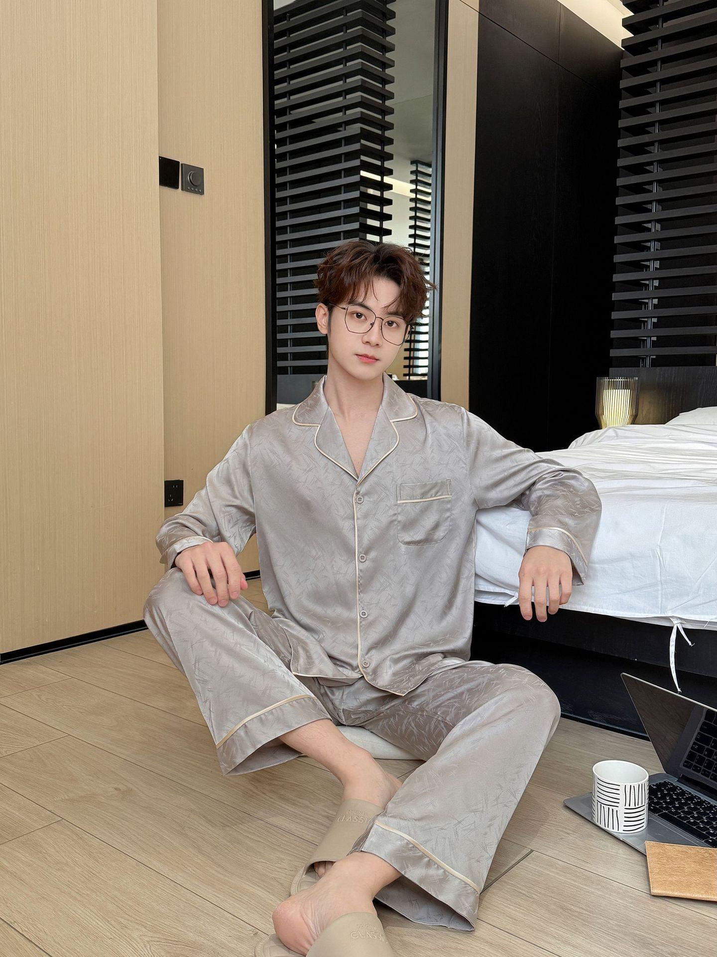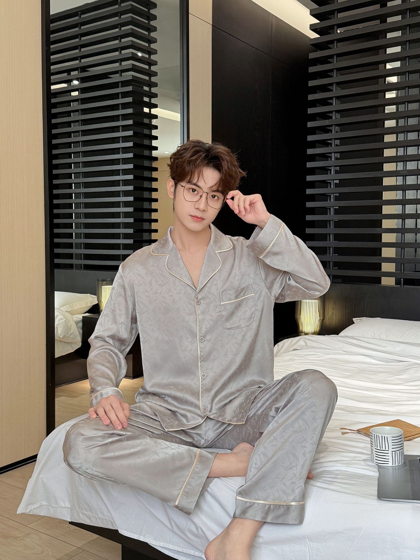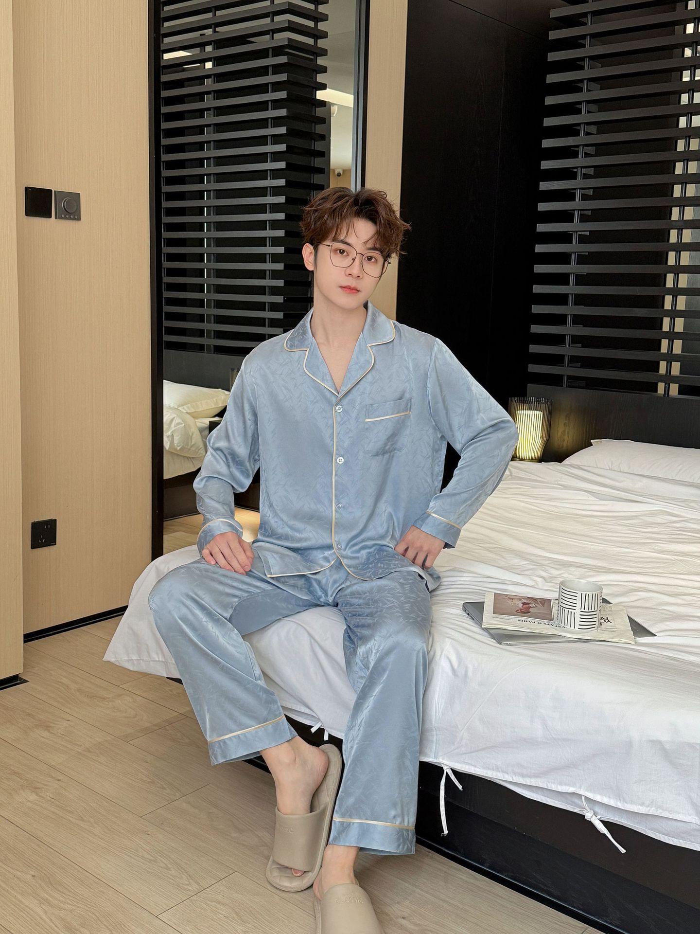 Pijamas para hombre, primavera y otoño, manga larga, seda fina de hielo, jacquard de alta calidad, tallas grandes, ropa de abrigo, ropa de casa, traje de otoño N256