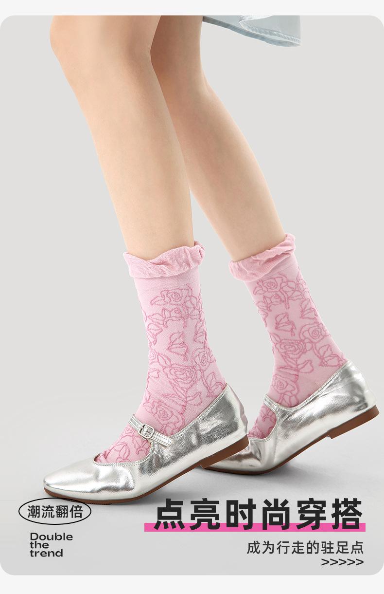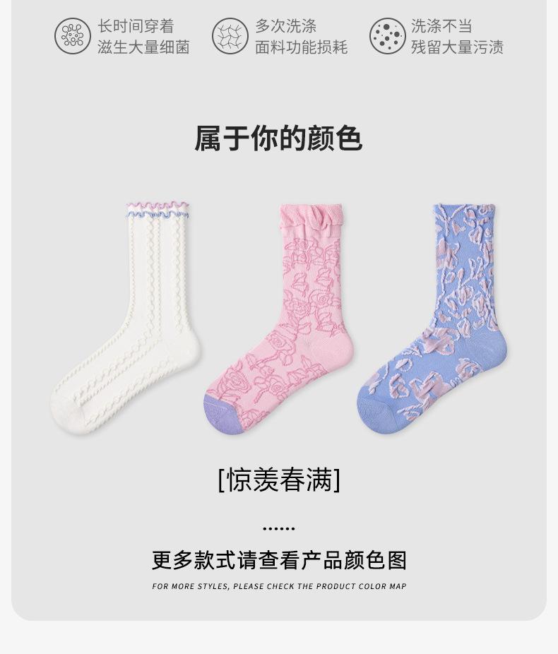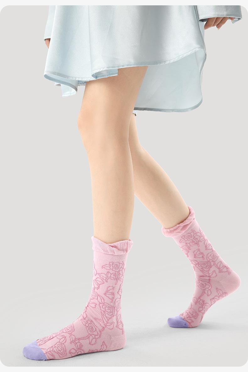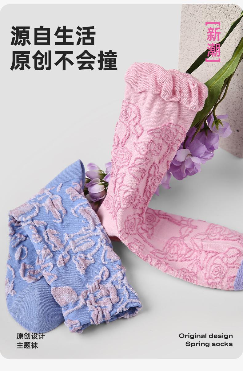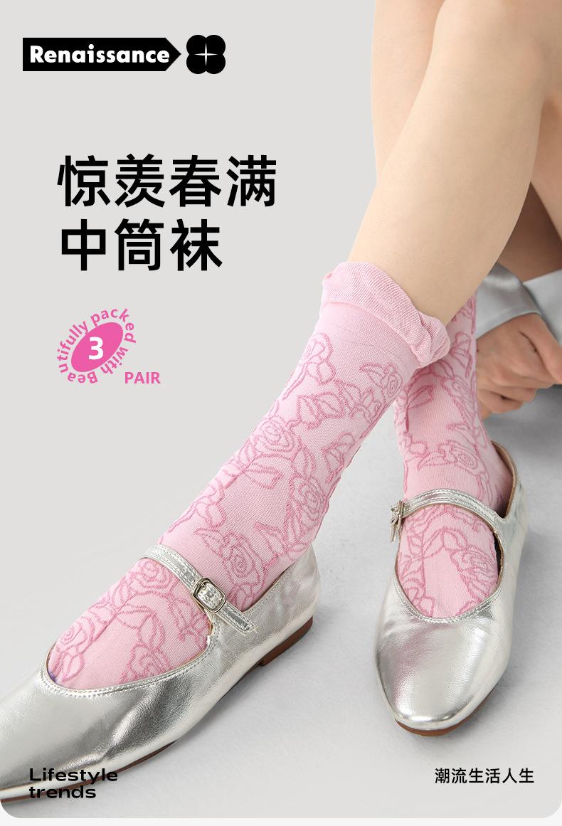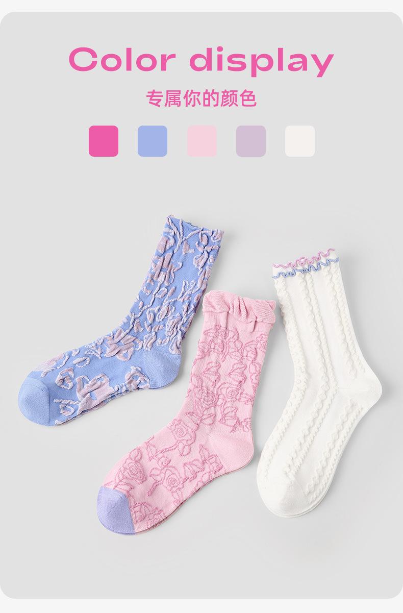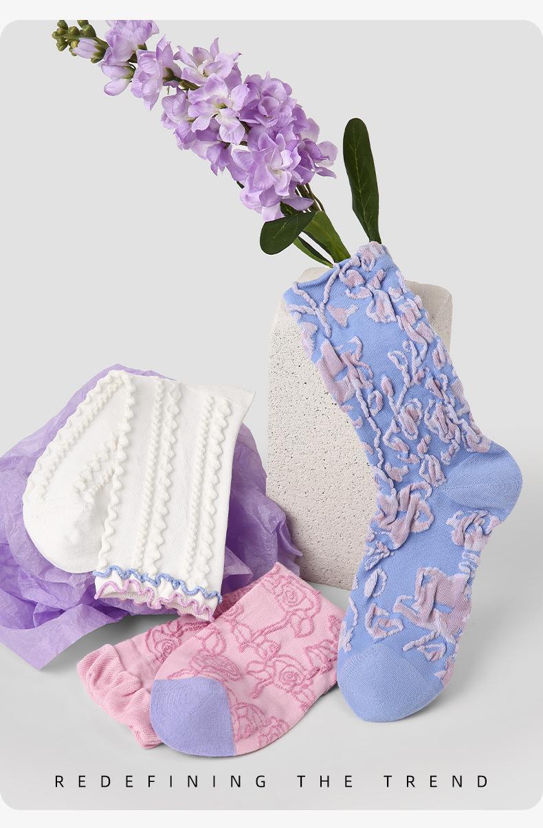 Calcetines de tubo de color liso con flores en relieve de primavera y verano renacentistas, calcetines de princesa de encaje, calcetines de algodón peinado para mujer