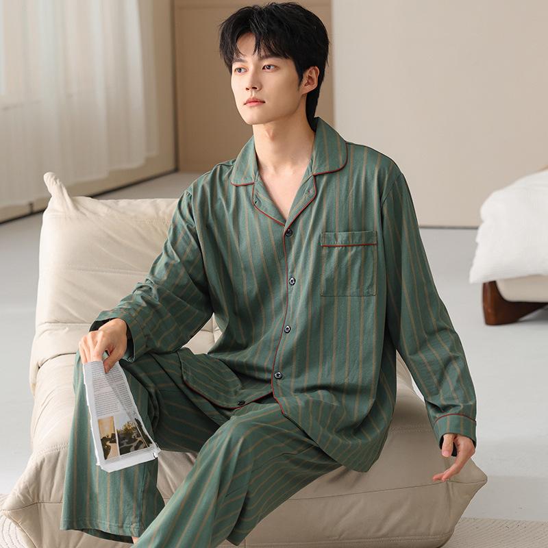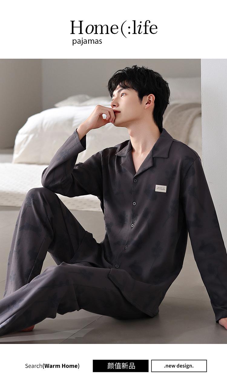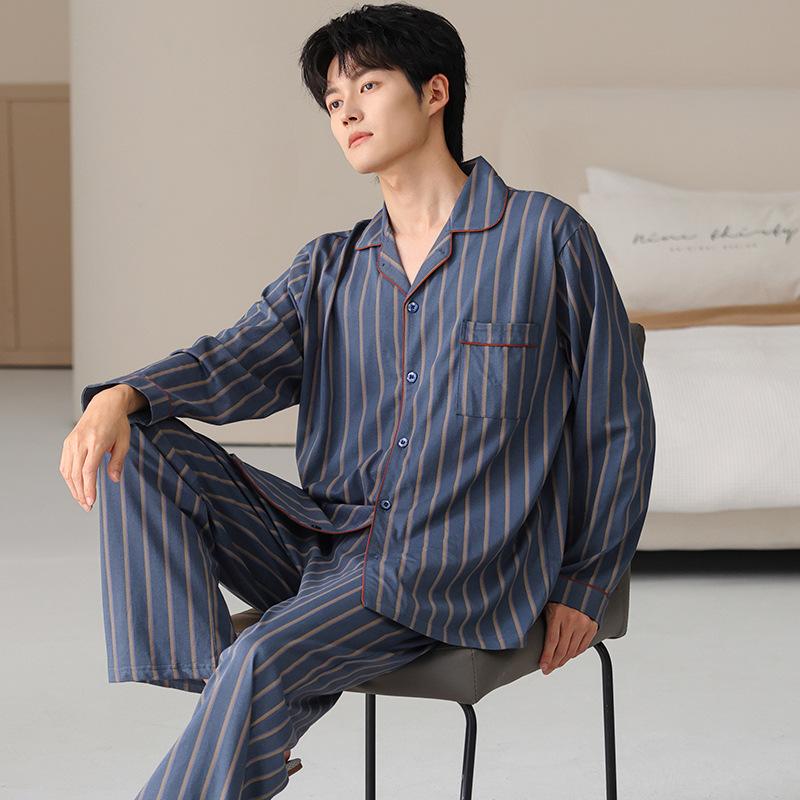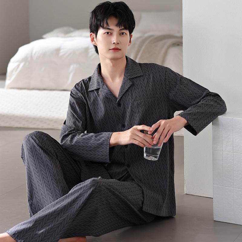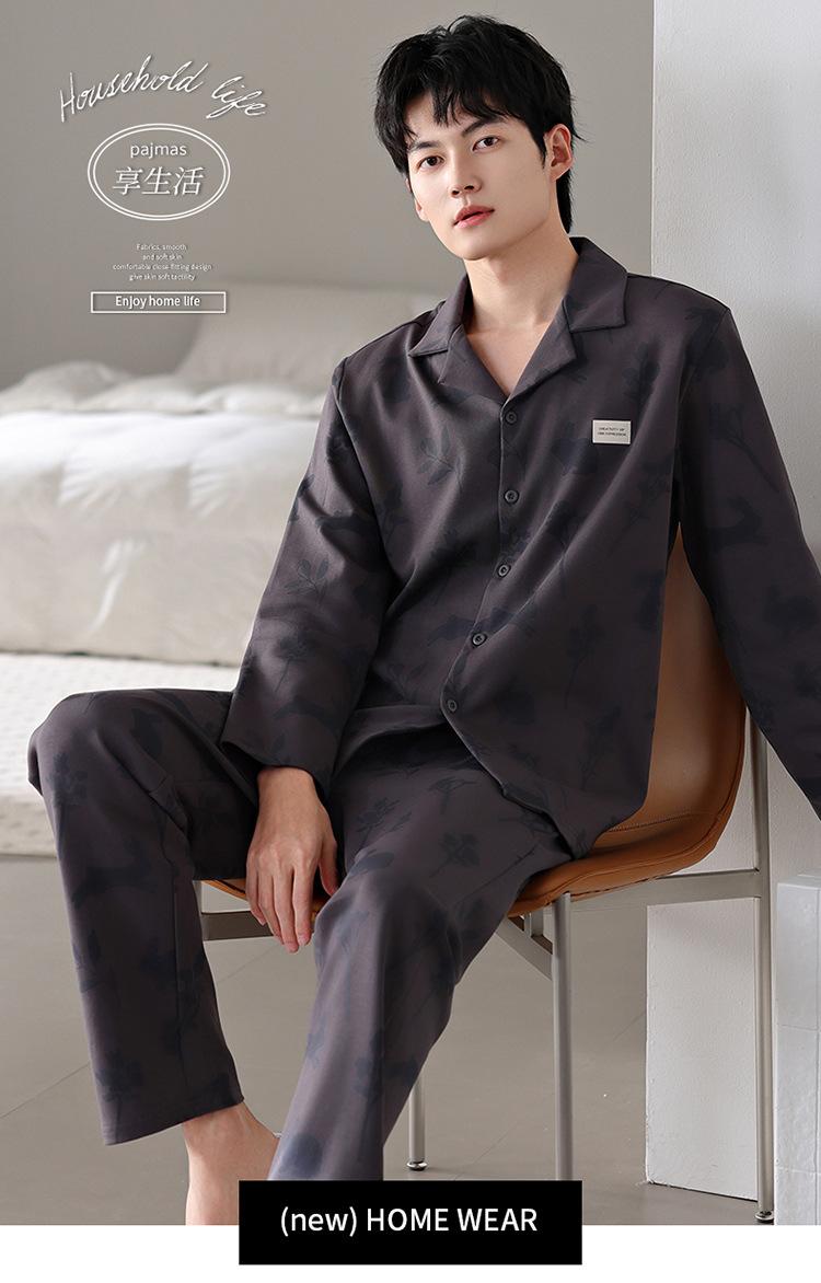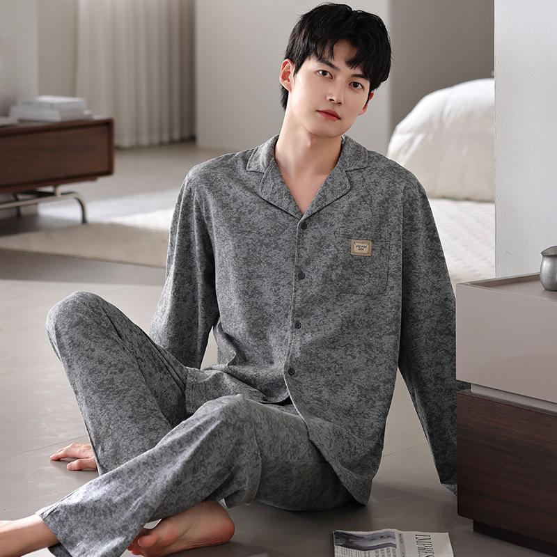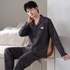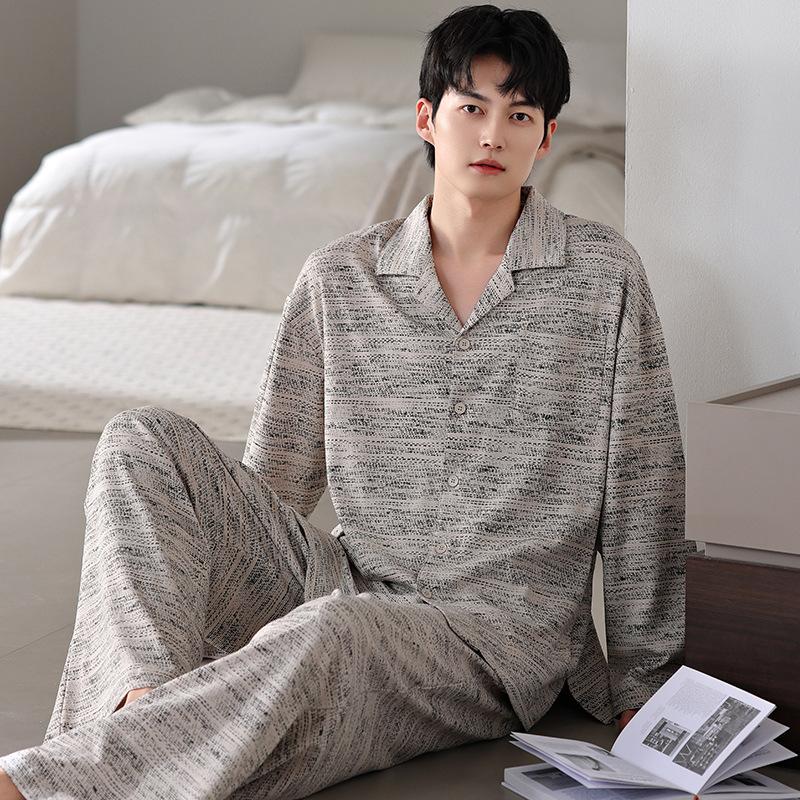 Pijama de Algodón Nuevo para Hombre Primavera y Otoño Manga Larga Solapa Cárdigan Sencillo Casual Traje Ropa de Casa Se Puede Usar