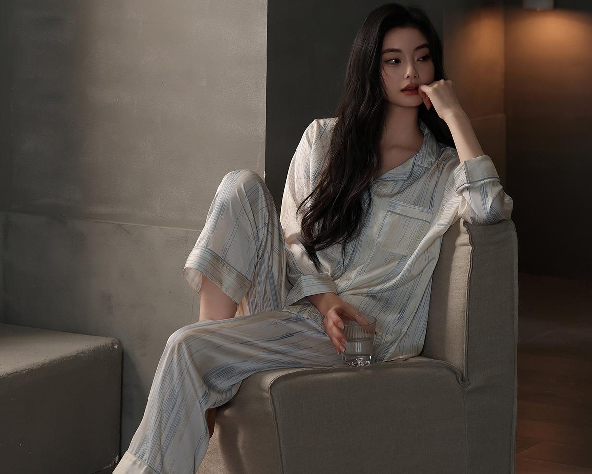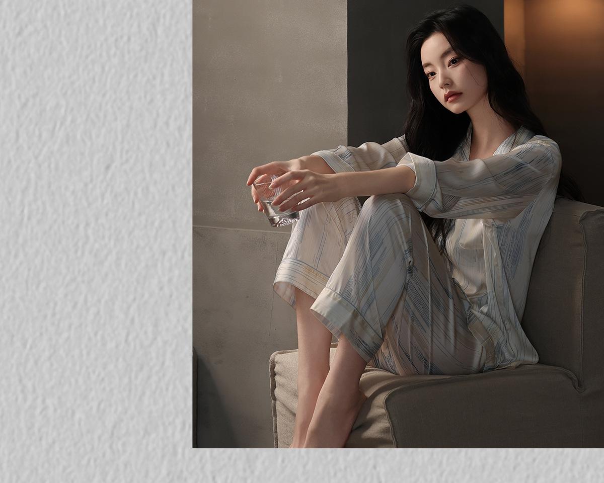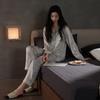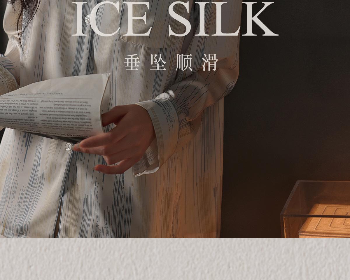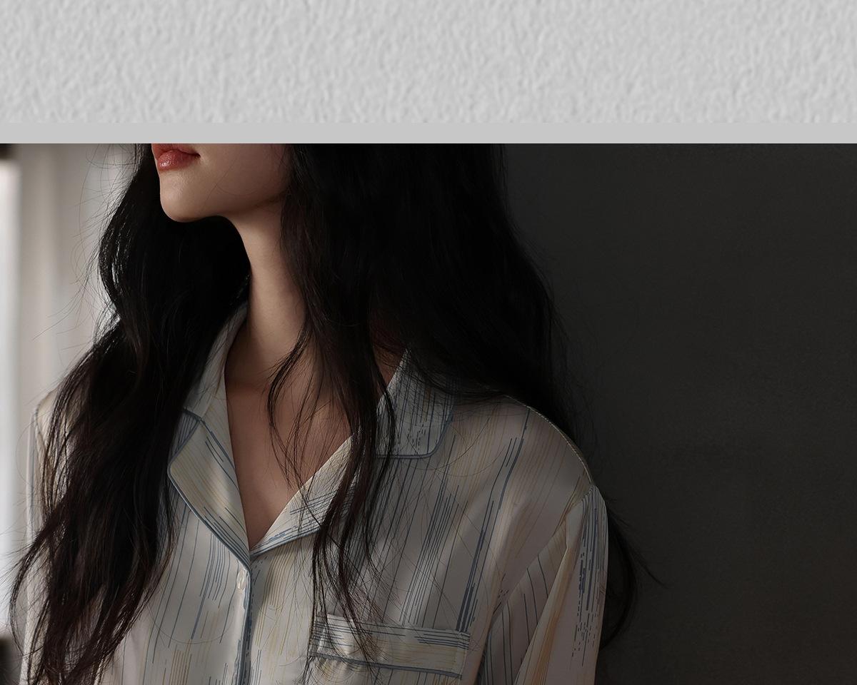 [Seda de hielo y nieve] Pijamas de nuevo estilo para mujer, primavera y verano, seda de hielo, talla grande, manga larga, rayas, contraste de color, ropa fina para el hogar.