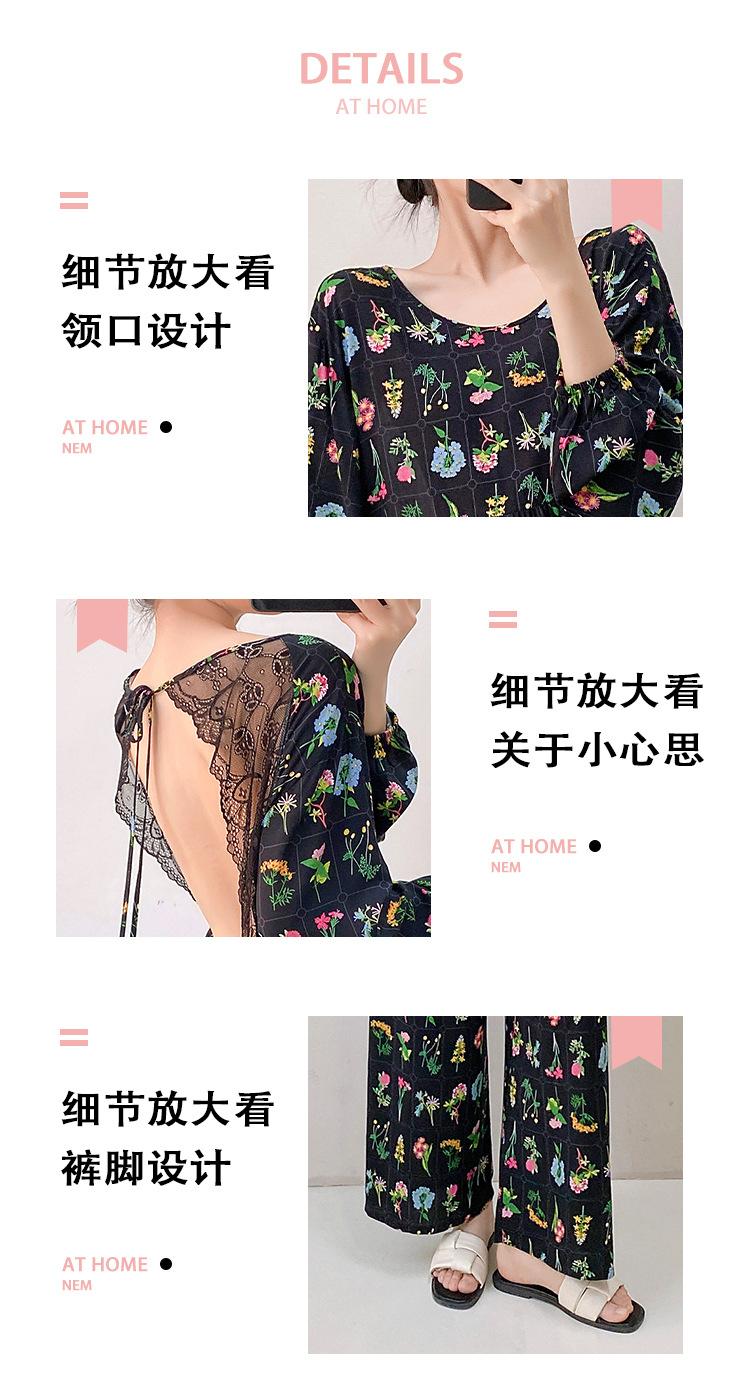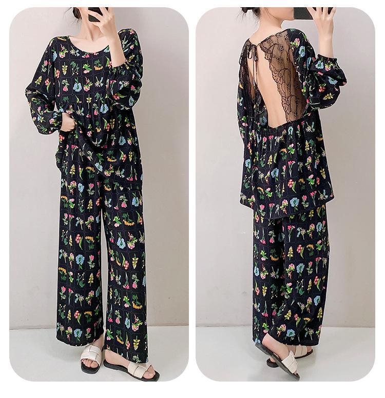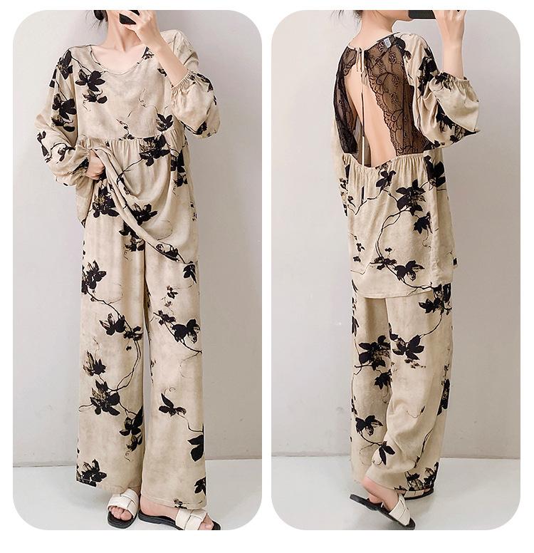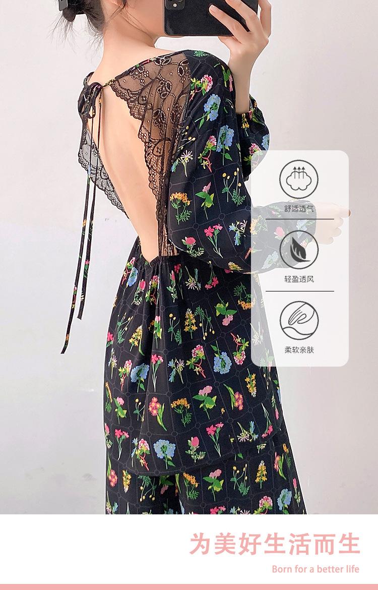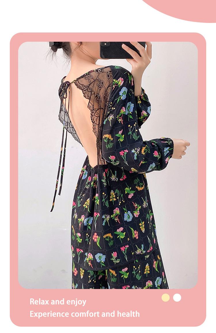 Pijama elegante de seda de algodón de manga larga de estilo francés para mujer, primavera y otoño, de alta gama, súper hermoso, con encaje negro, sin espalda, ropa para el hogar.