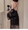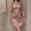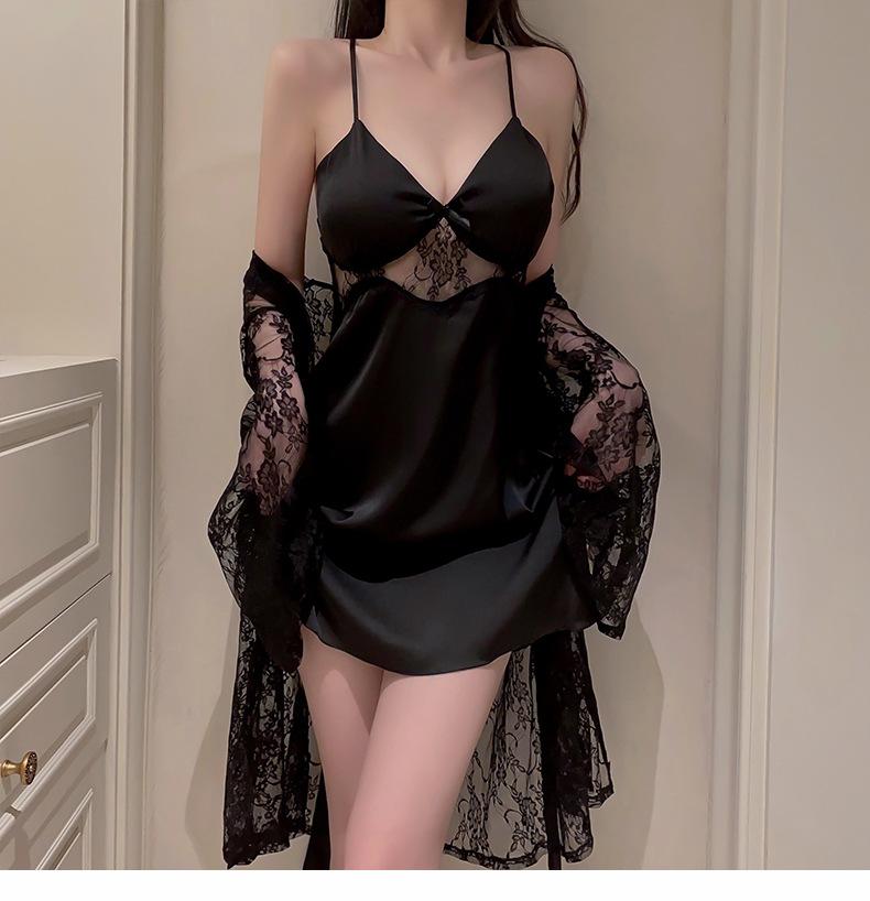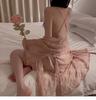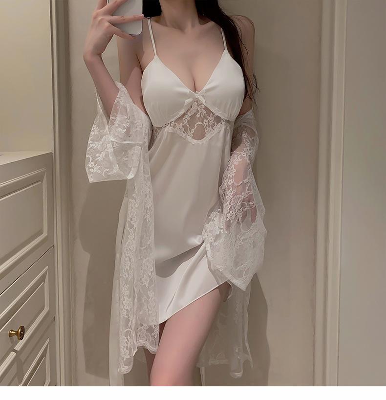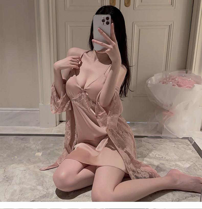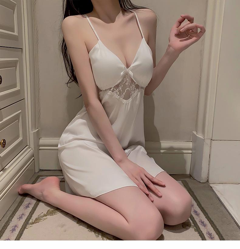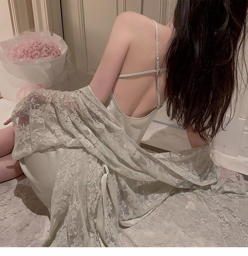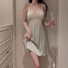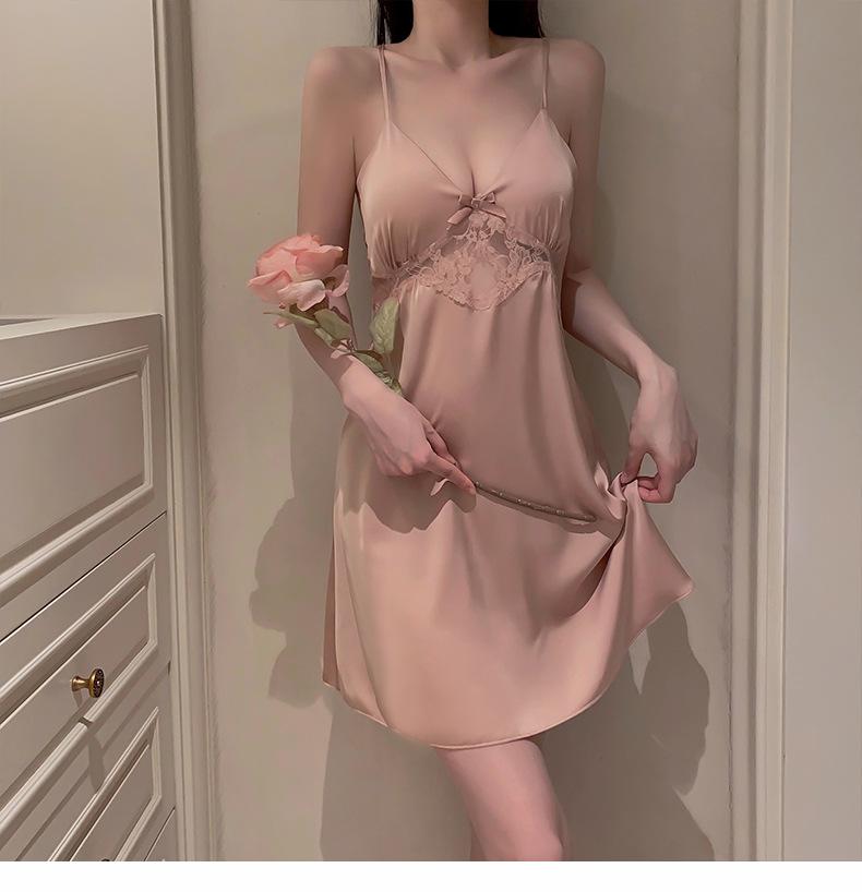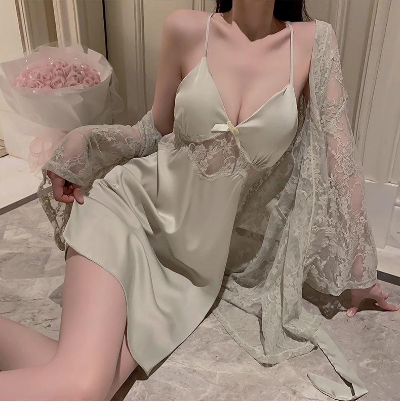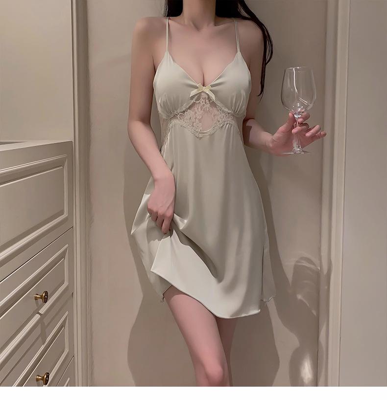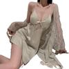 Pijama sexy con almohadilla para el pecho para mujer verano 2024 Ice Silk nuevo camisón de tirantes de encaje fino ropa de casa de dos piezas