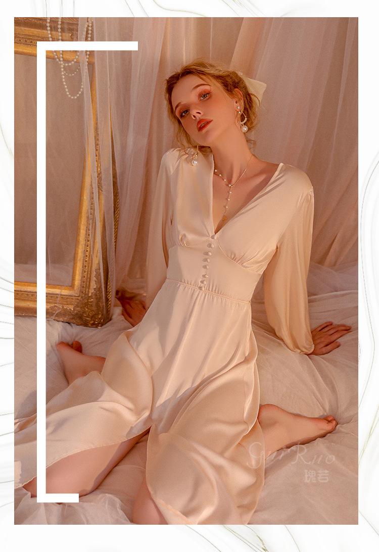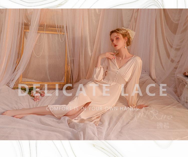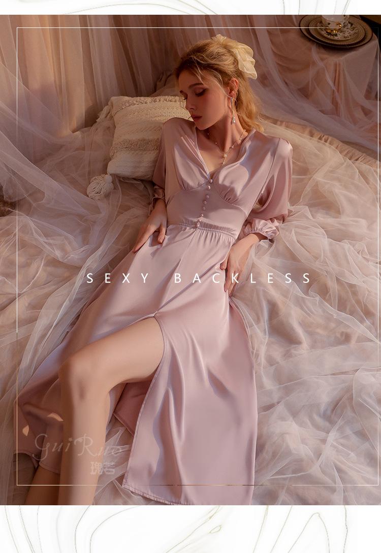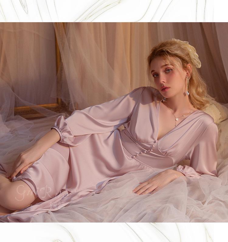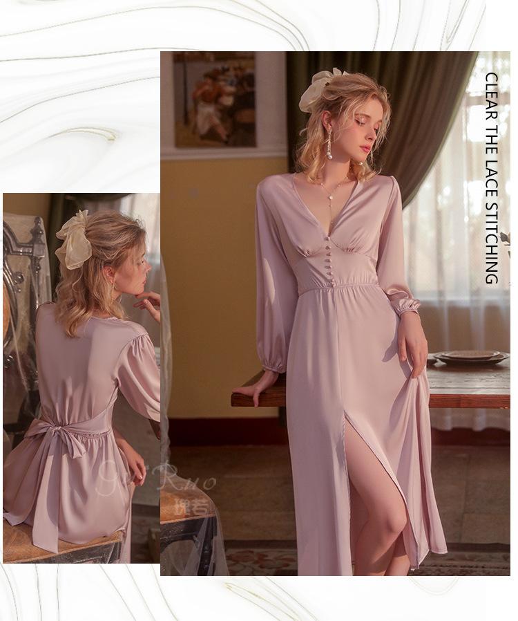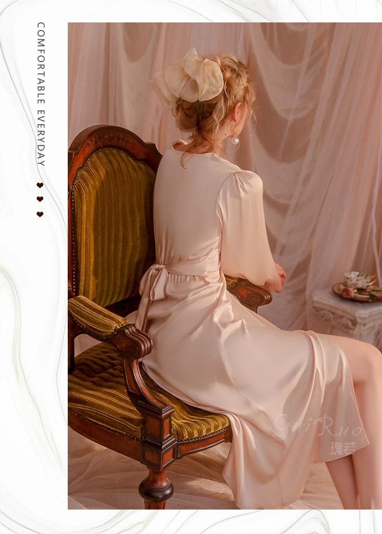 Guiruo bata de noche larga de satén con abertura para mujer, tentación sexy, francesa con escote en V profundo, para llevar encima, traje de ropa para el hogar Q2796