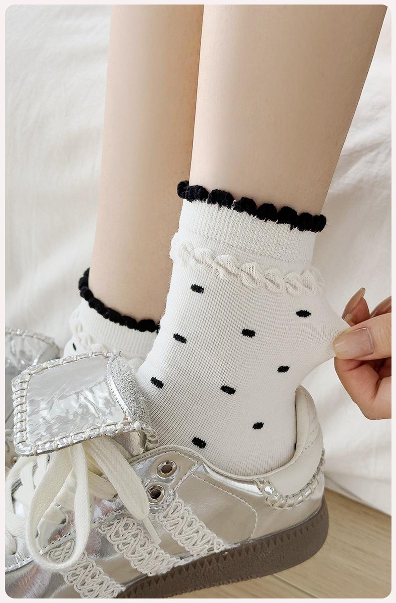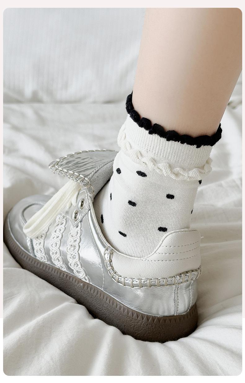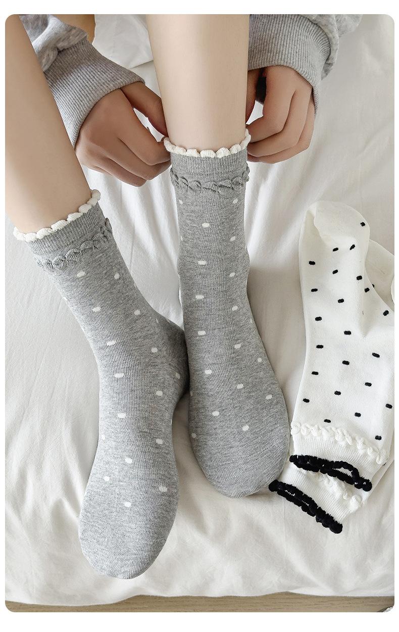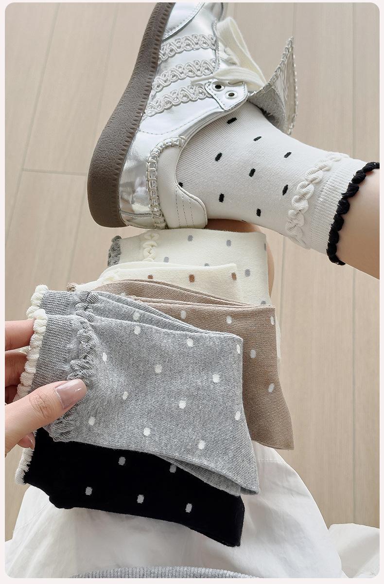 Calcetines de encaje de otoño para niños, primavera y otoño, calcetines de longitud media, bonitos calcetines japoneses de lunares apilados, calcetines de algodón para estudiantes y mujeres.
