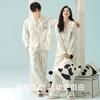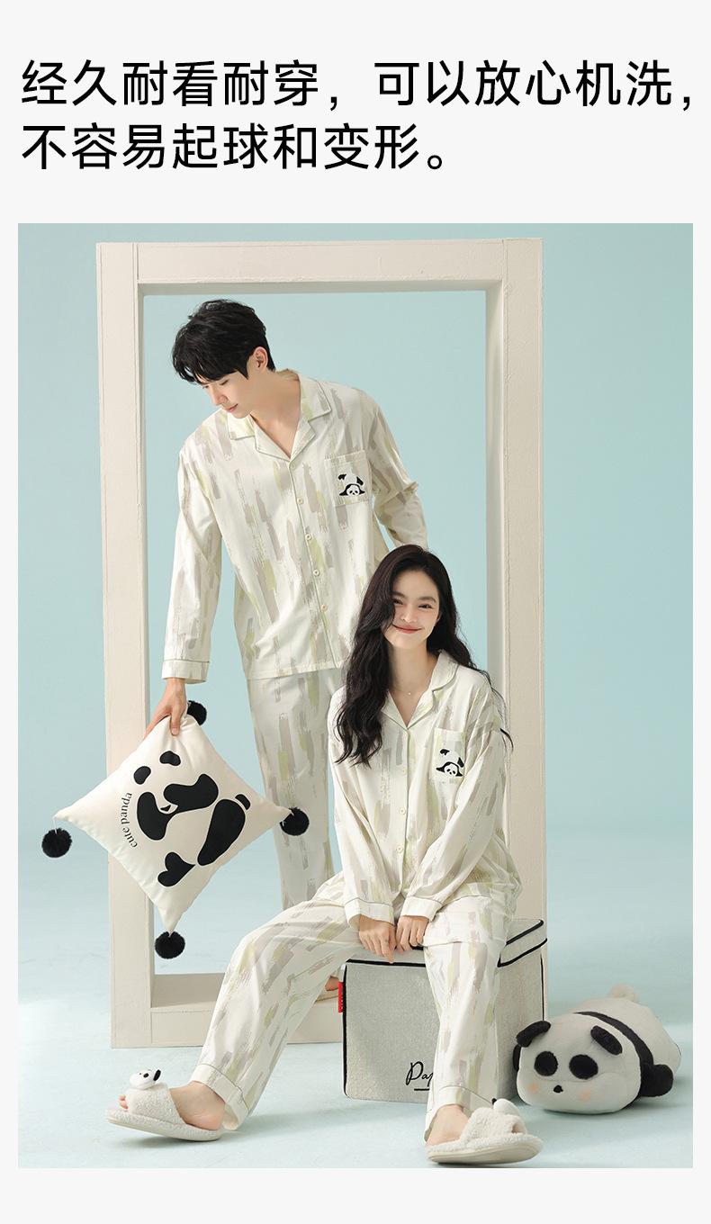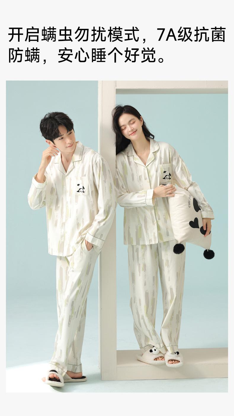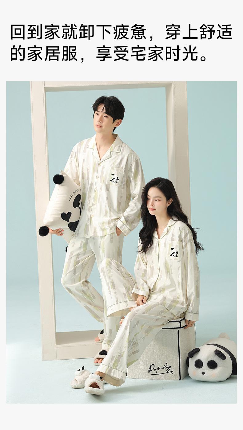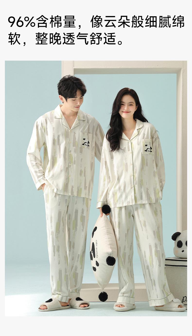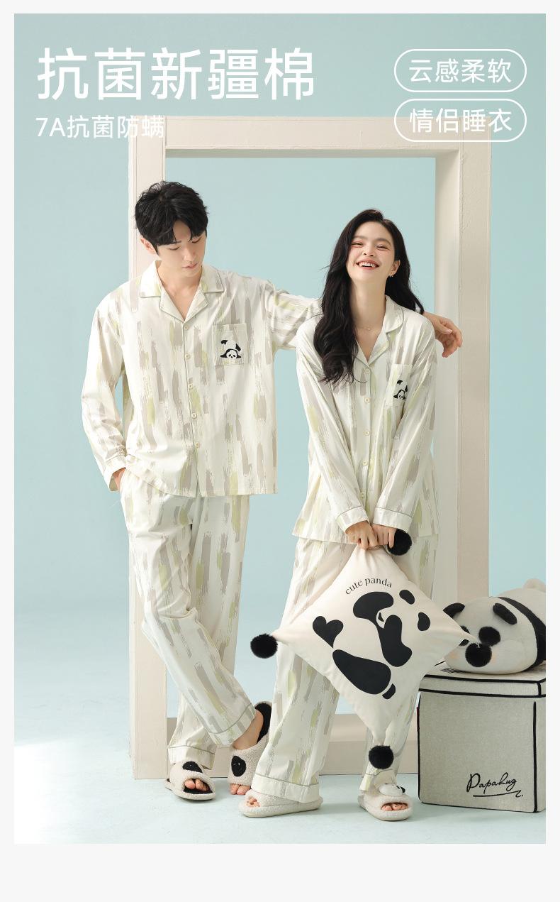 [Algodón Antibacteriano] Pijama Nuevo de Pareja de Primavera y Verano Algodón Puro Manga Larga Bordado de Panda Algodón para Jalar Ropa para el Hogar