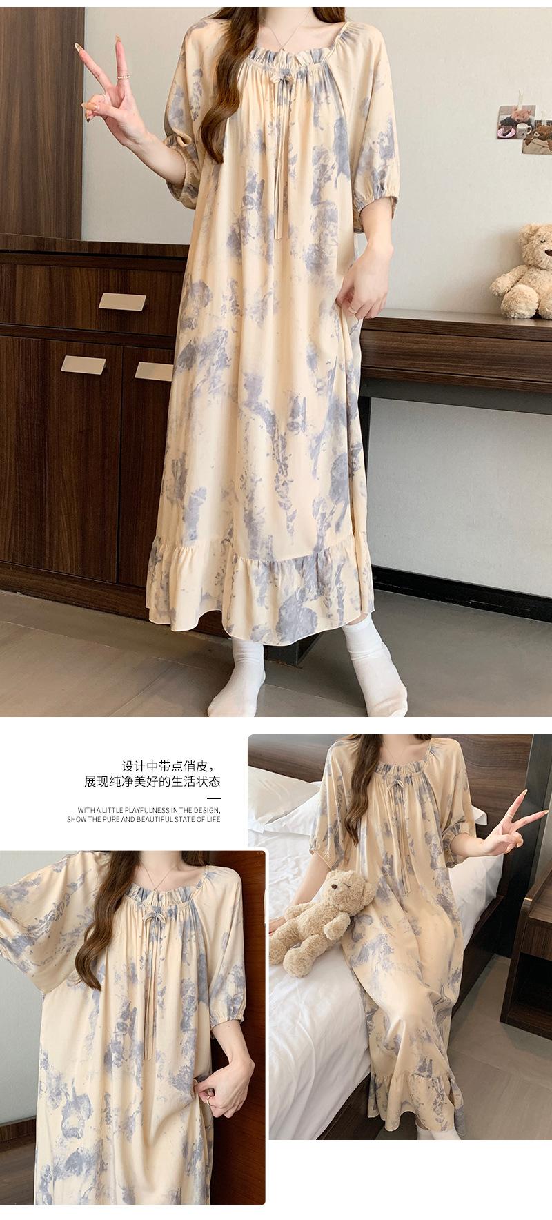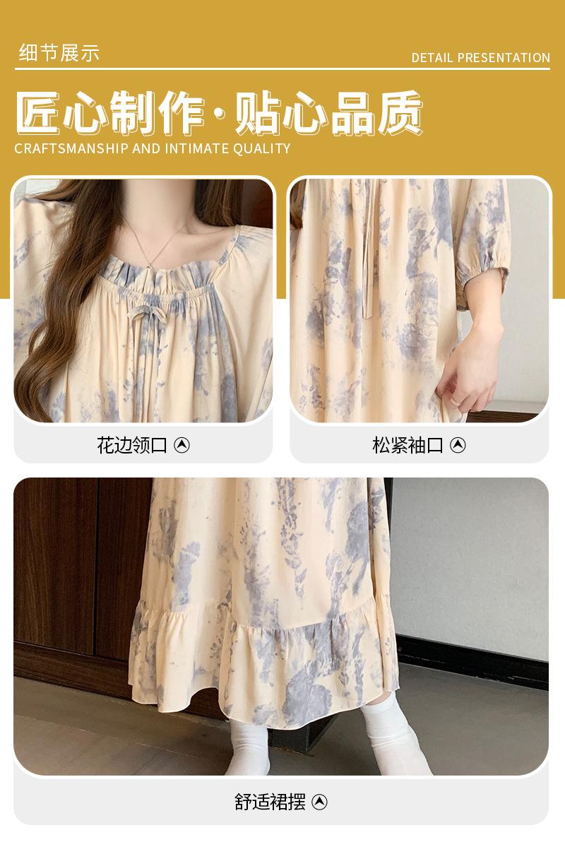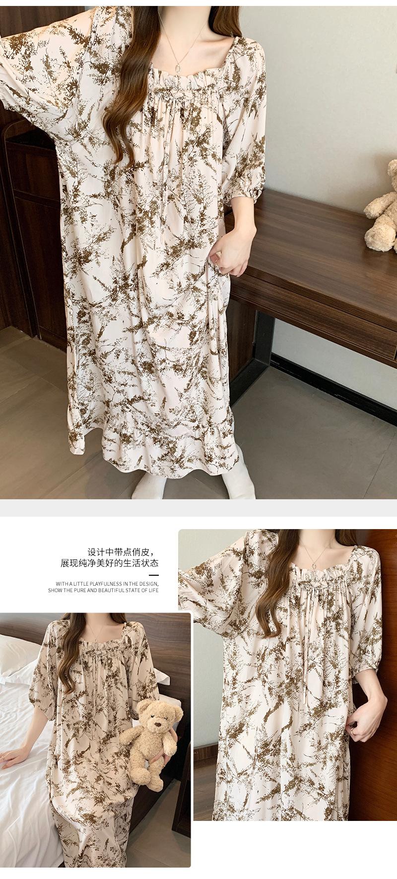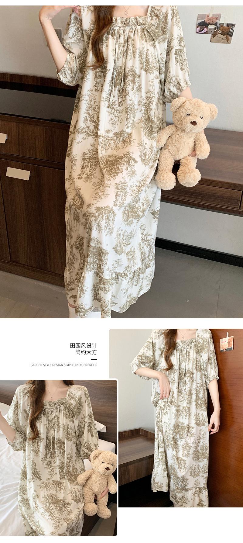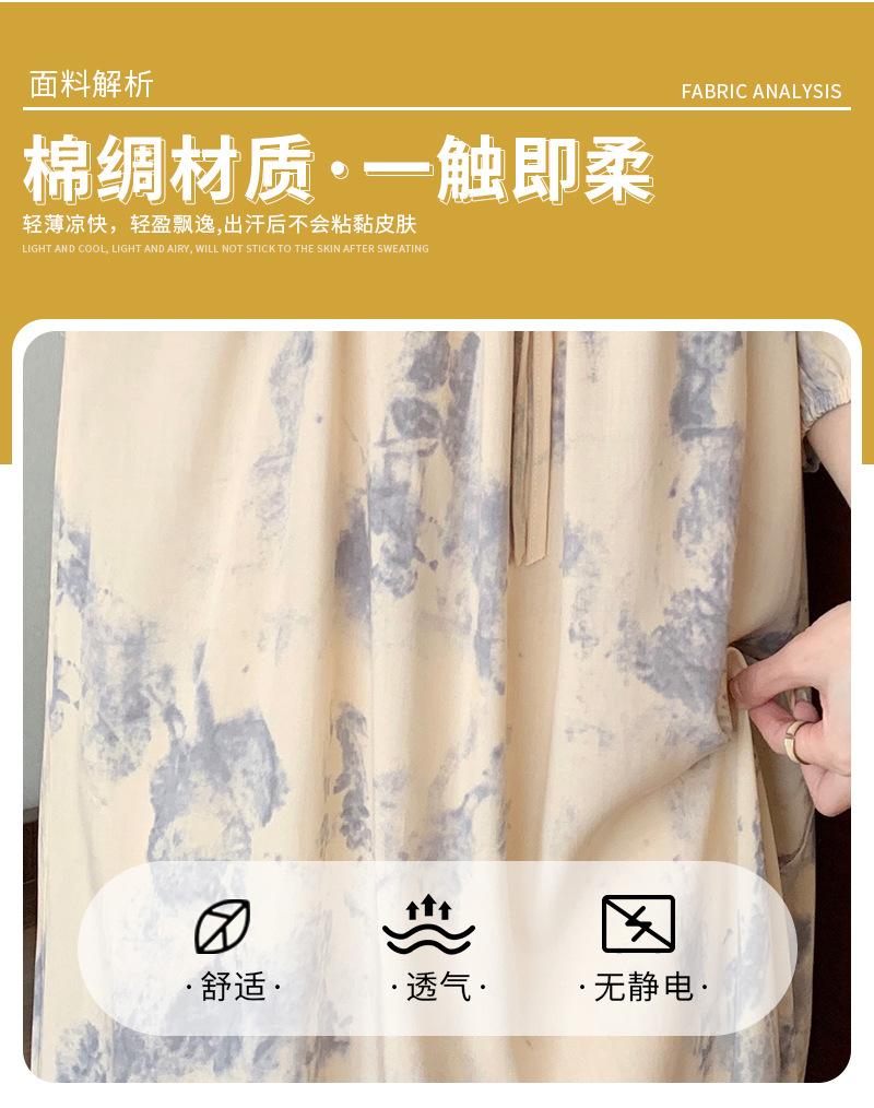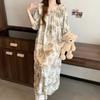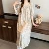 Pijama de Falda Larga de Verano, Vestido Hueco Estampado de Algodón Artificial, Camisón Estilo Hada Adelgazante para Mujer, Holgado y se Puede Usar Afuera
