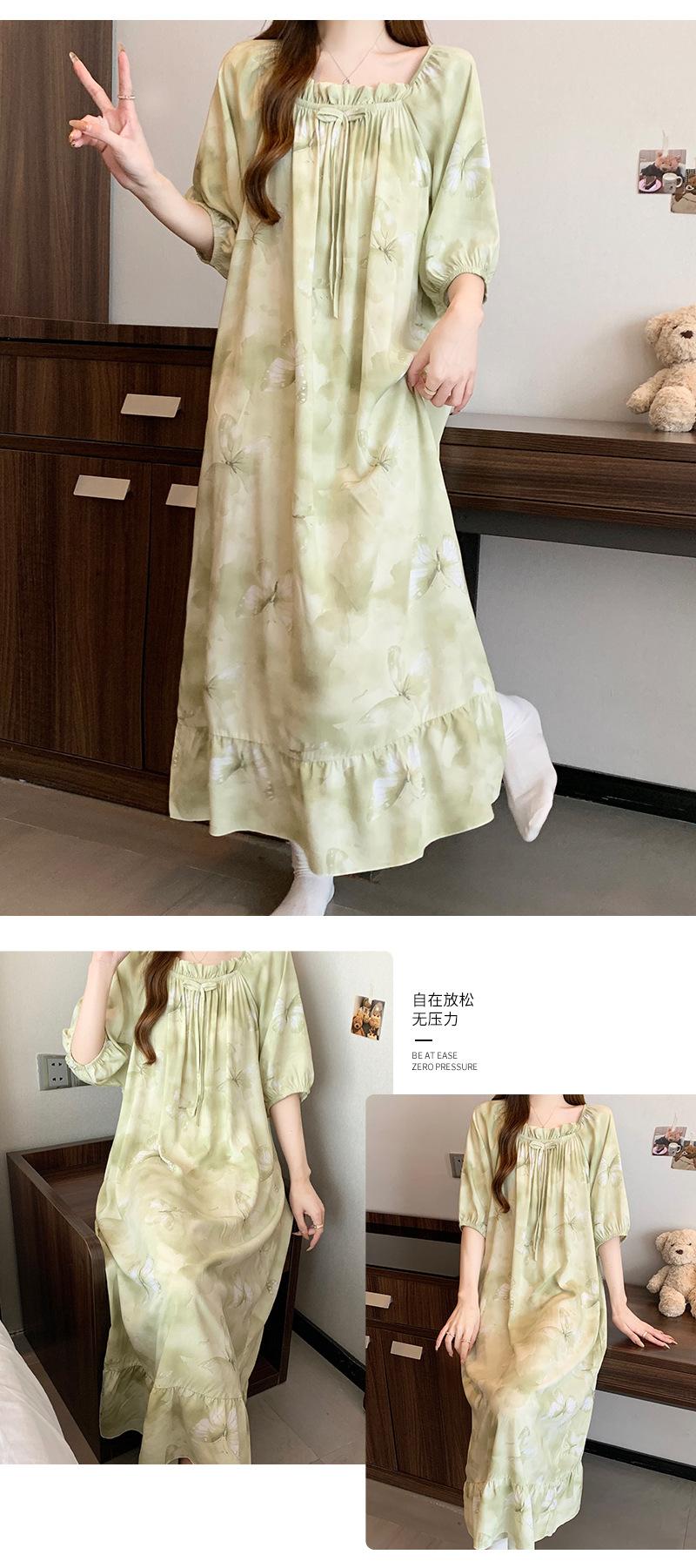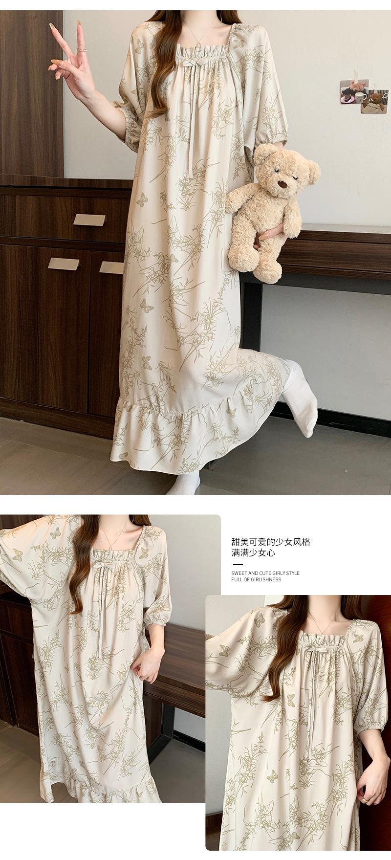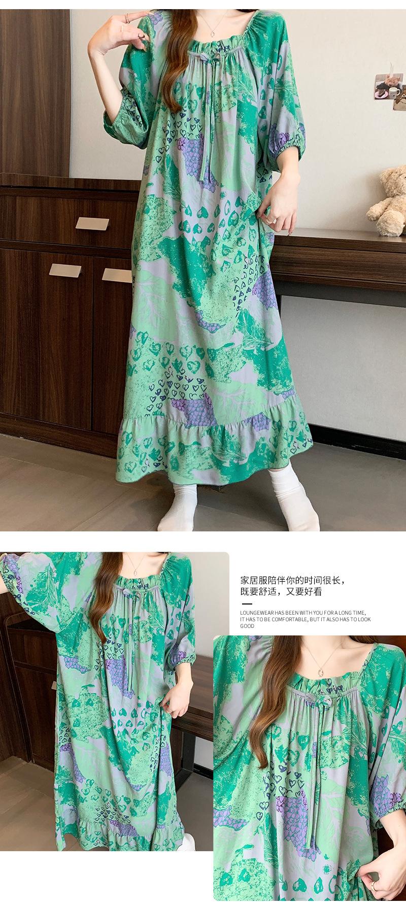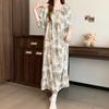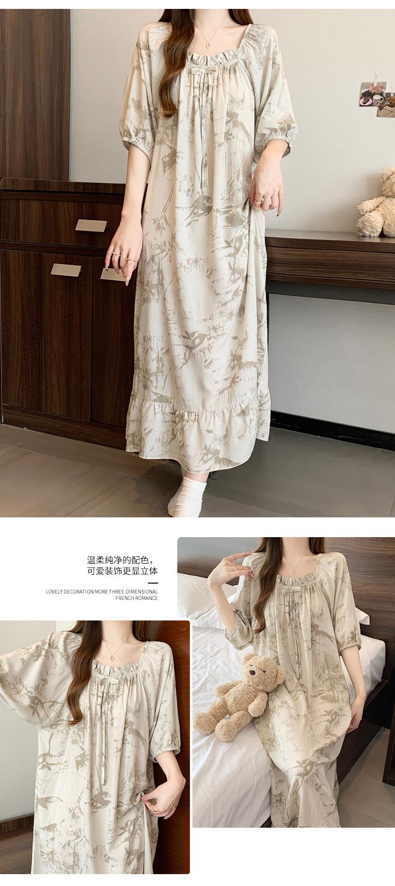 Pijama de Falda Larga de Verano, Vestido Hueco Estampado de Algodón Artificial, Camisón Estilo Hada Adelgazante para Mujer, Holgado y se Puede Usar Afuera