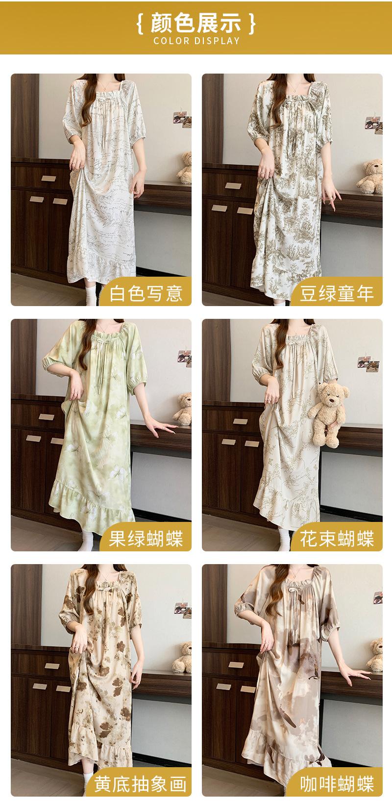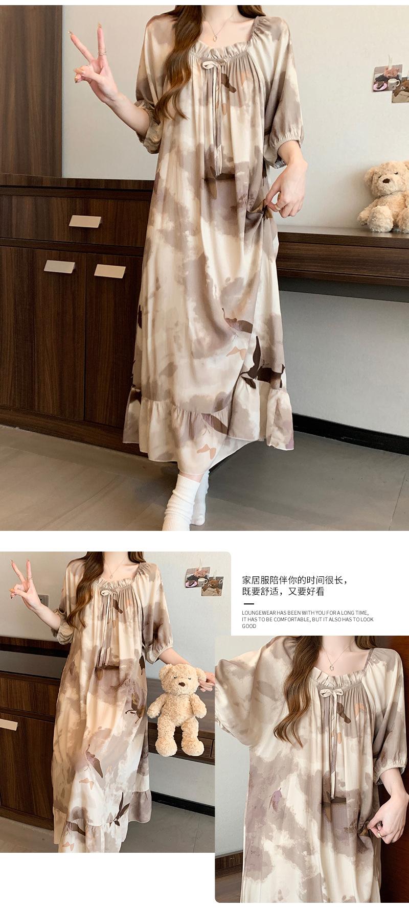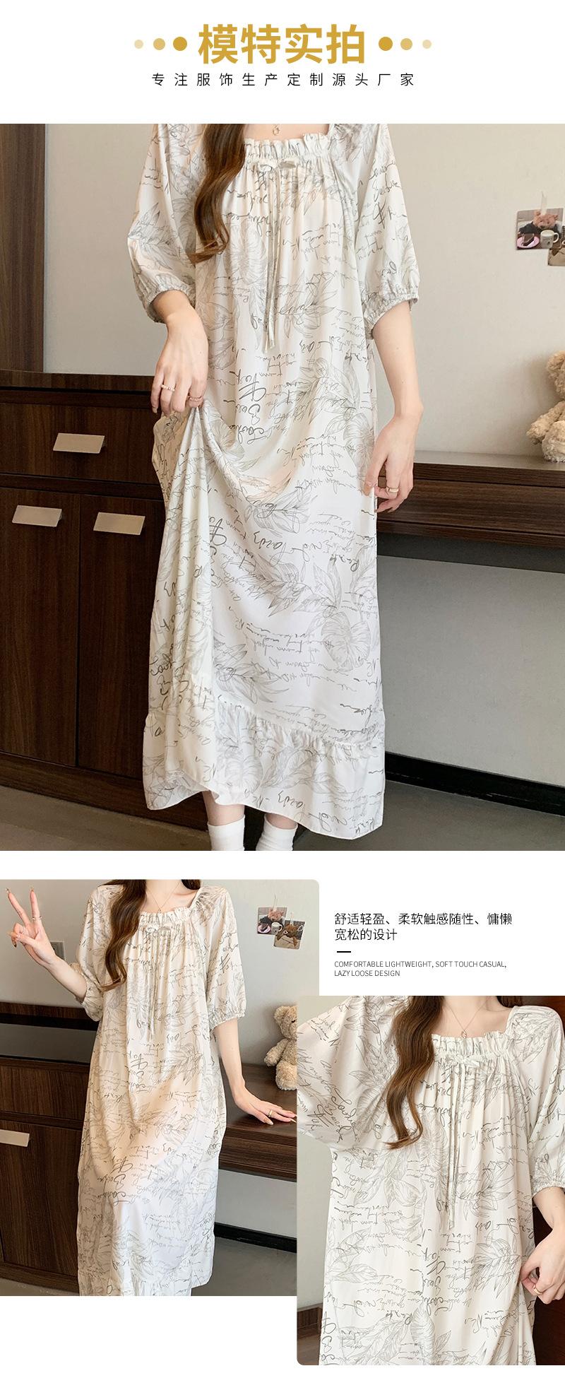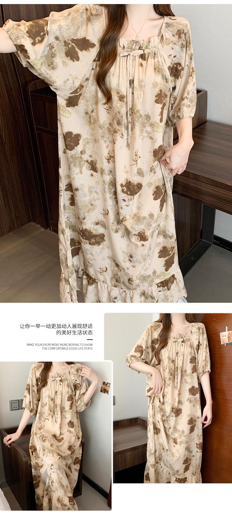 Pijama de Falda Larga de Verano, Vestido Hueco Estampado de Algodón Artificial, Camisón Estilo Hada Adelgazante para Mujer, Holgado y se Puede Usar Afuera