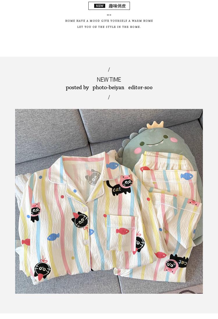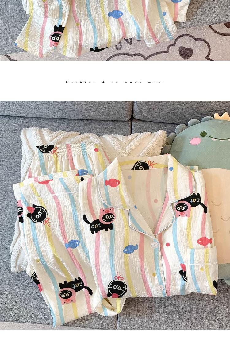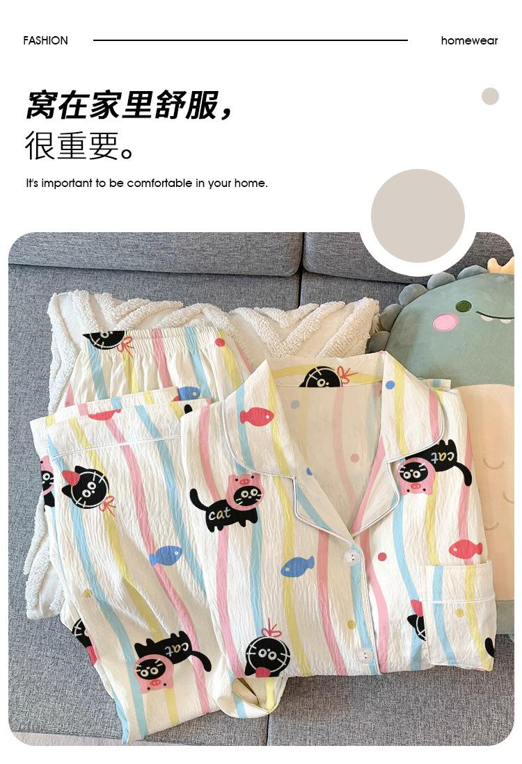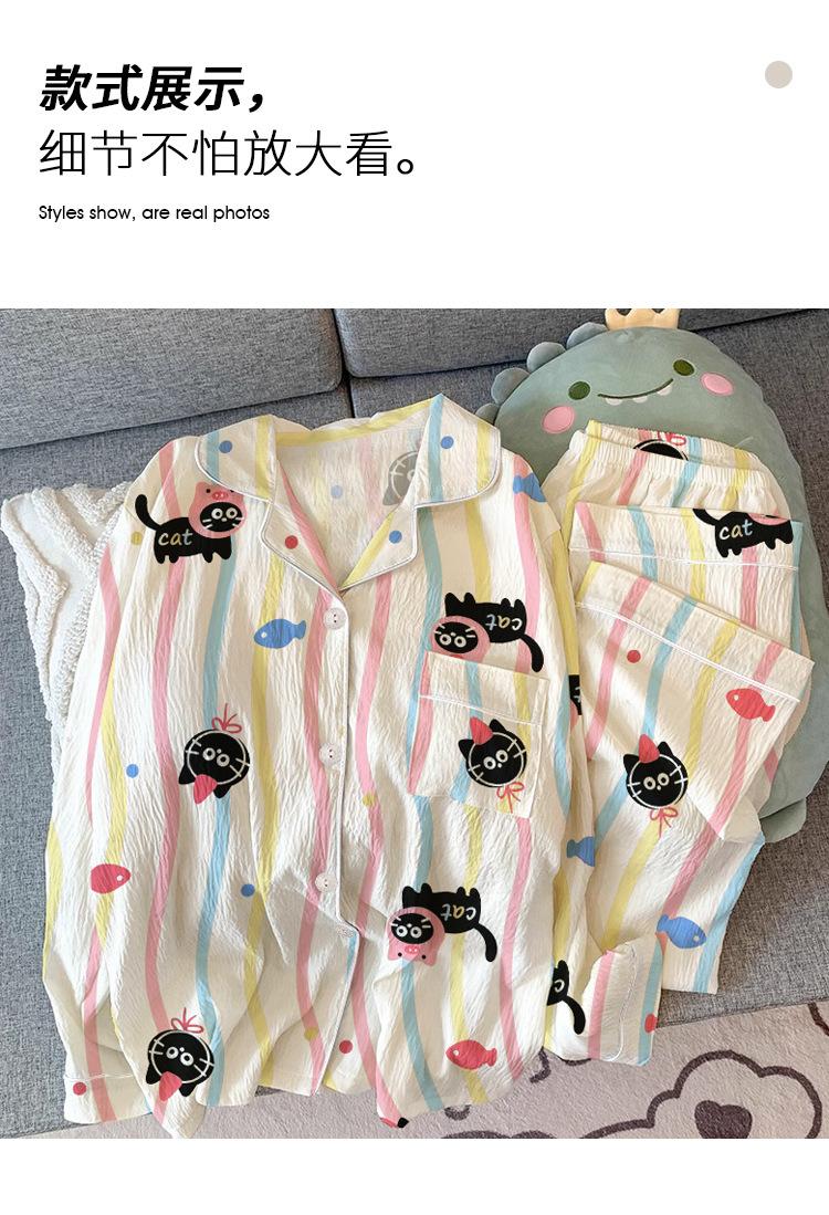 Pijama de tela arrugada para mujer de manga larga con estampado de gatito negro nuevo de primavera a rayas de arcoíris, traje de ropa de casa de dibujos animados al por mayor
