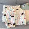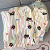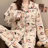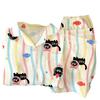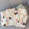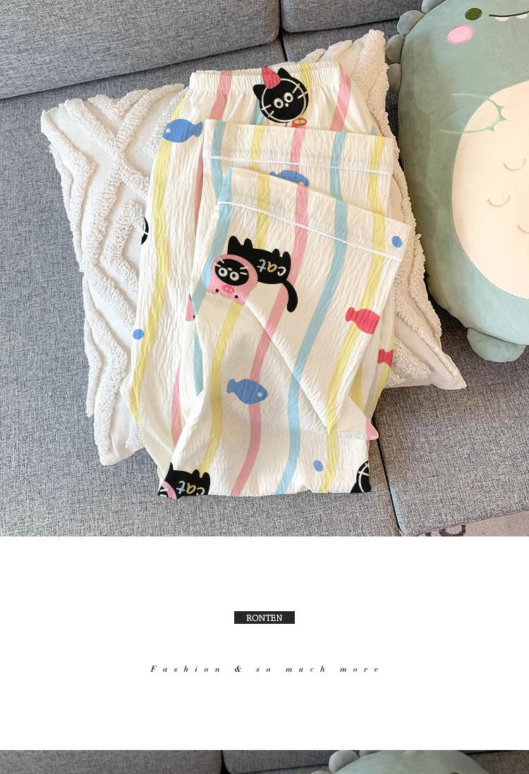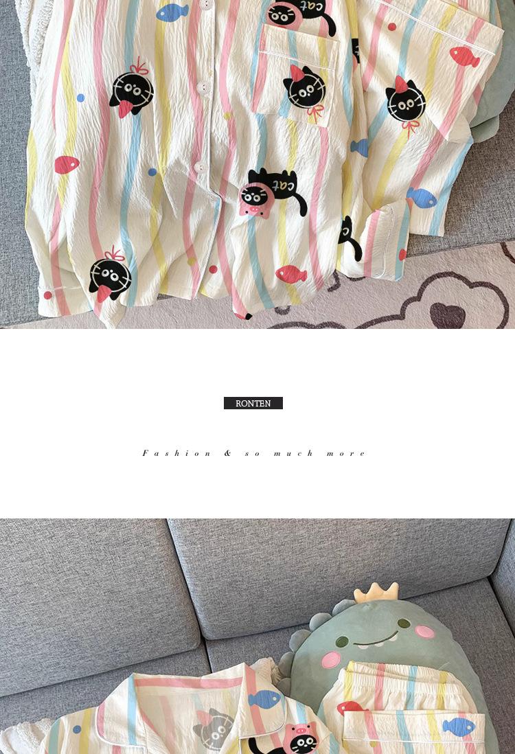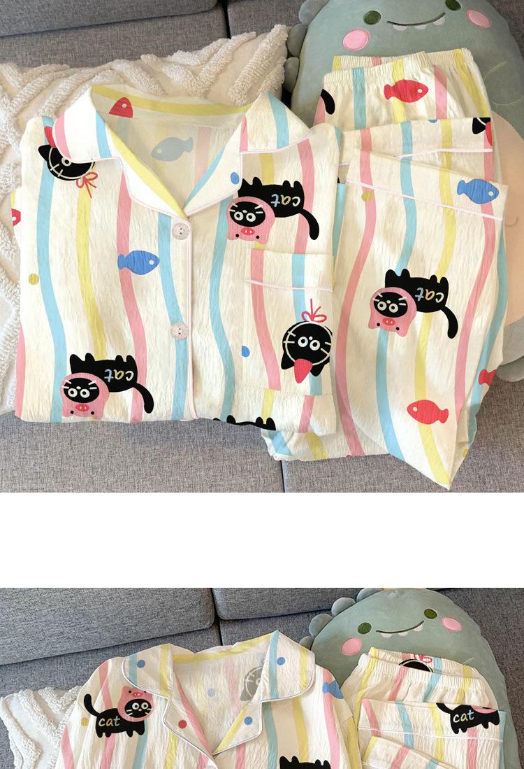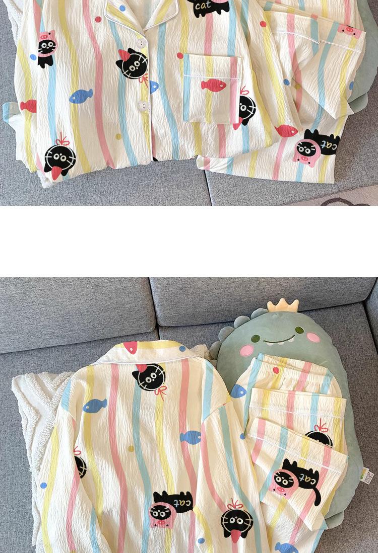 Pijama de tela arrugada para mujer de manga larga con estampado de gatito negro nuevo de primavera a rayas de arcoíris, traje de ropa de casa de dibujos animados al por mayor