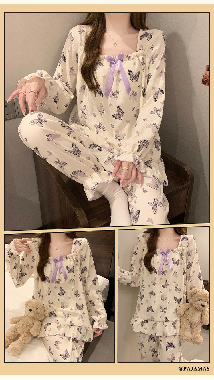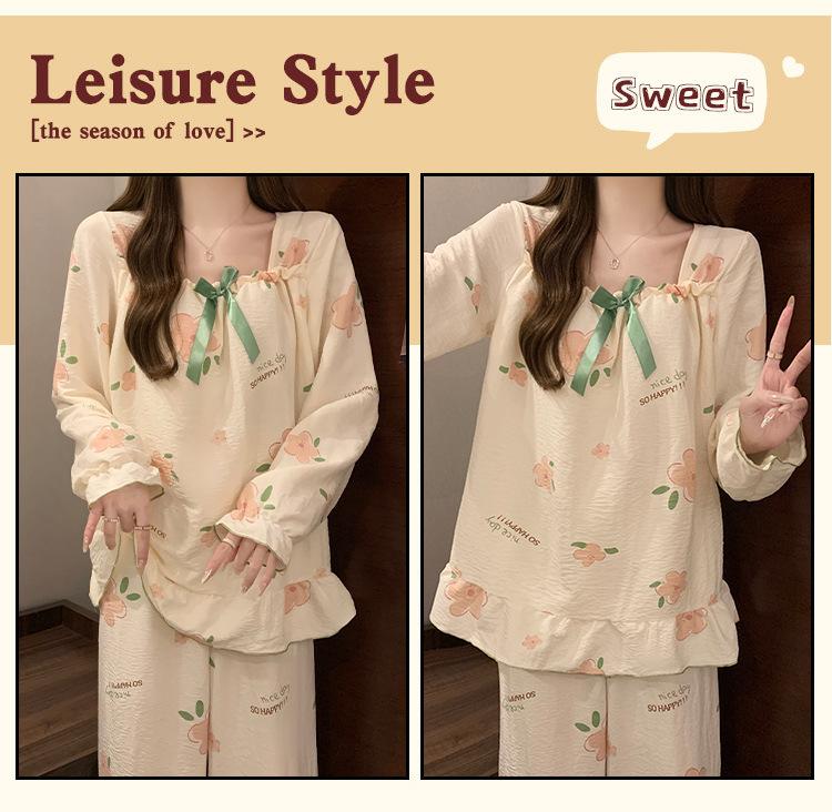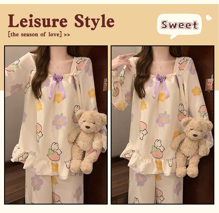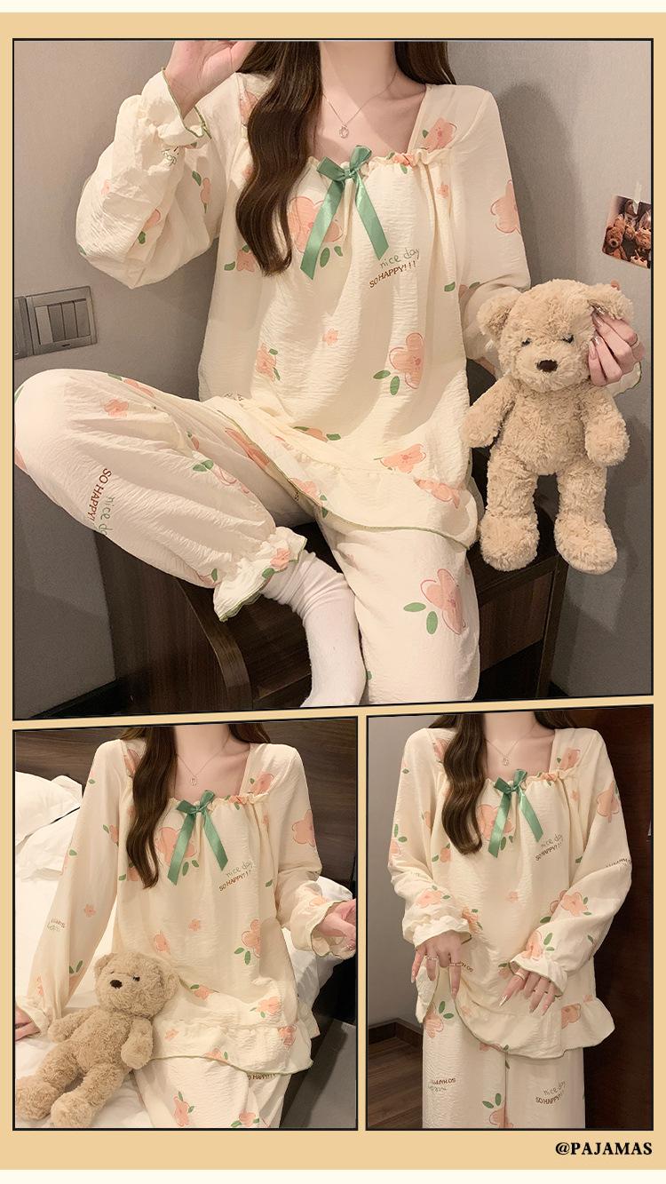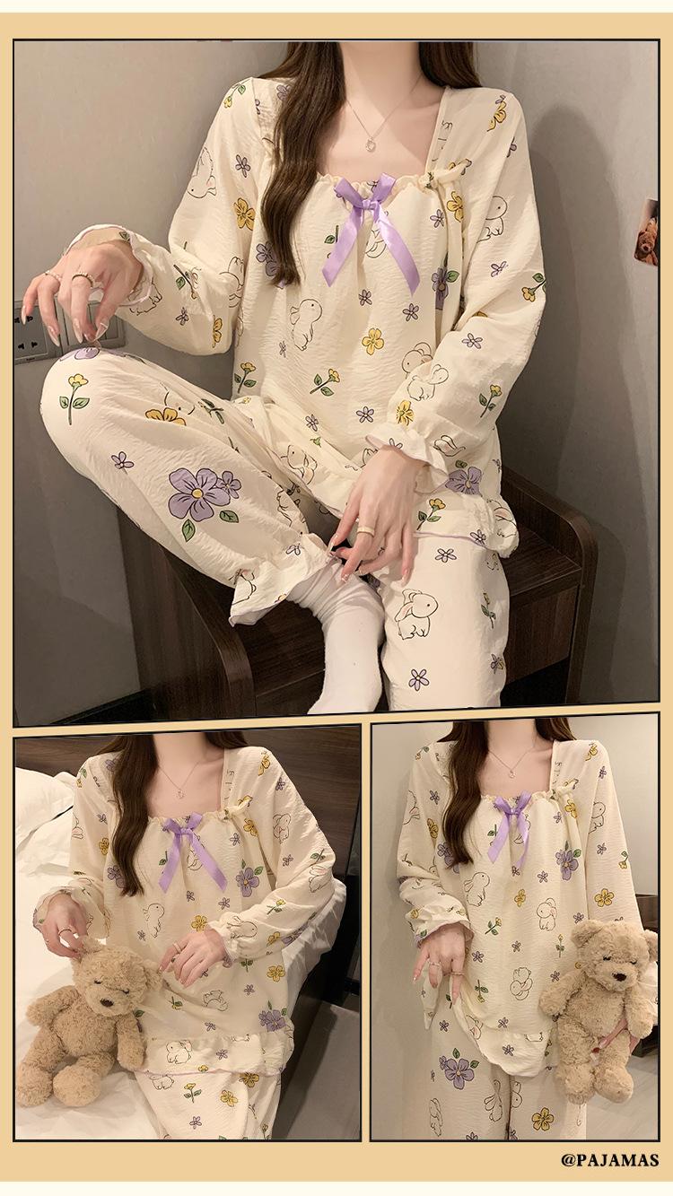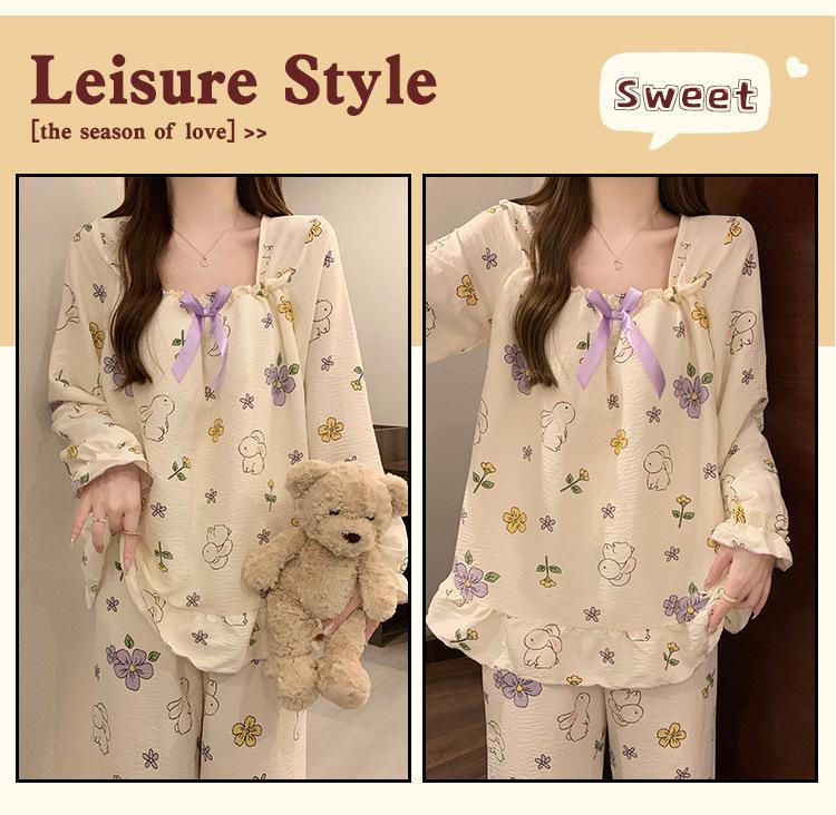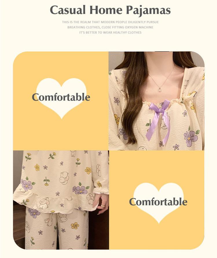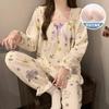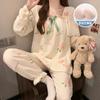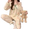 Pijama con almohadilla para el pecho para mujer, de algodón nube, primavera y otoño, pantalones de manga larga, bonito y dulce traje de ropa para el hogar, cuello cuadrado con lazo