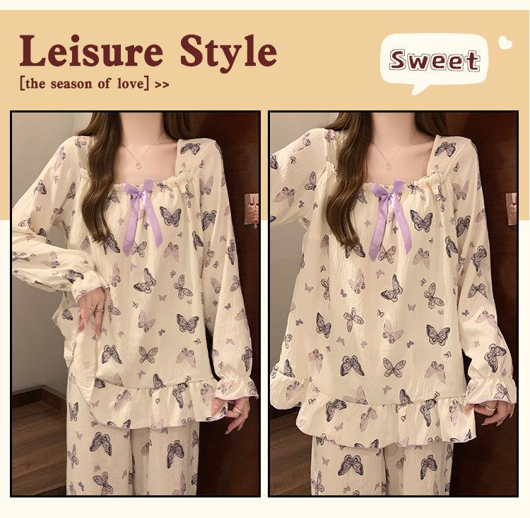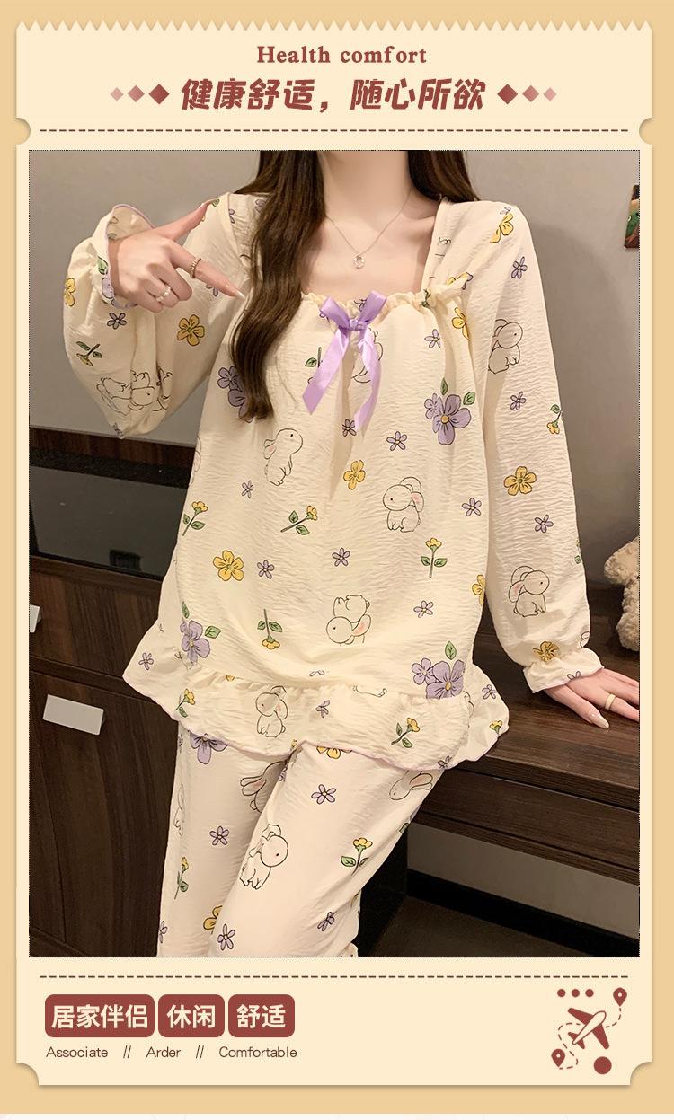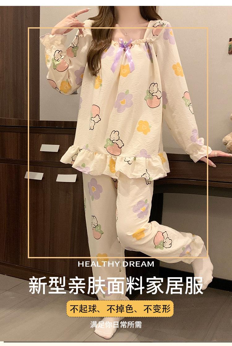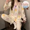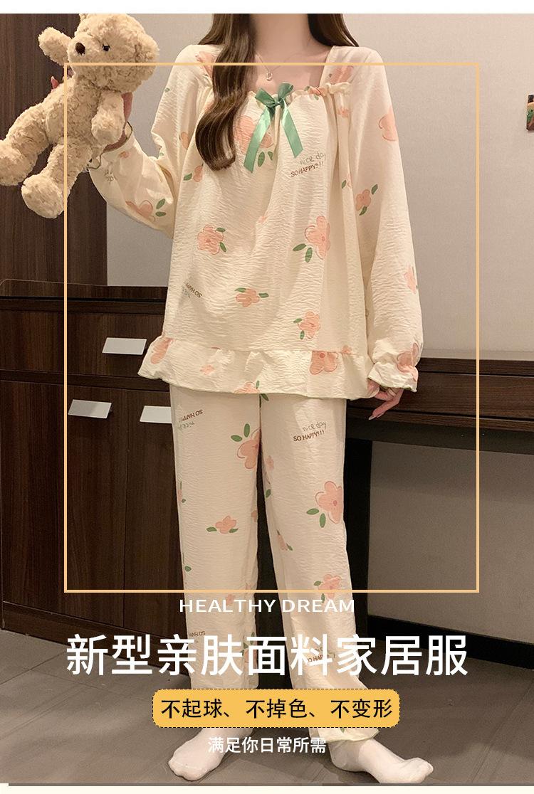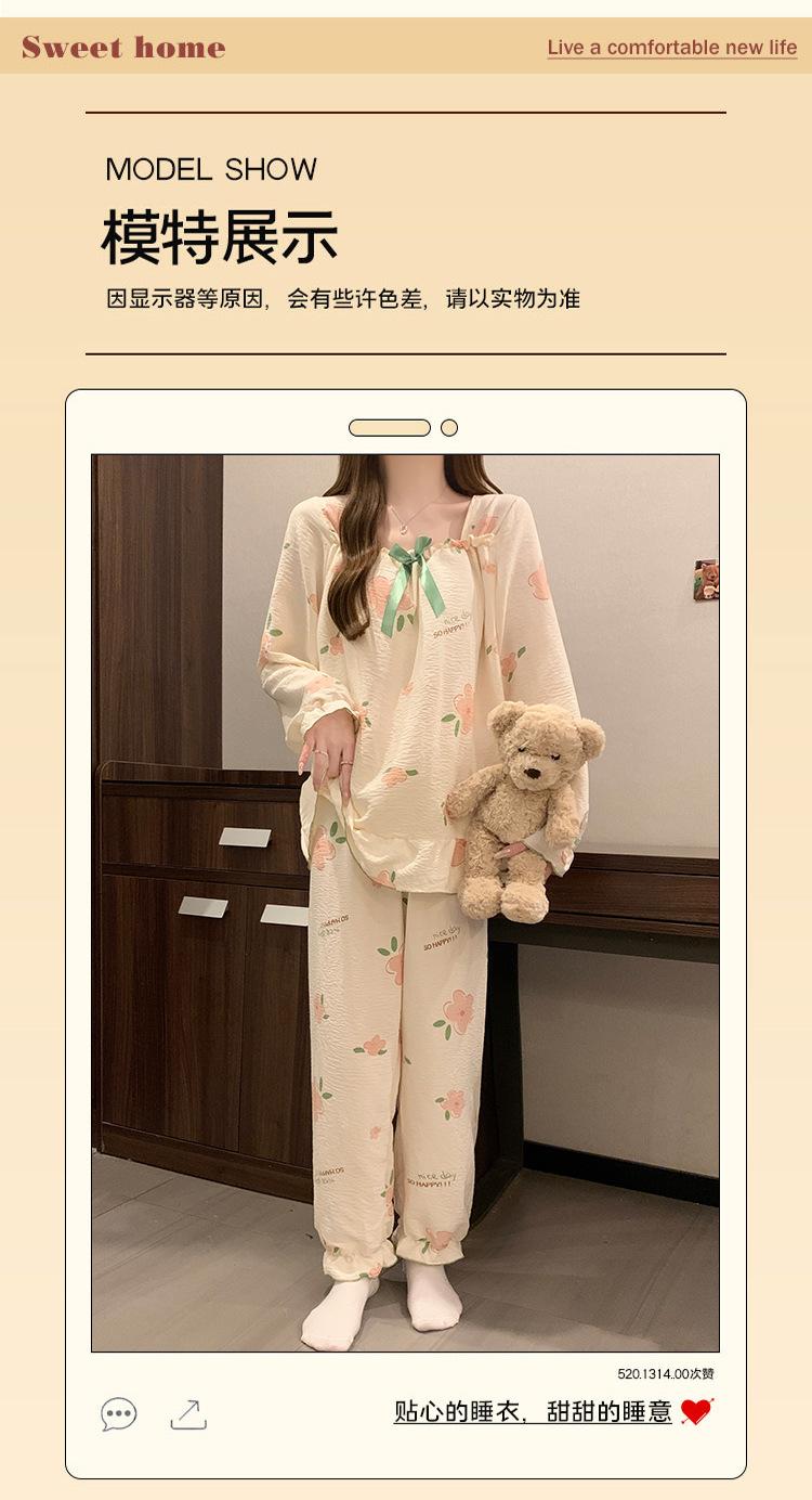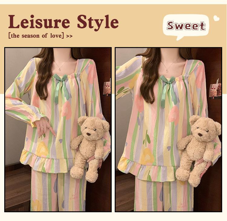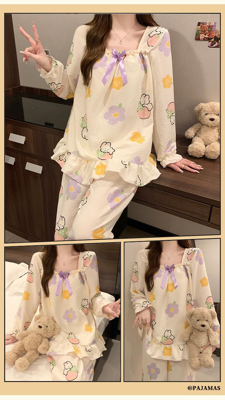 Pijama con almohadilla para el pecho para mujer, de algodón nube, primavera y otoño, pantalones de manga larga, bonito y dulce traje de ropa para el hogar, cuello cuadrado con lazo