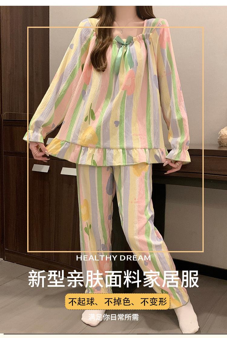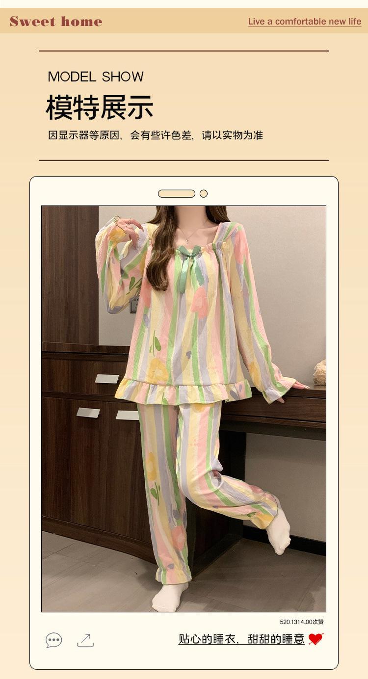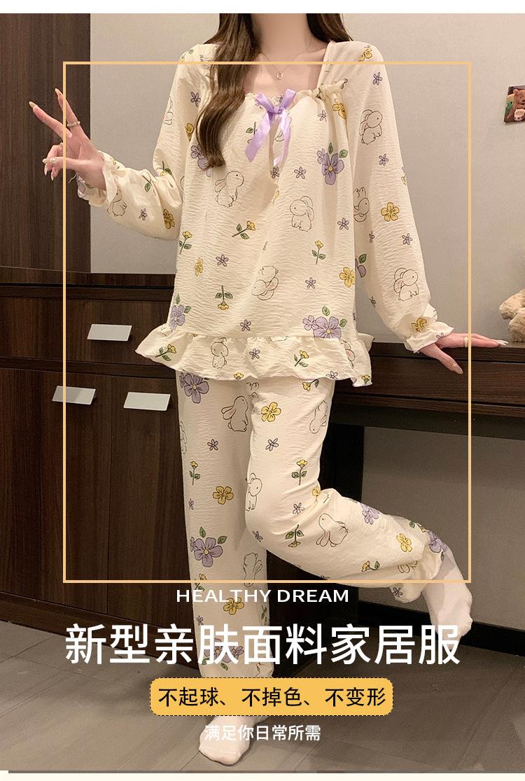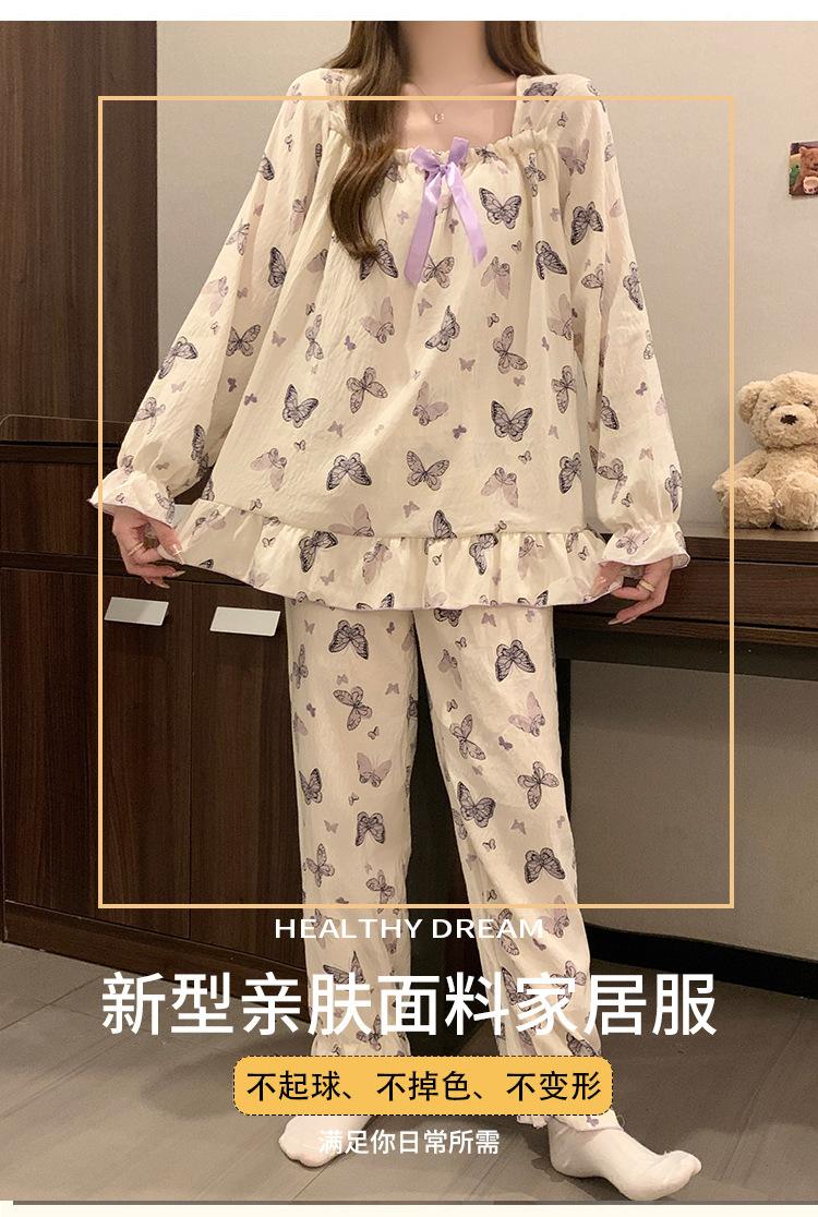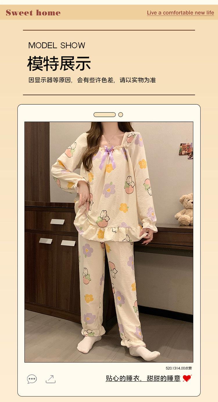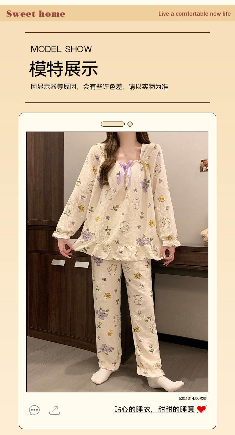 Pijama con almohadilla para el pecho para mujer, de algodón nube, primavera y otoño, pantalones de manga larga, bonito y dulce traje de ropa para el hogar, cuello cuadrado con lazo