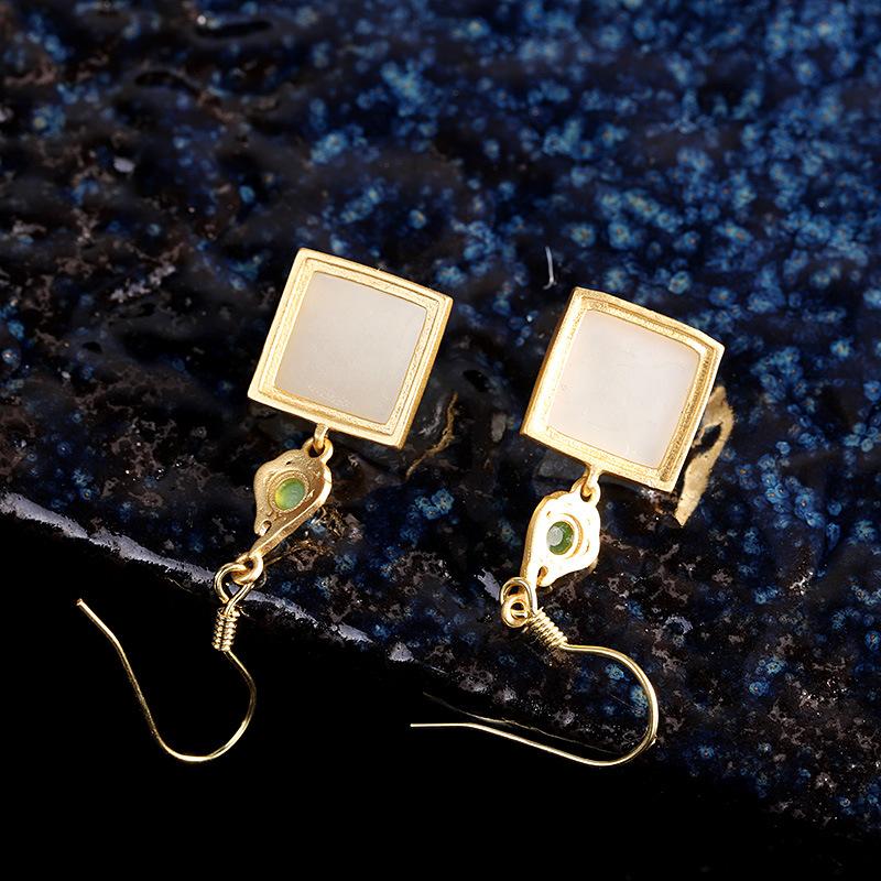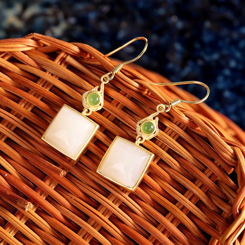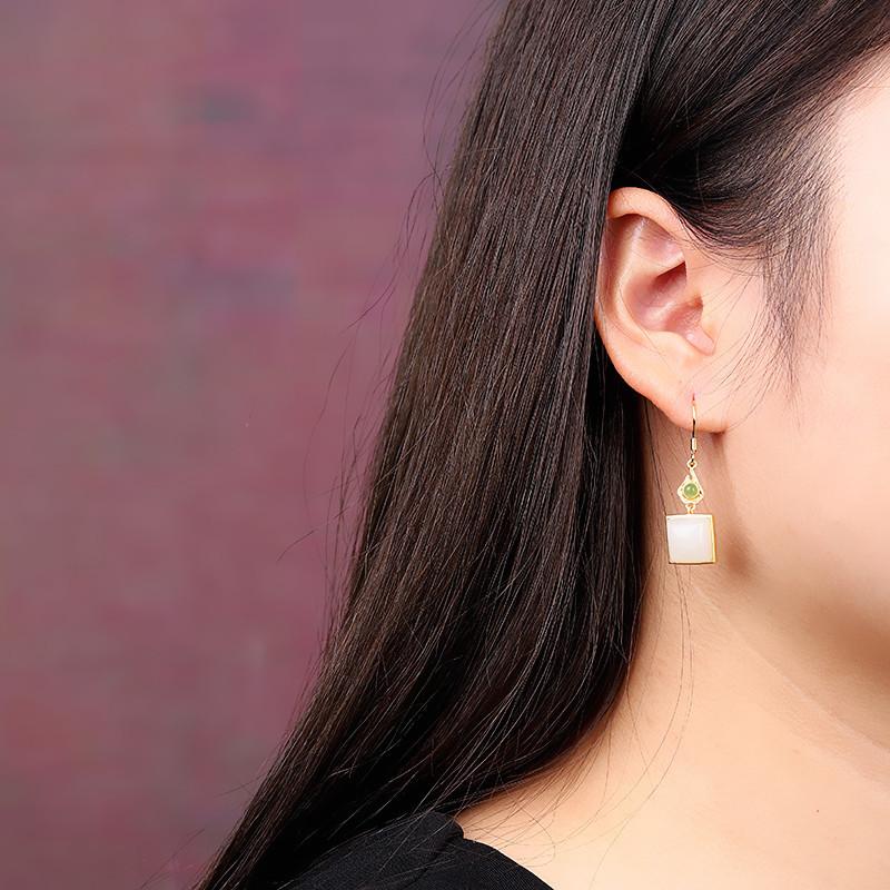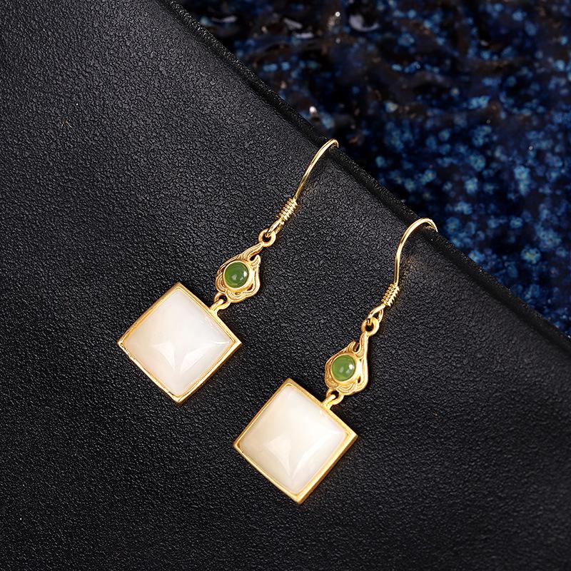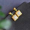 Pendientes cuadrados de moda, joyería de plata s925 para mujer, chapados en oro, con incrustaciones de jade blanco Hotan, elegantes y generosos.