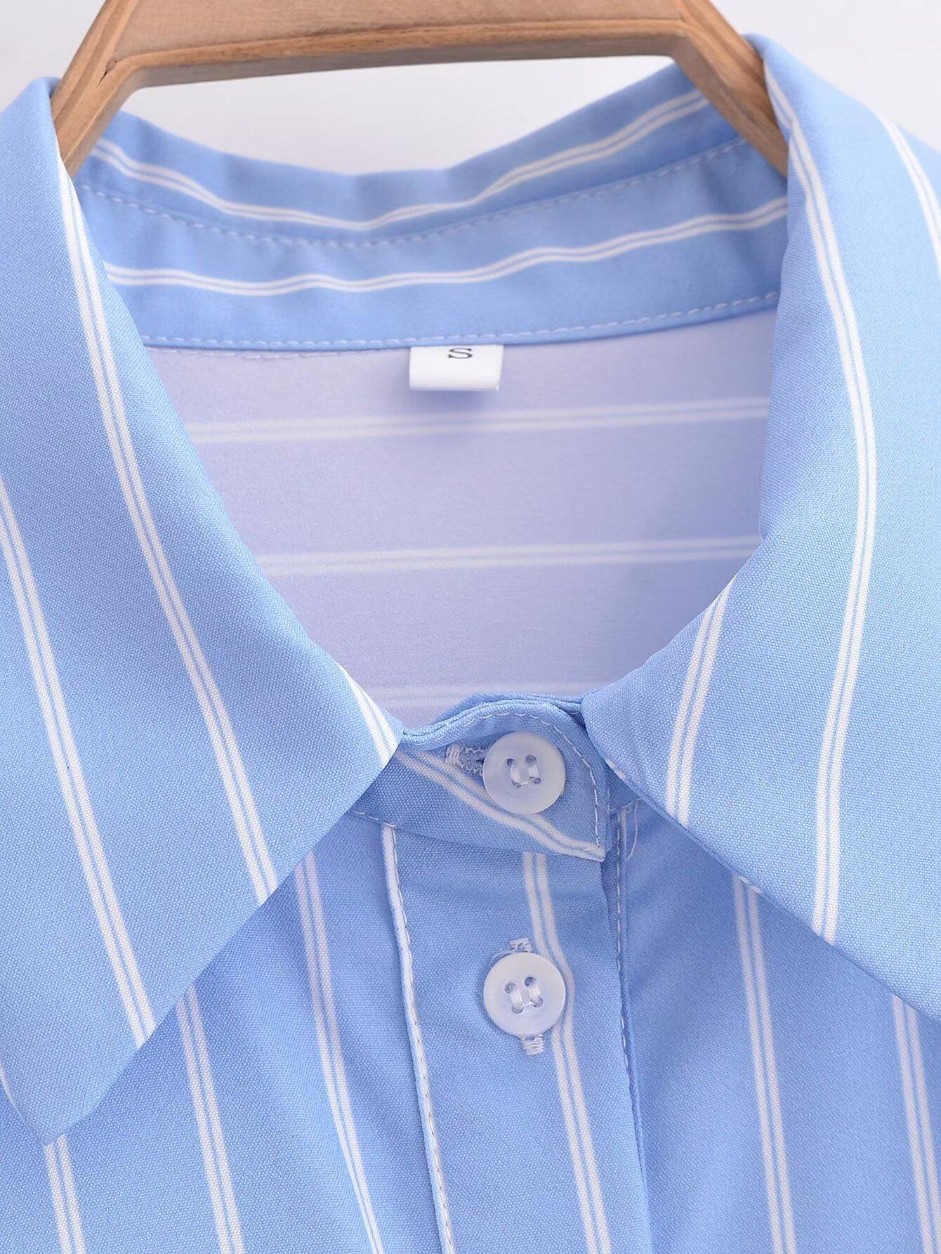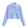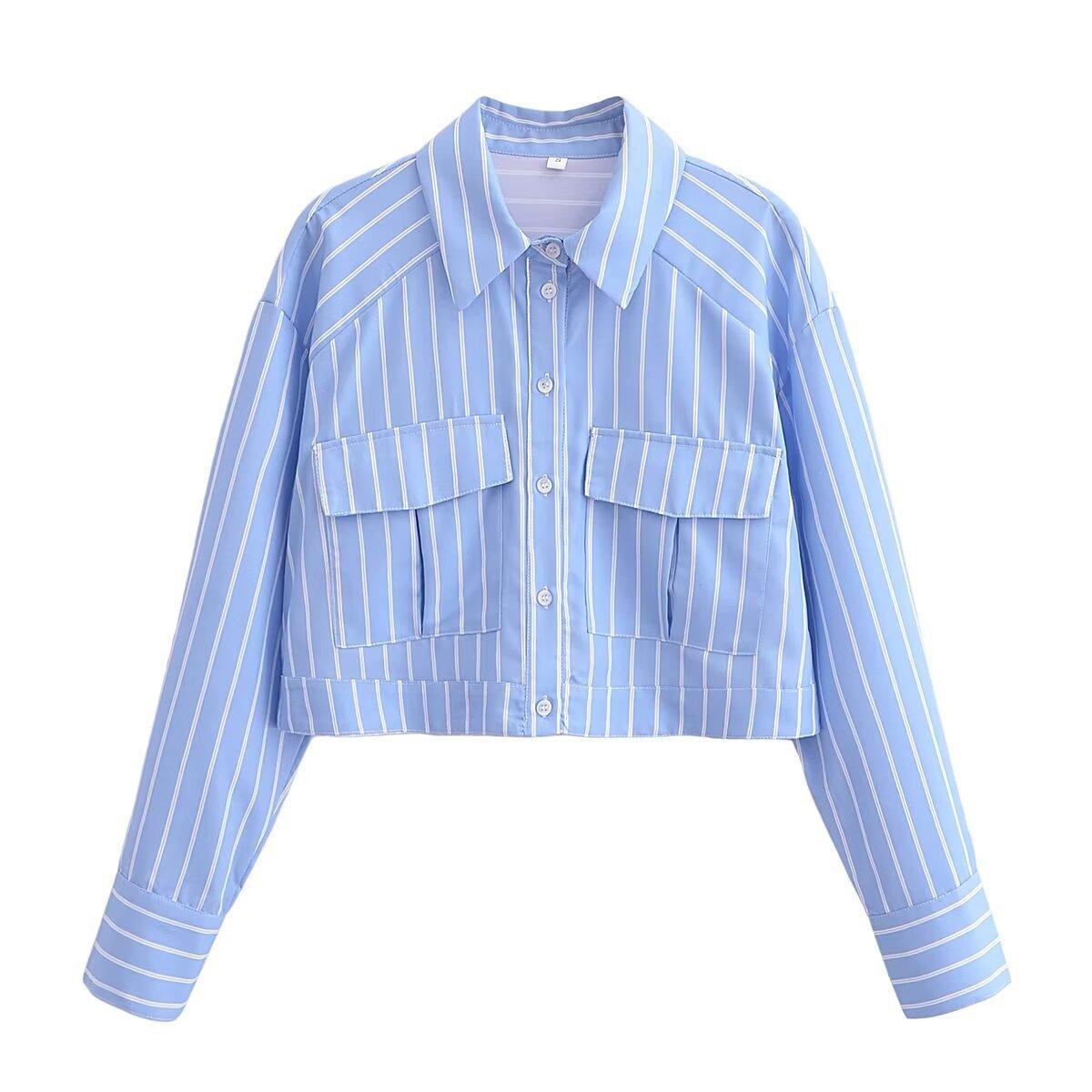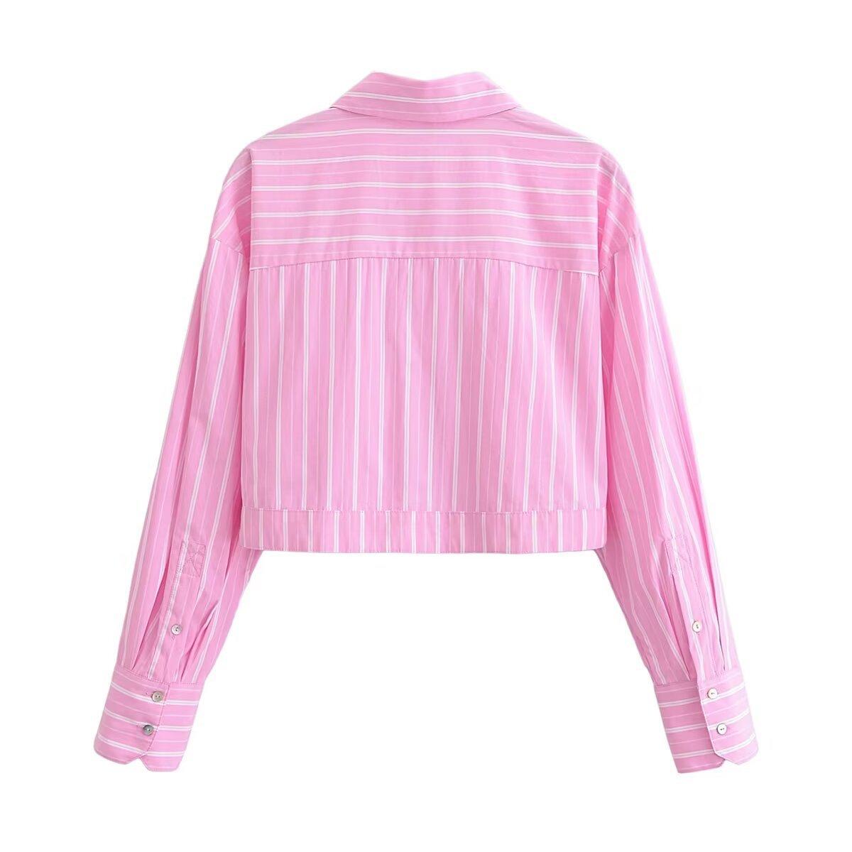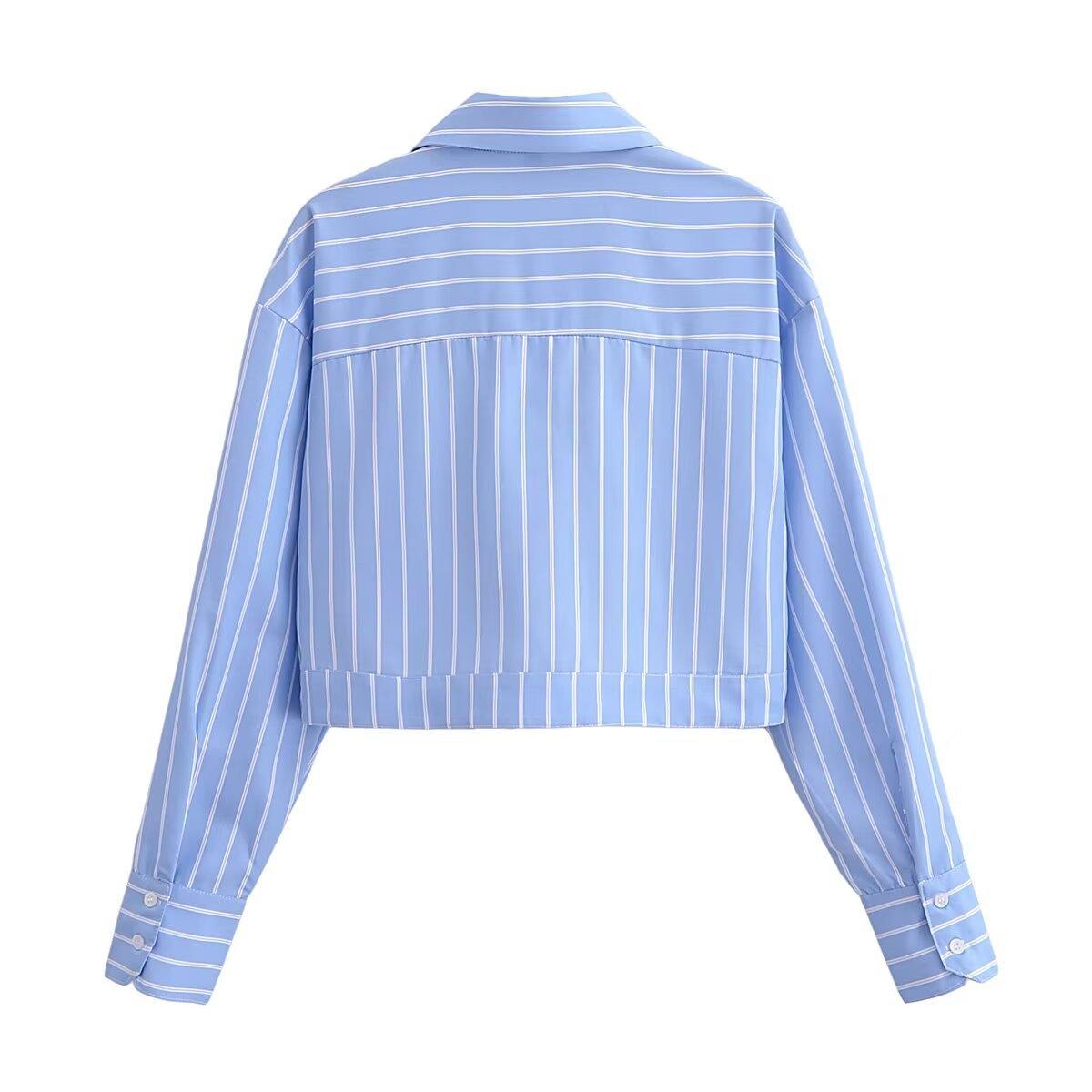 Camisa de manga larga de popelina corta a rayas con solapa personalizada para mujer, estilo transfronterizo europeo y americano, primavera y verano 2024